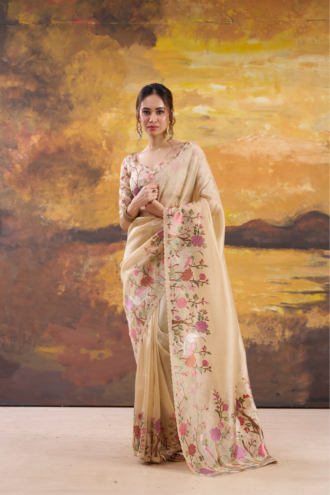 Cream Embroidered Tissue Saree