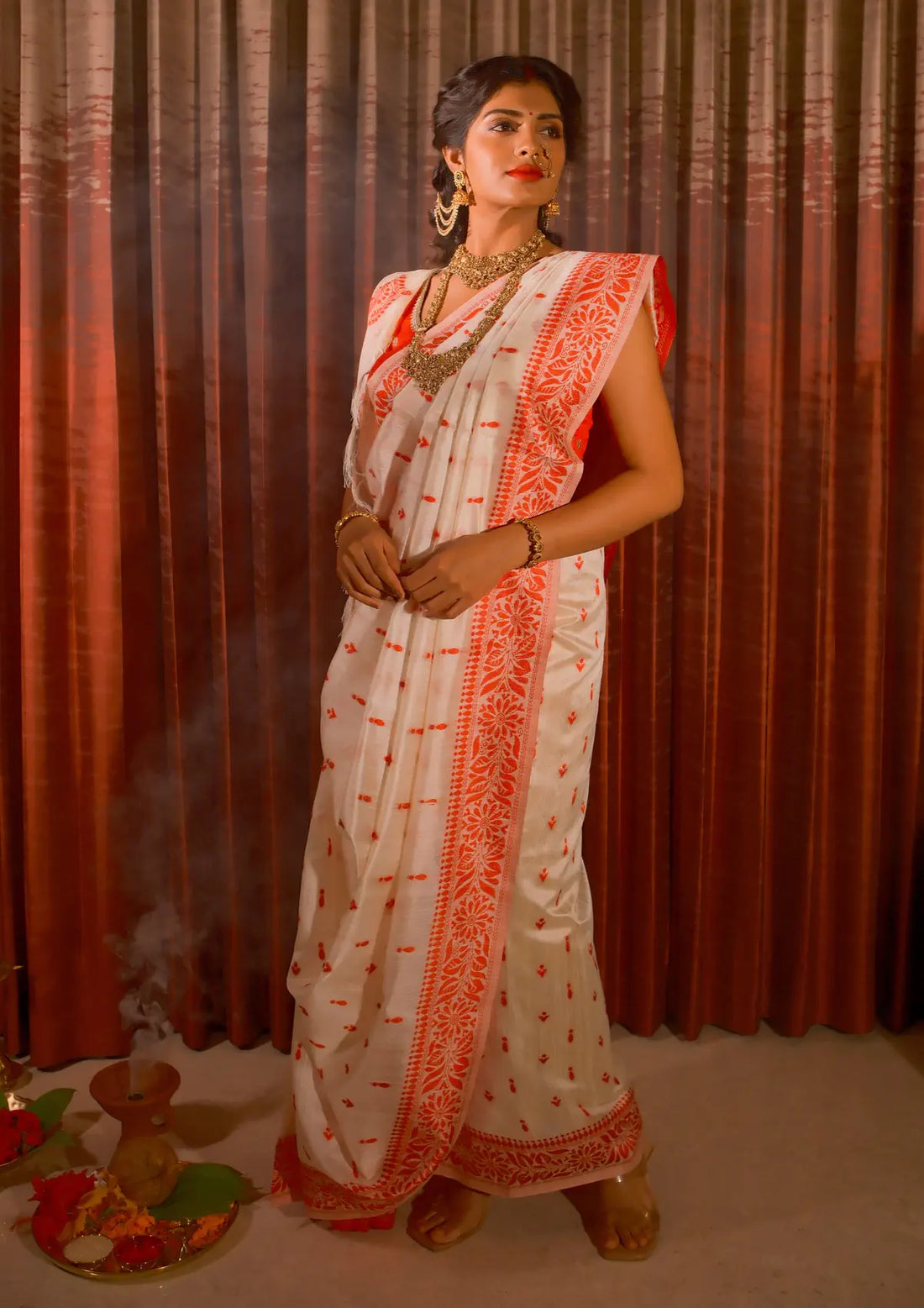 Red And Cream Traditional Bengoli Woven Tussar Saree