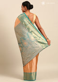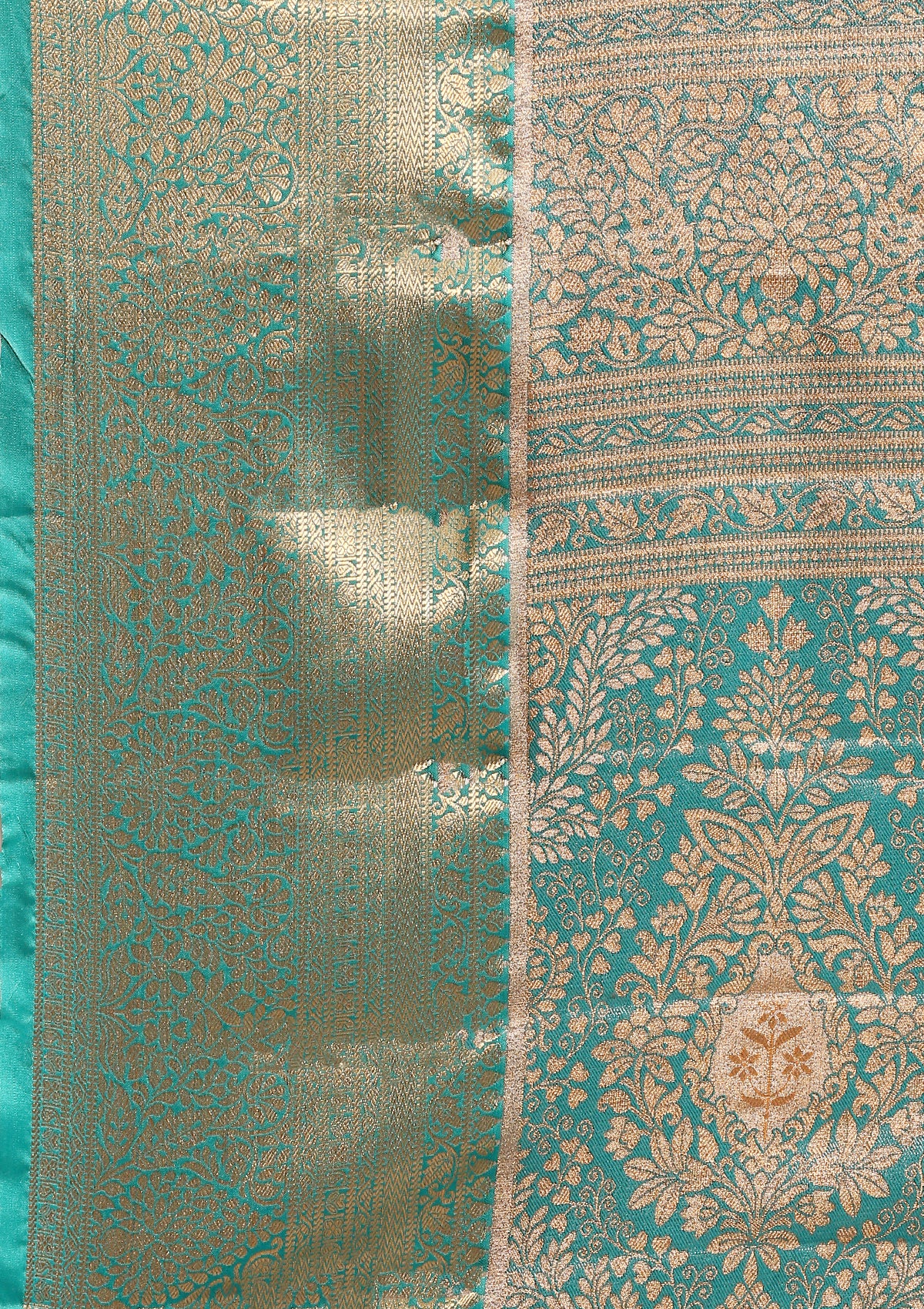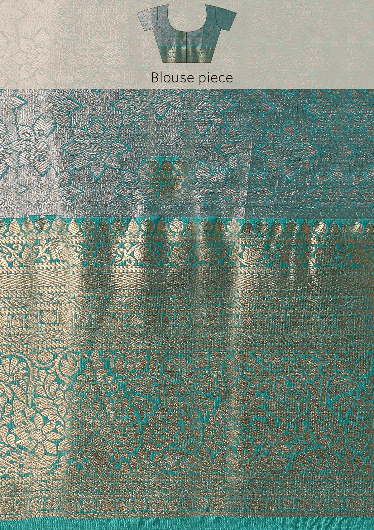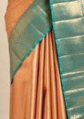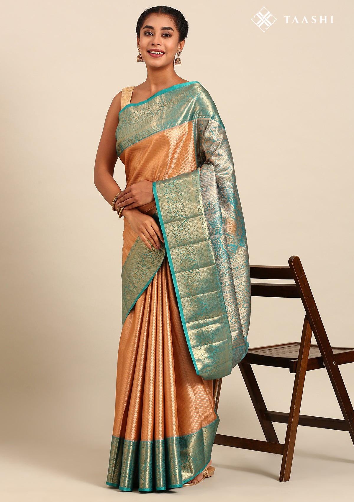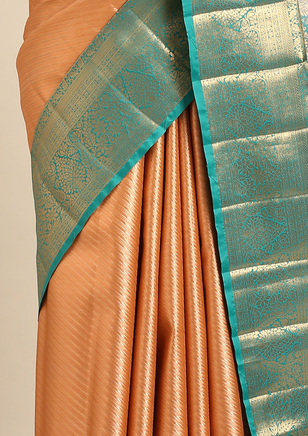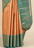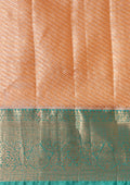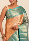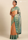 Step into elegance with the Amber Golden and Teal Kanchipuram Saree, crafted from premium polyester blended fabric that drapes gracefully and feels luxurious. This saree blends warm amber golden hues with vibrant teal accents for a stunning traditional look.