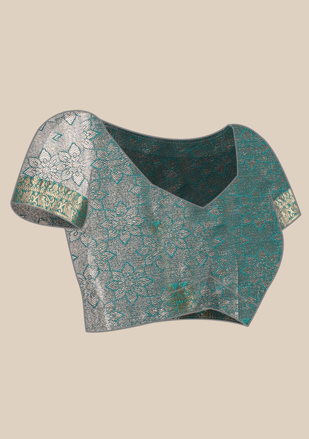 - Paired with a floral blouse that beautifully complements the saree's color combination