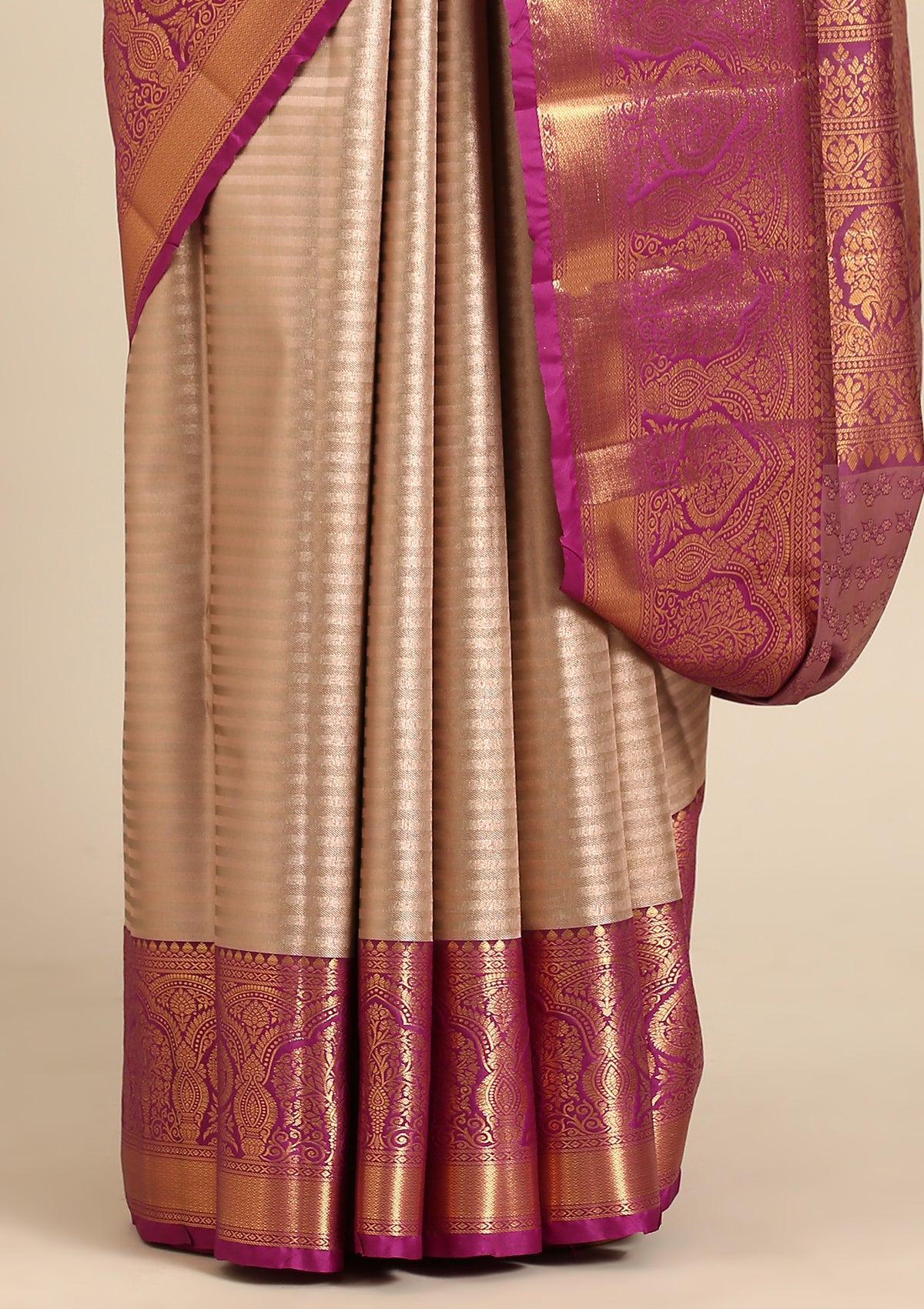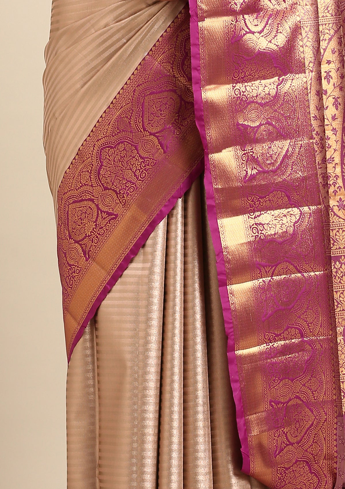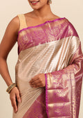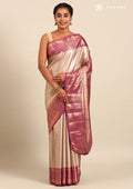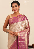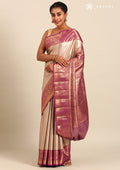 Exude regal elegance with the Golden and Purple Kanchipuram Saree, woven from premium polyester blended fabric that drapes beautifully and offers lasting comfort. This saree combines radiant golden tones with deep purple accents for a majestic traditional look.