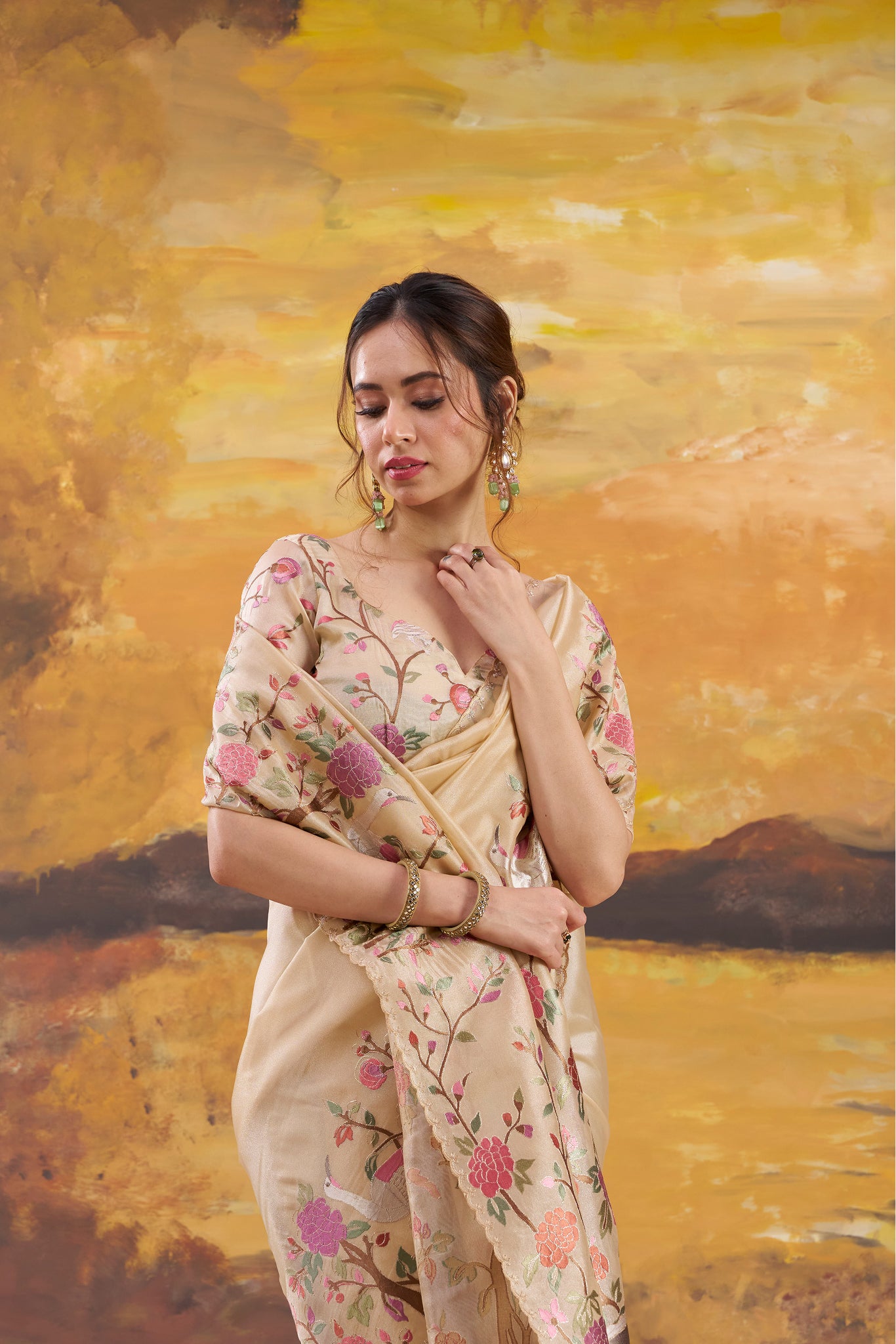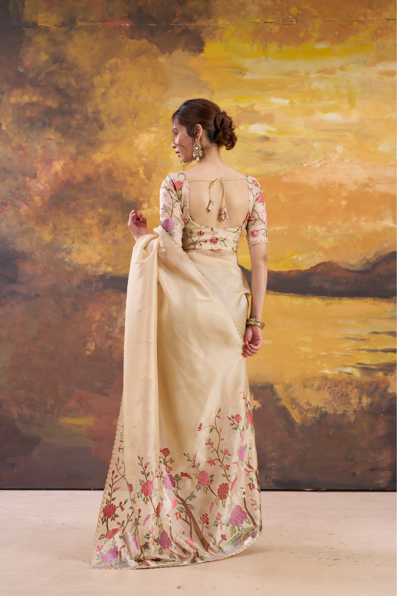 Crafted in a soft cream hue, this tissue saree embodies refined elegance with a subtle festive charm.