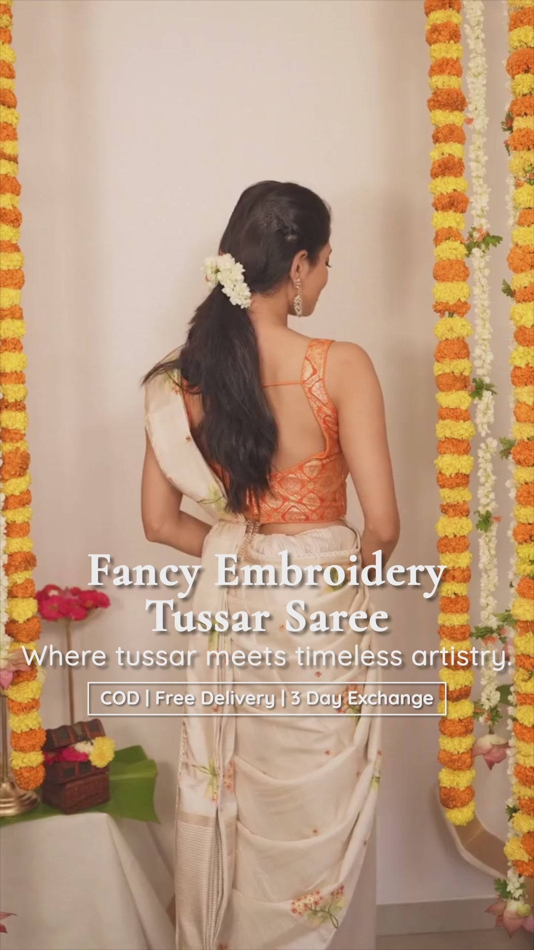 | Cream Polyester Blended Tussar Saree This elegant cream polyester blended tussar saree features a 1-inch zari border with lace, adding a refined and delicate finish. The body is beautifully adorned with colorful floral embroidery, bringing a lively and artistic touch to the design. The stripe-woven pallu adds texture and contrast, perfectly matched with a stripe-woven blouse to complete the ensemble. A perfect blend of traditional craftsmanship and vibrant detailing — ideal for festive and special occasions. |