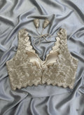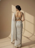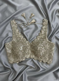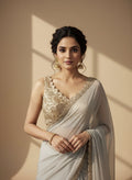 A refined cream satin blouse embellished with delicate floral beadwork that adds subtle sparkle and charm. The neckline and waistline feature elegant zigzag detailing, lending a modern touch to this timeless piece. Perfect for festive celebrations or elegant gatherings, this blouse brings effortless grace and a gentle sheen to your look.