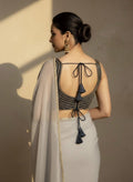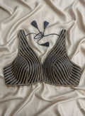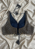 A refined dark blue-grey blouse adorned with intricate gold/black embellishments that add a subtle festive glow. Delicate tassel accents bring charm and movement, completing the look with effortless grace.