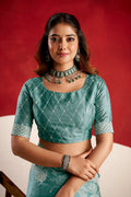 The body is adorned with intricate floral butta embroidery, while the pallu showcases beautiful peacock motifs highlighted with geometric pattern embroidery for a refined contrast.