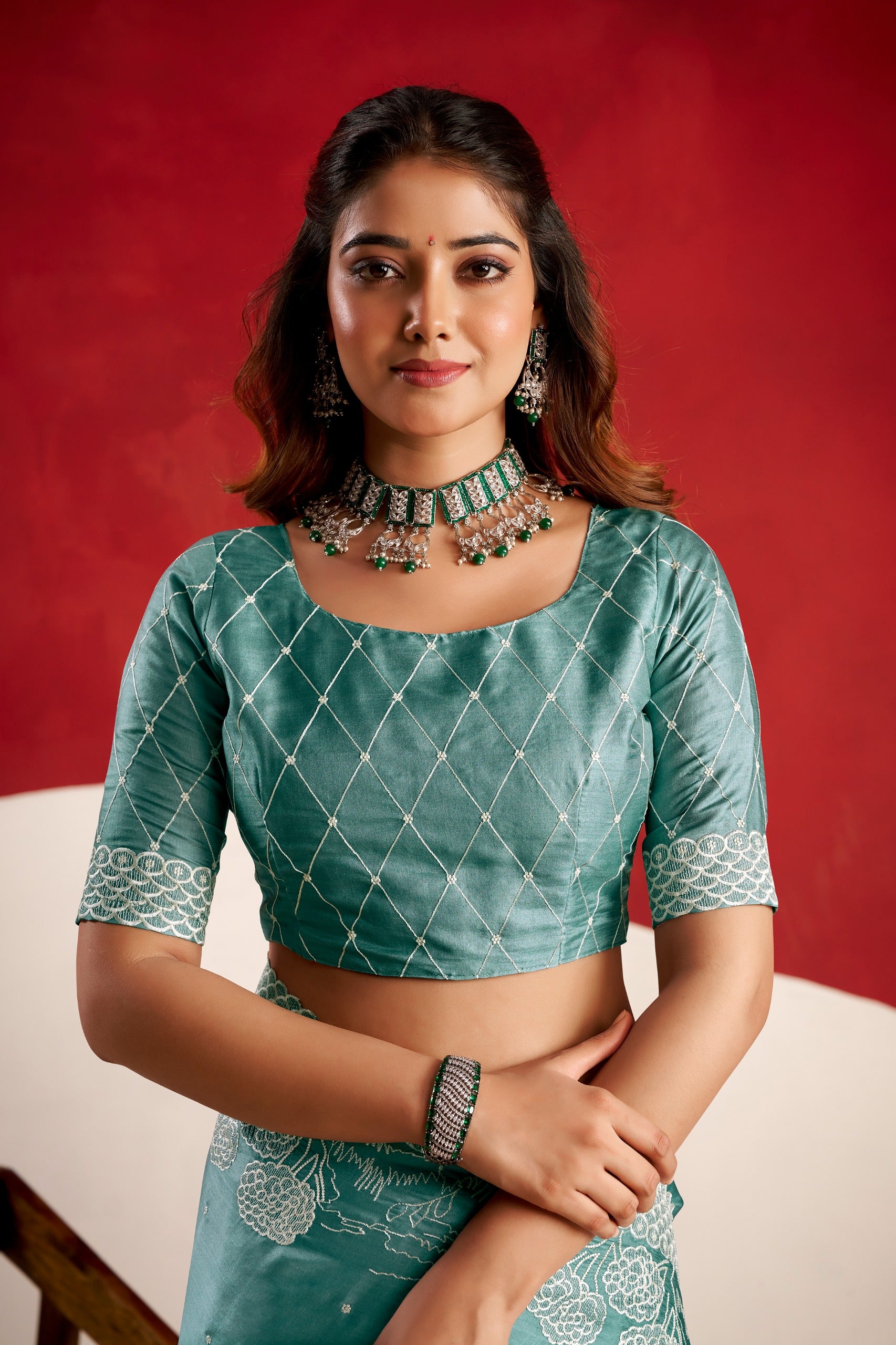 A matching embroidered blouse completes the ensemble, creating a harmonious and stylish look.