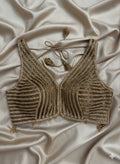 A luxurious gold satin blouse adorned with intricate stone and bead embellishments, adding a radiant festive glow. Delicate tassel accents bring charm and movement, completing the blouse with elegance and sophistication.