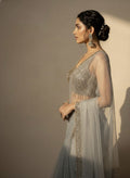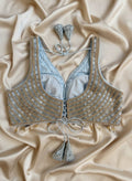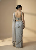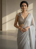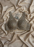 A graceful grey blouse adorned with intricate gold embellishments that bring a subtle festive glow. Delicate tassel accents add charm and movement, completing the look with elegance. Perfect for celebrations and special occasions, wear this blouse to your festivities and shine with understated glamour.