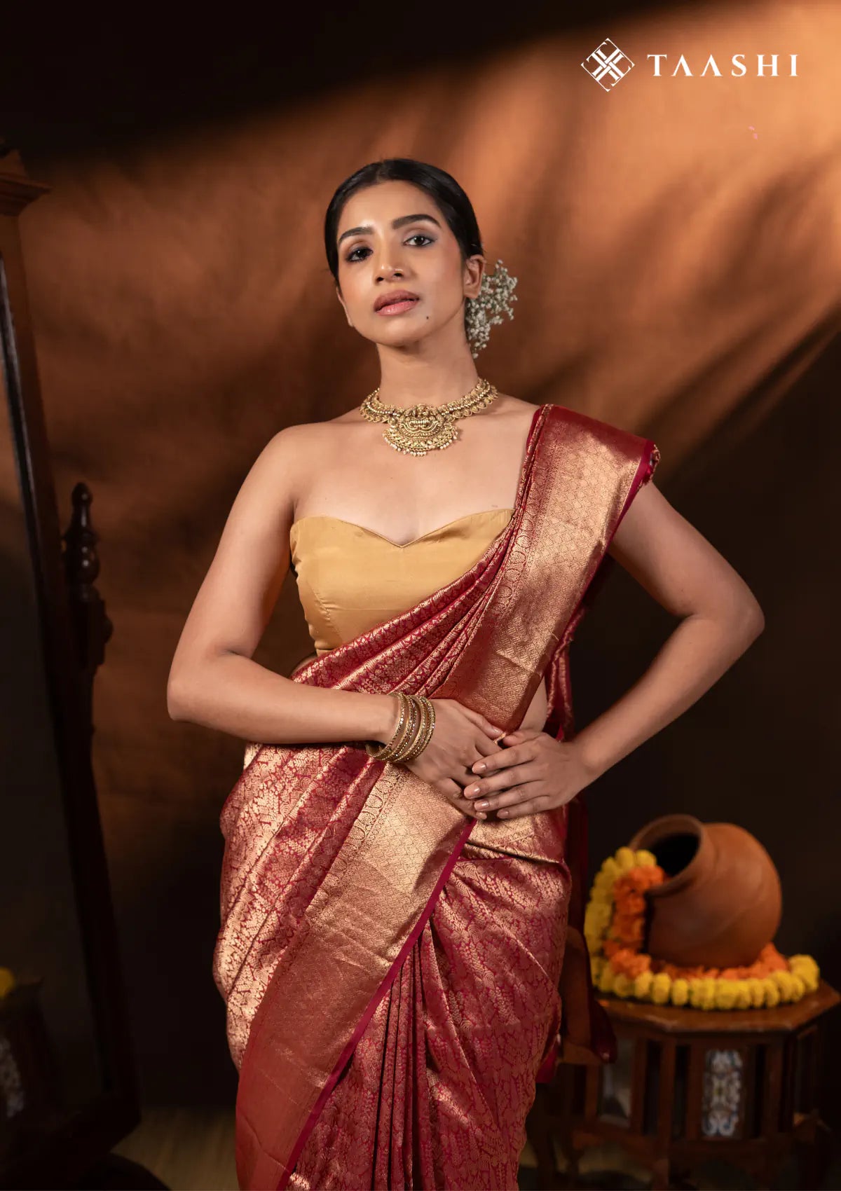 - Crafted from pure Kanchipuram silk, offering a lustrous, elegant drape ideal for weddings, festive events, and formal occasions