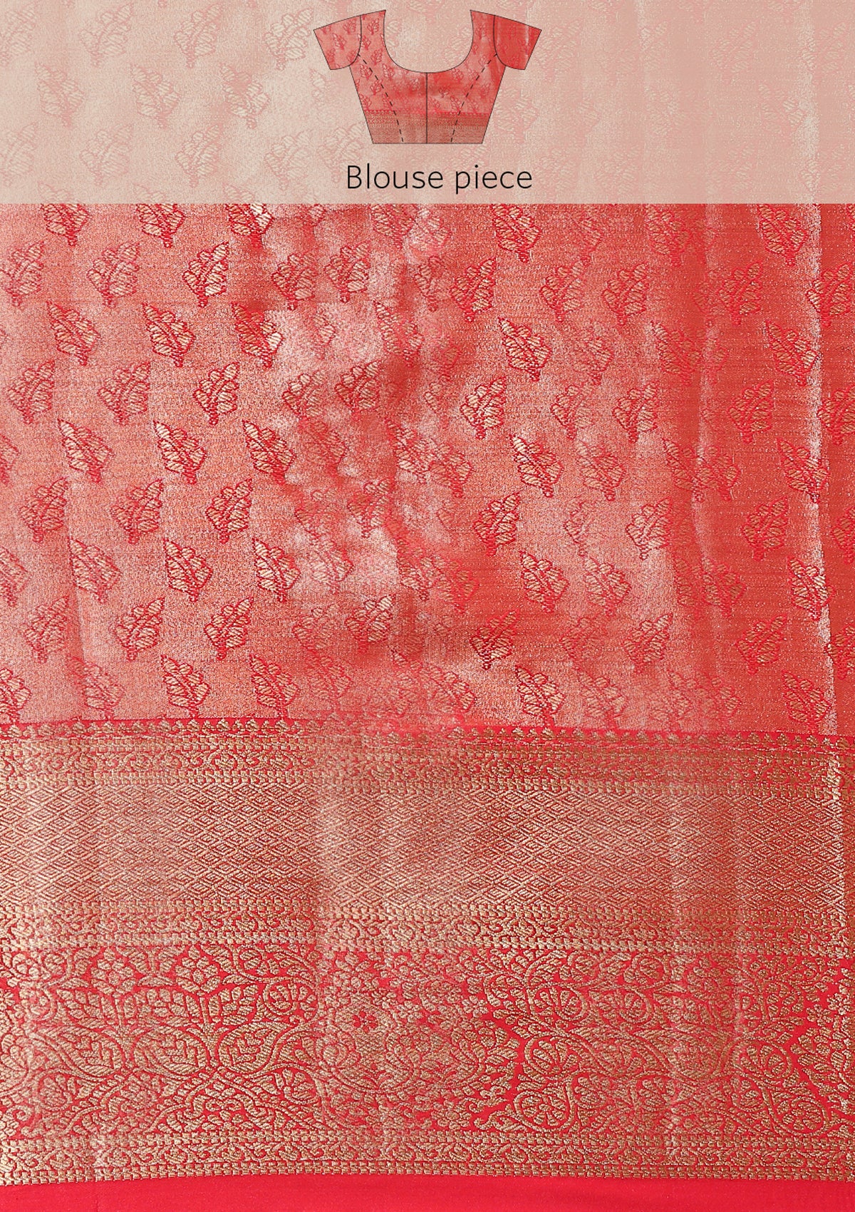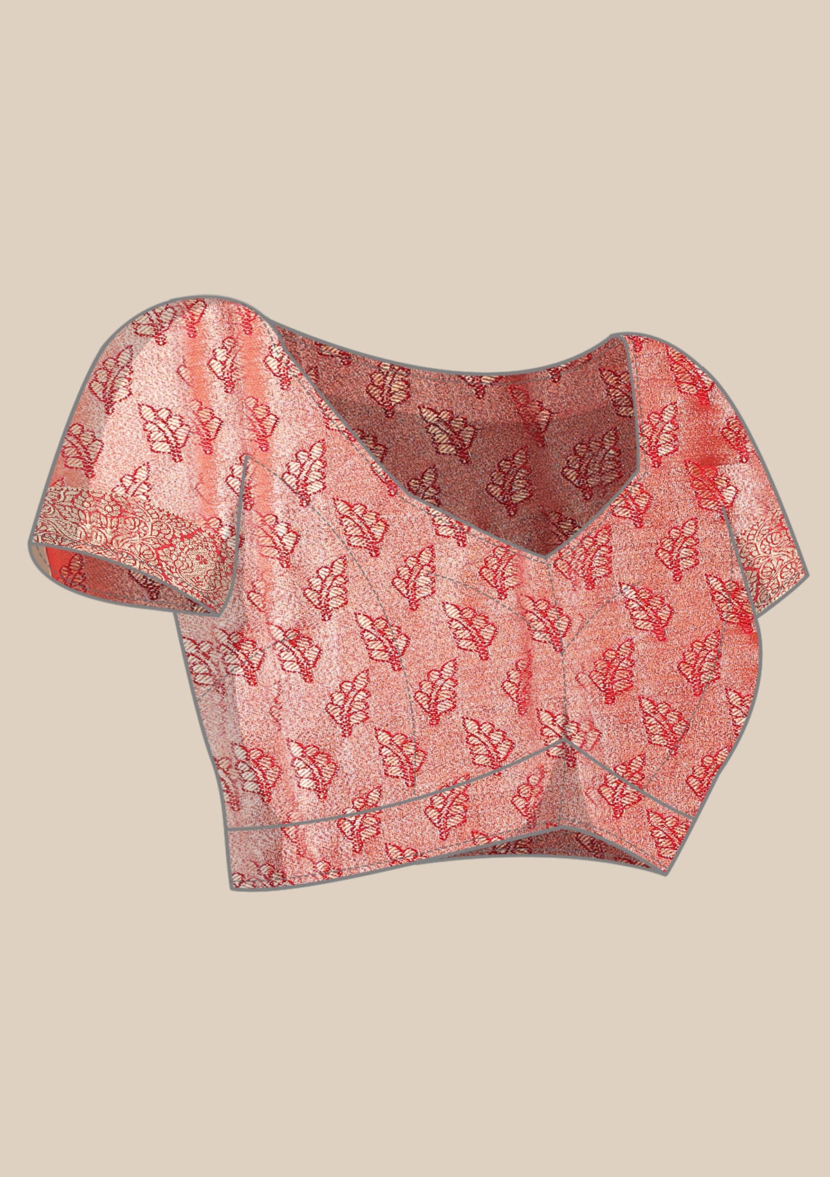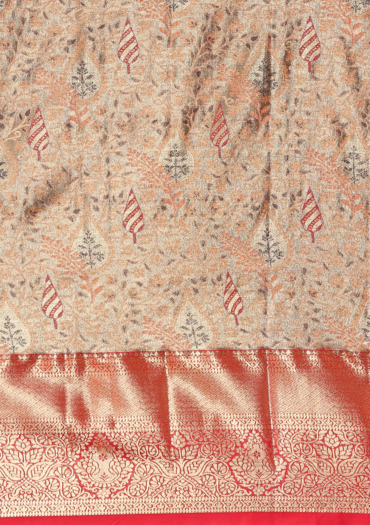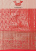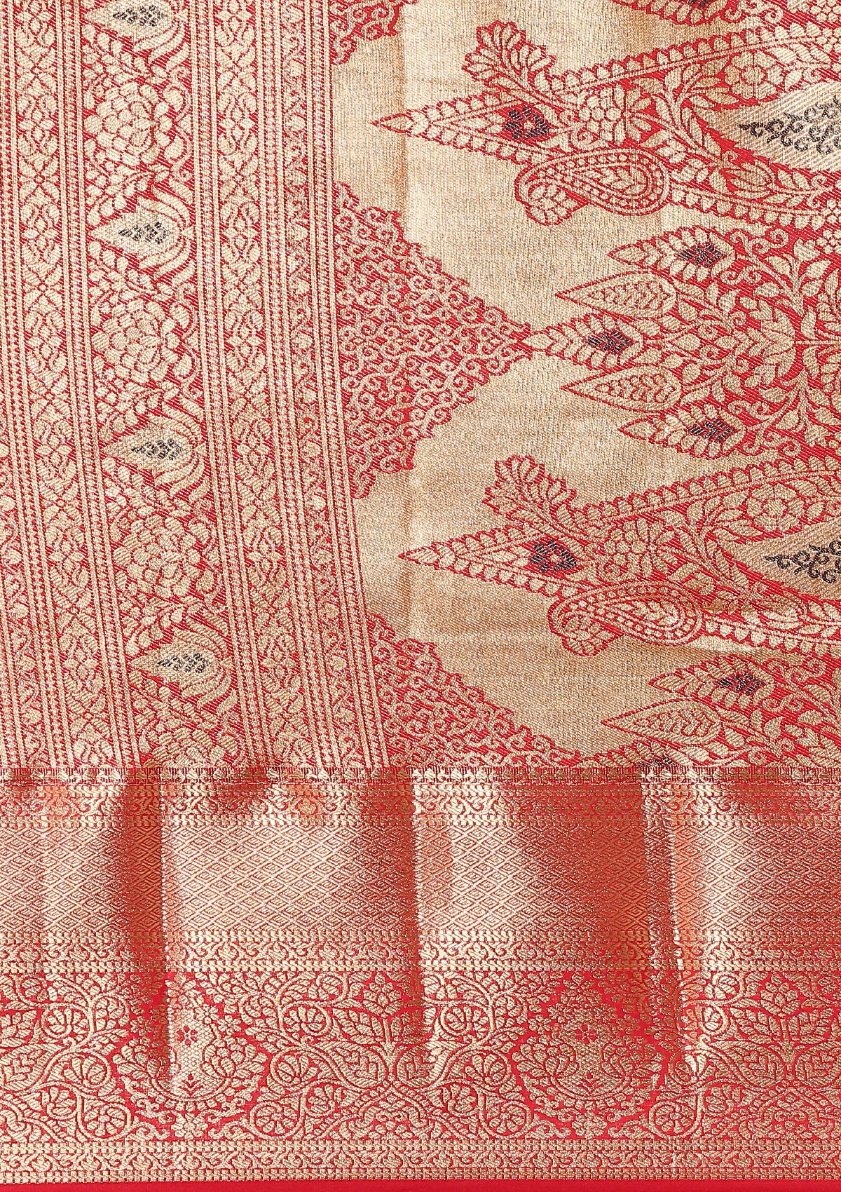- Showcases a bold 6-inch red border that beautifully frames the saree
