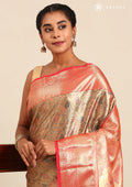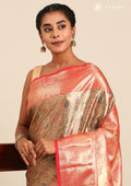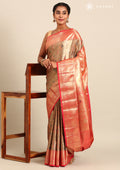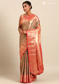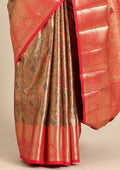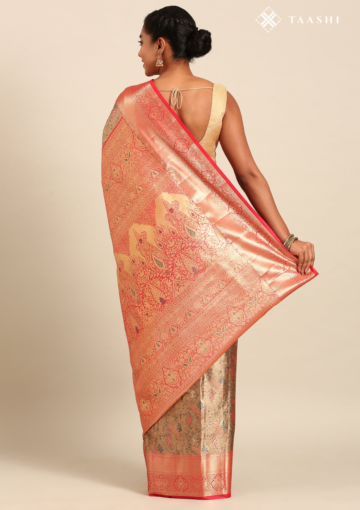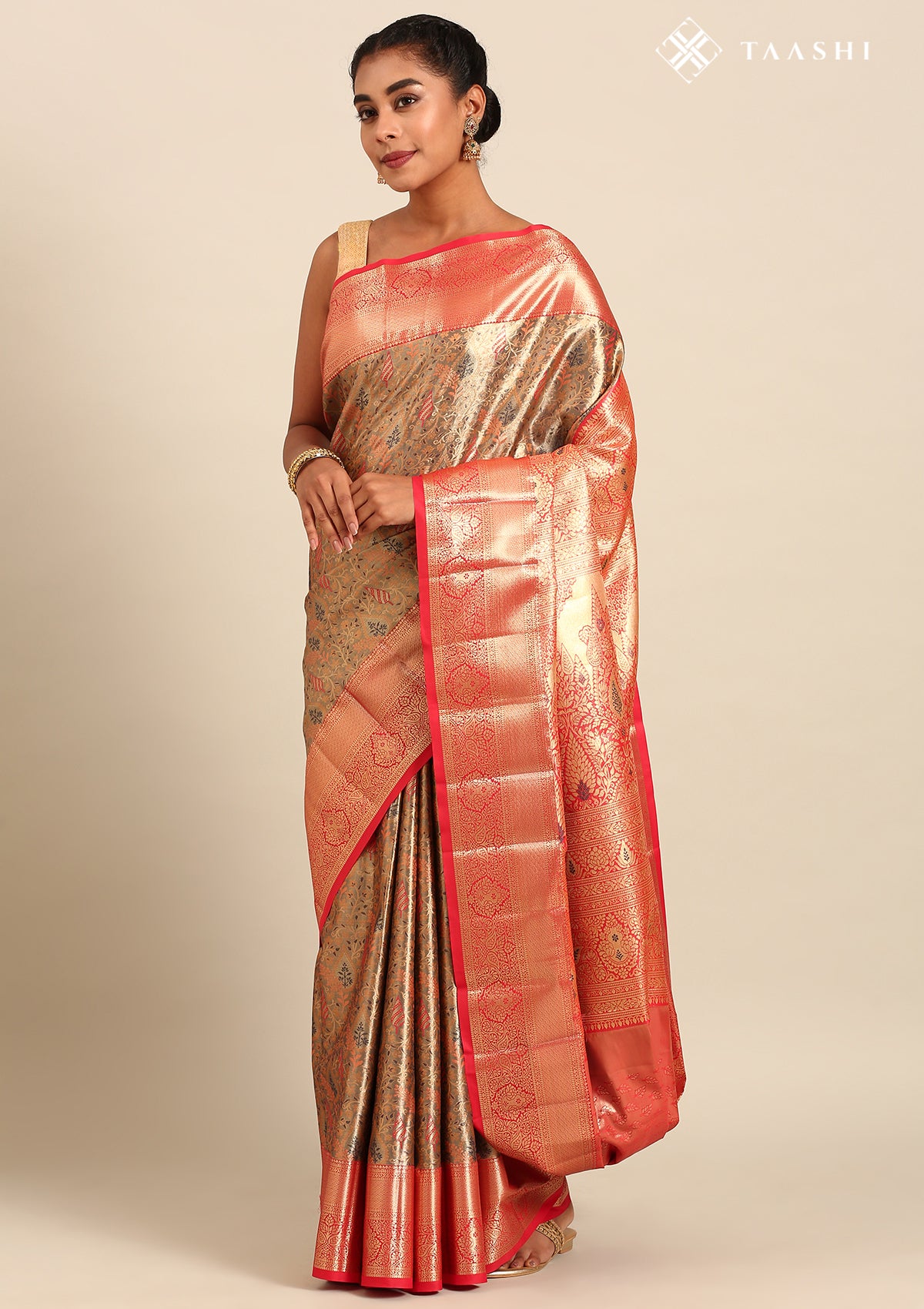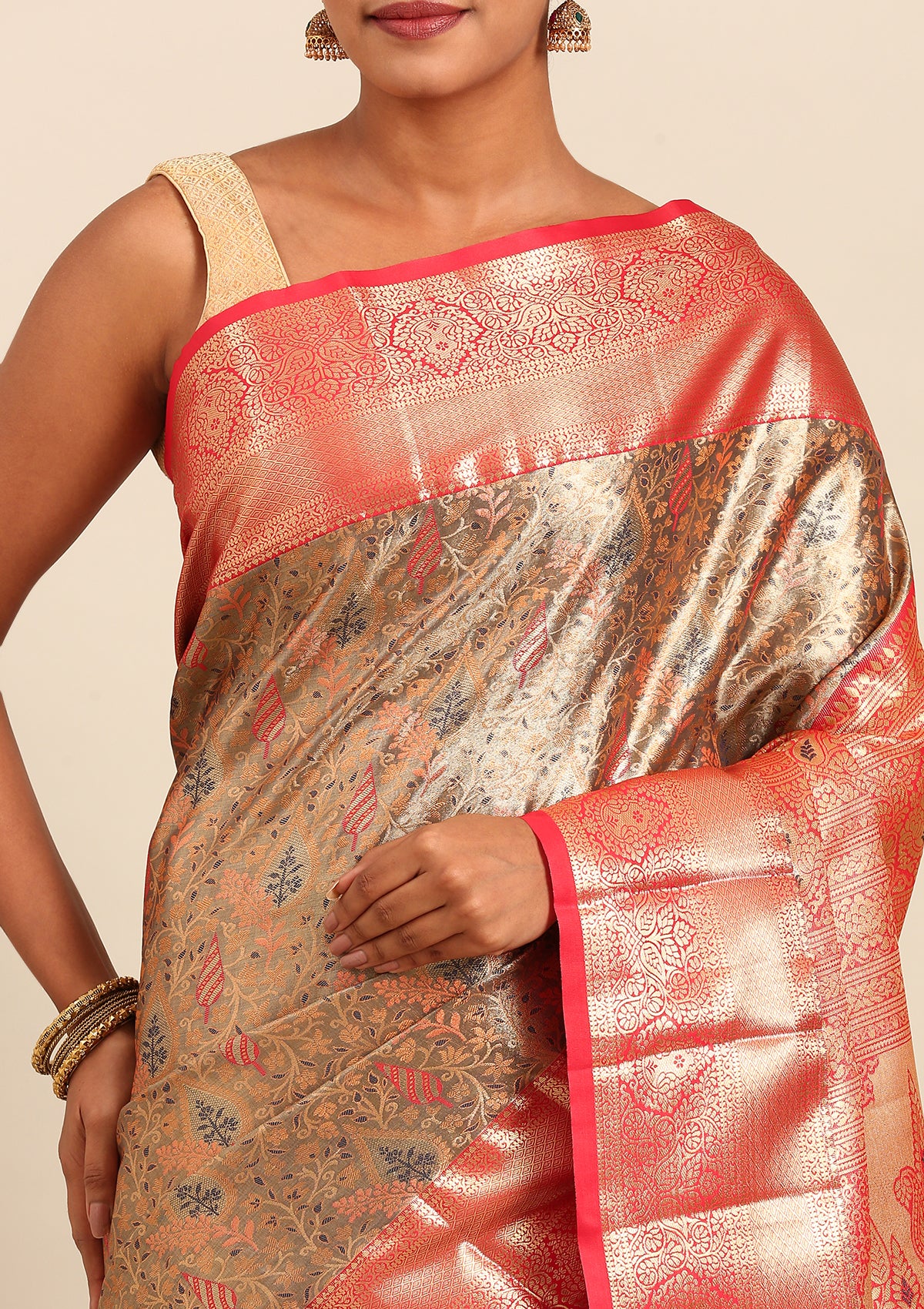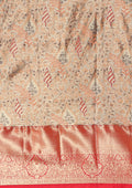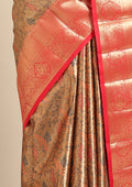- Showcases a bold 6-inch red border that beautifully frames the saree