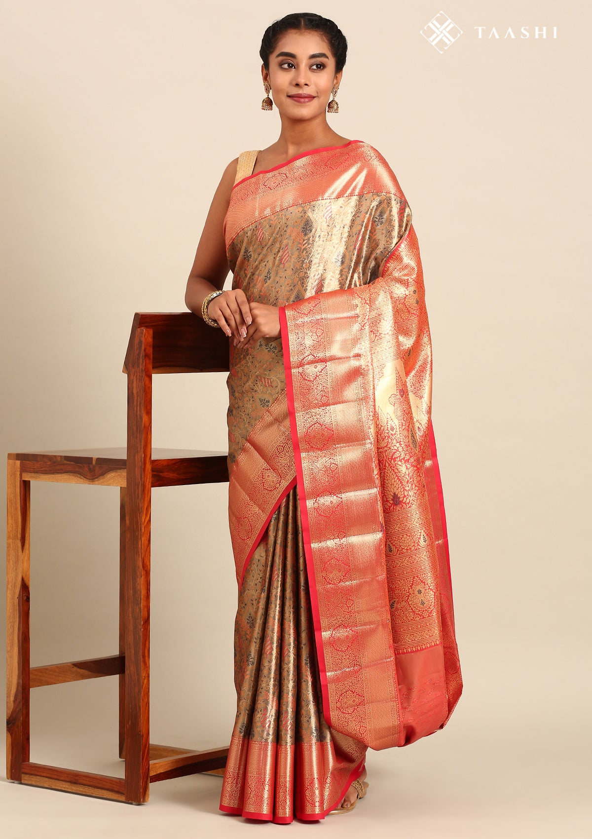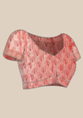 - Paired with a leaf-patterned blouse that complements the saree's design