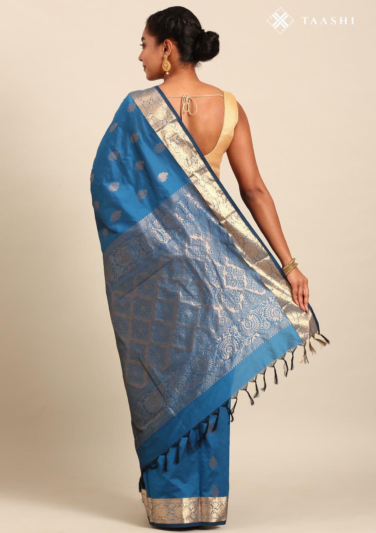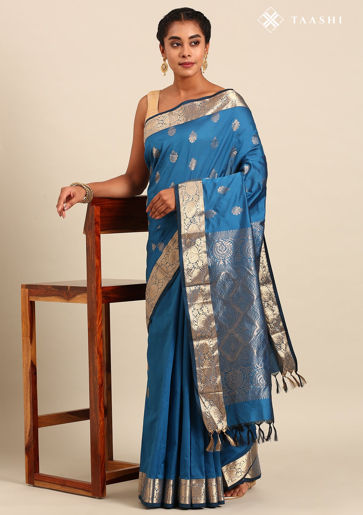 - Paired with a plain blouse finished with a matching border for a cohesive style