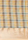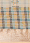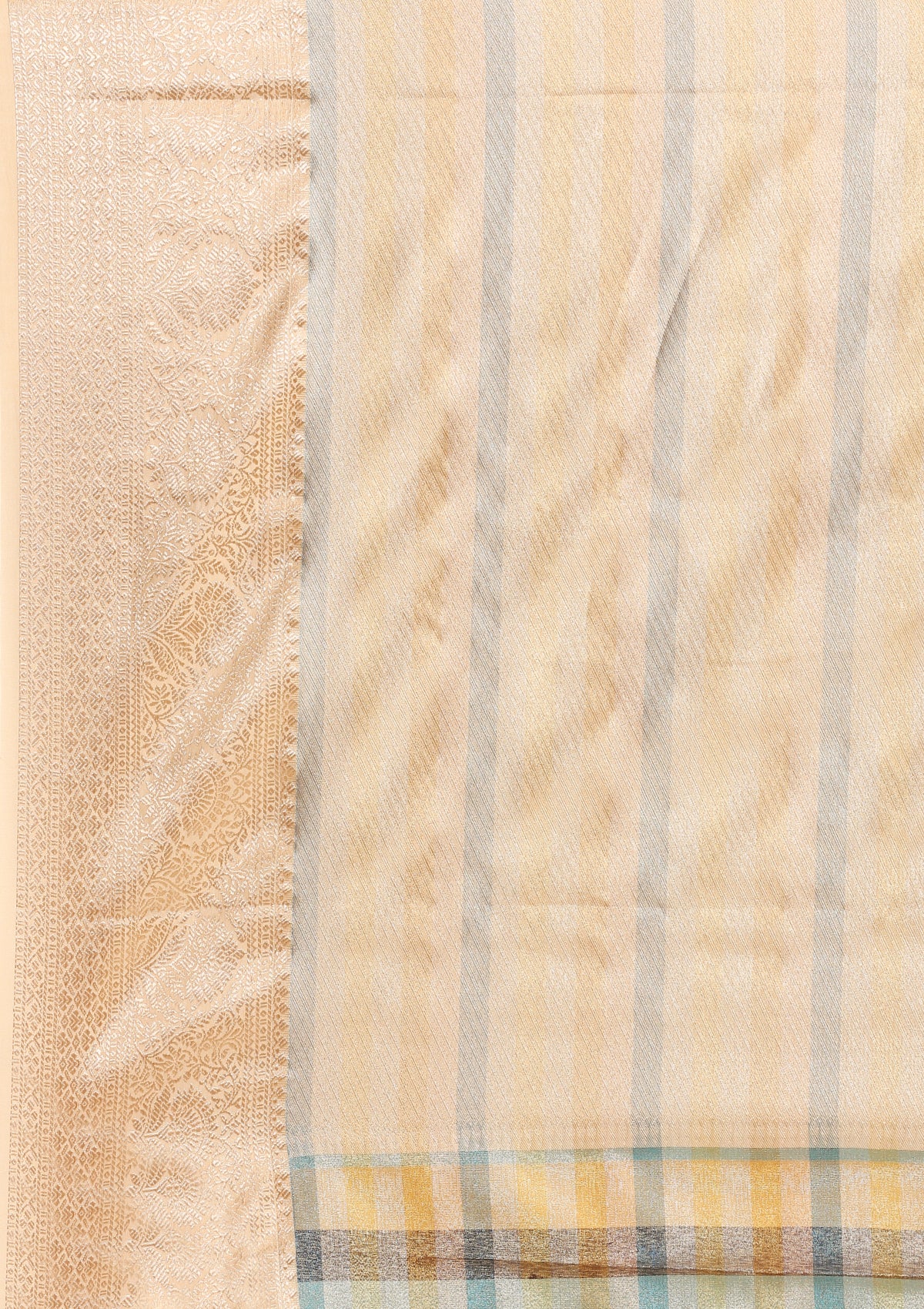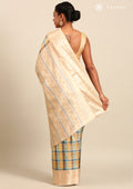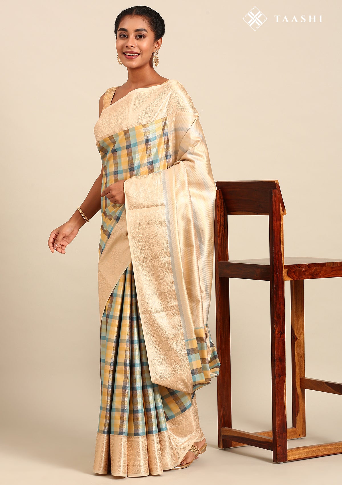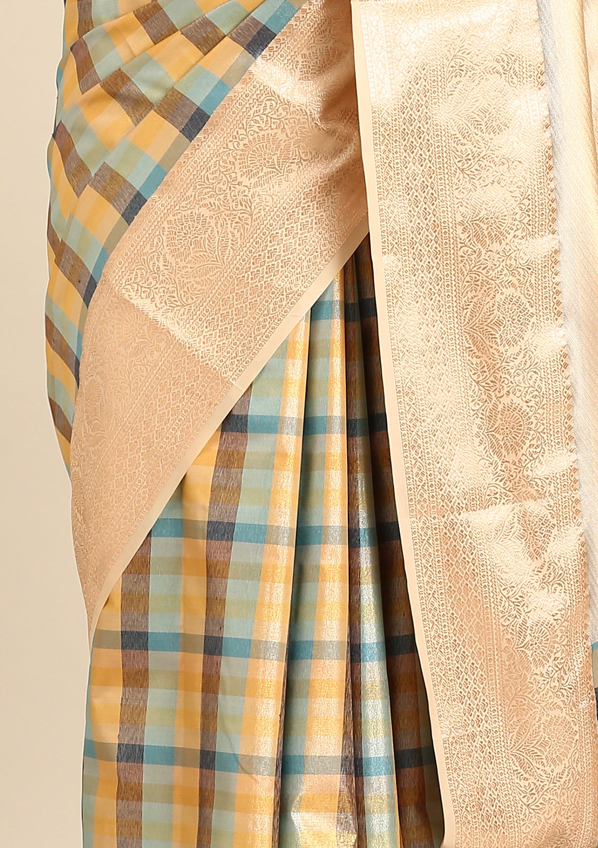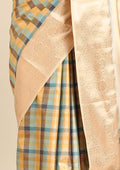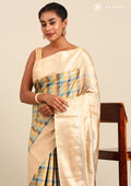 The cream-colored brocade Madras checks body lends a classic appeal, while the striped design with a brocade border adds a refined touch.
