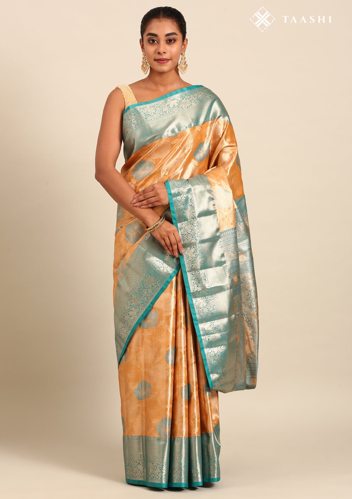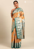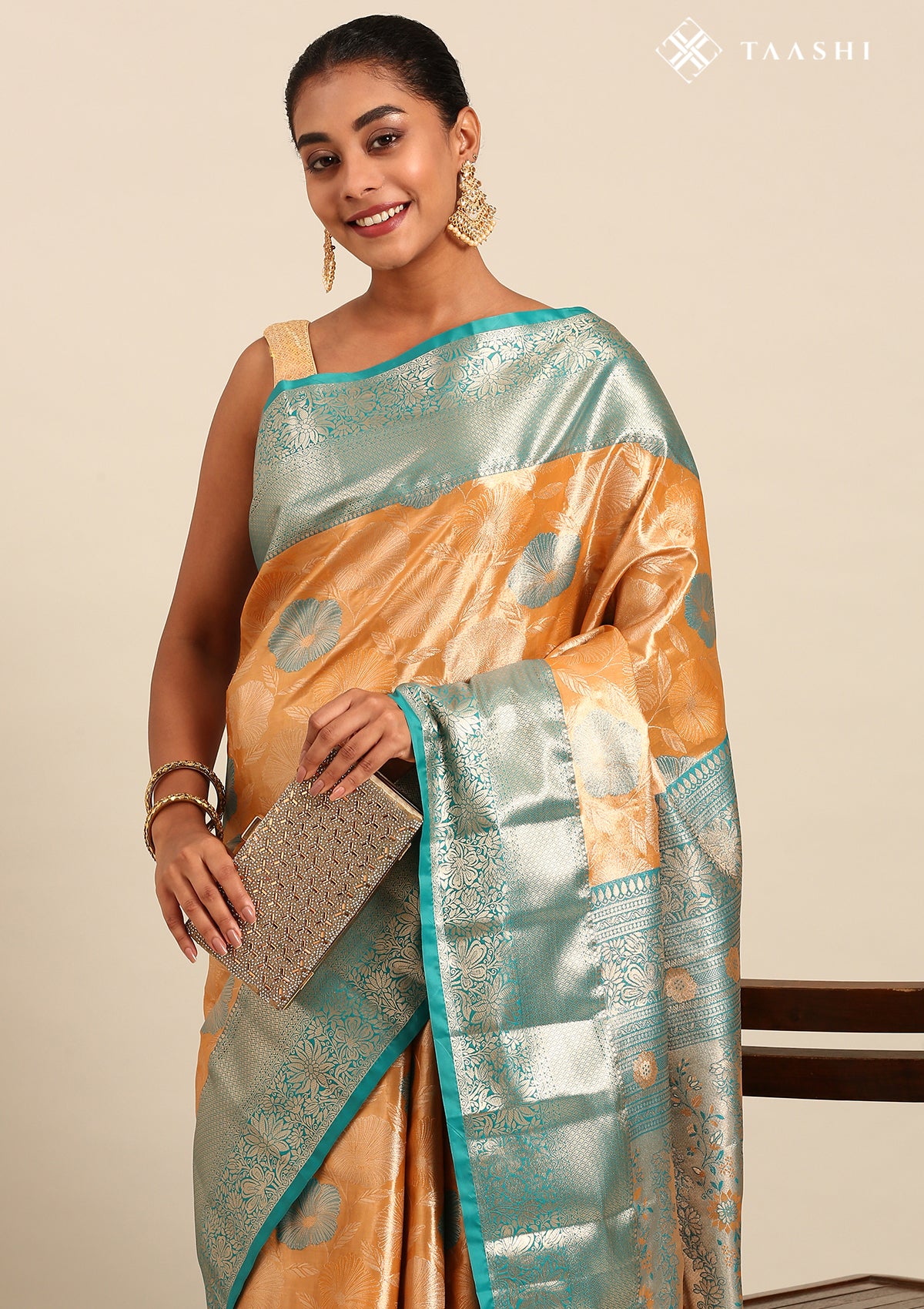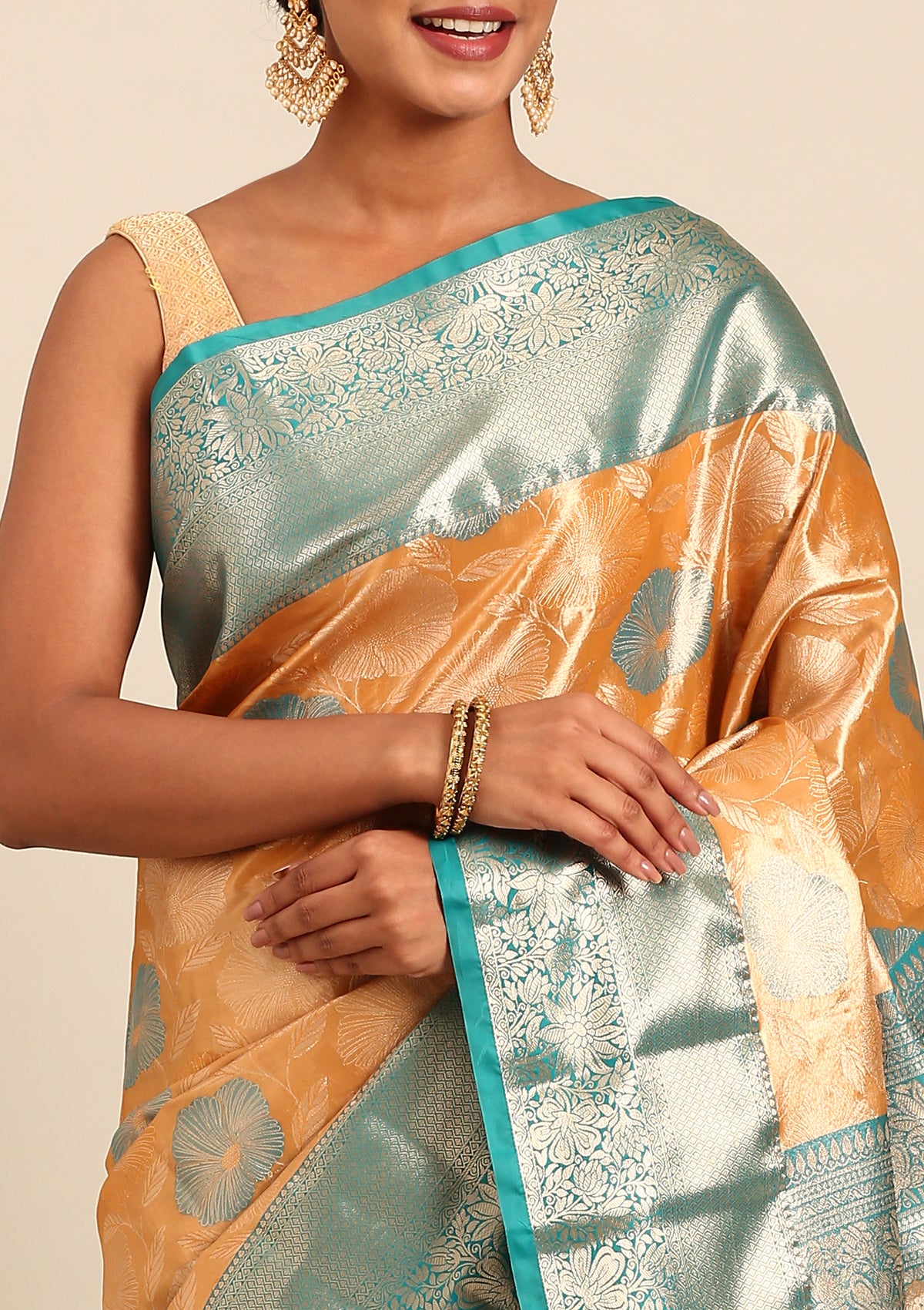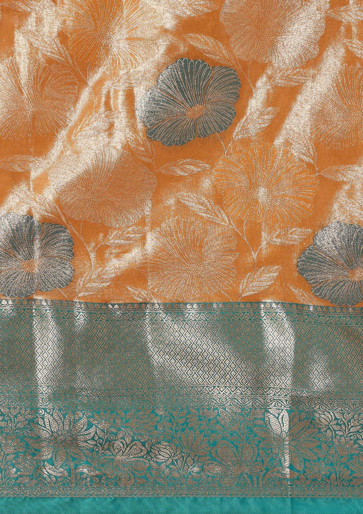 Orange and Teal Floral Pattern Tissue Brocade Kanchipuram Saree