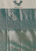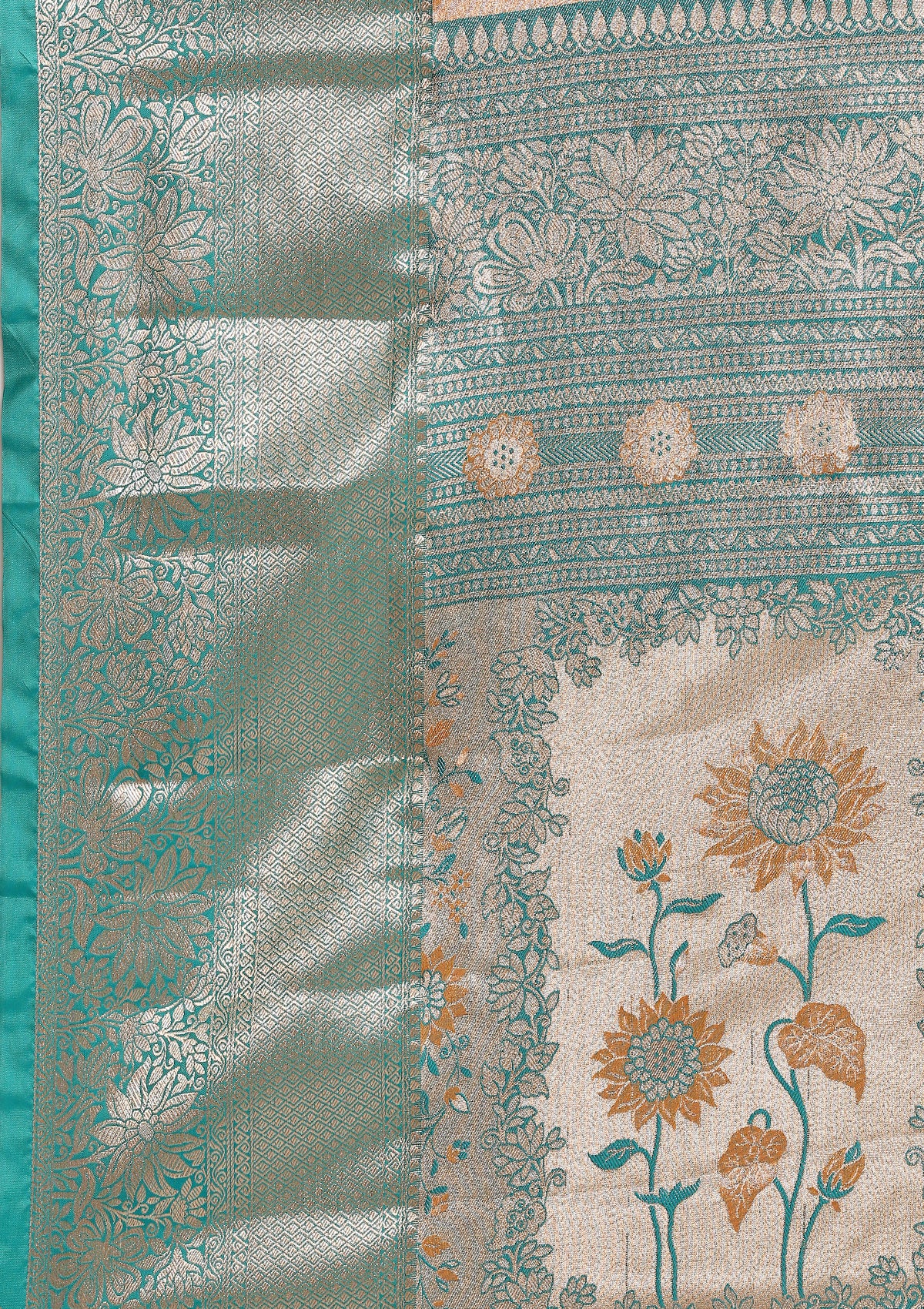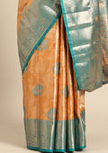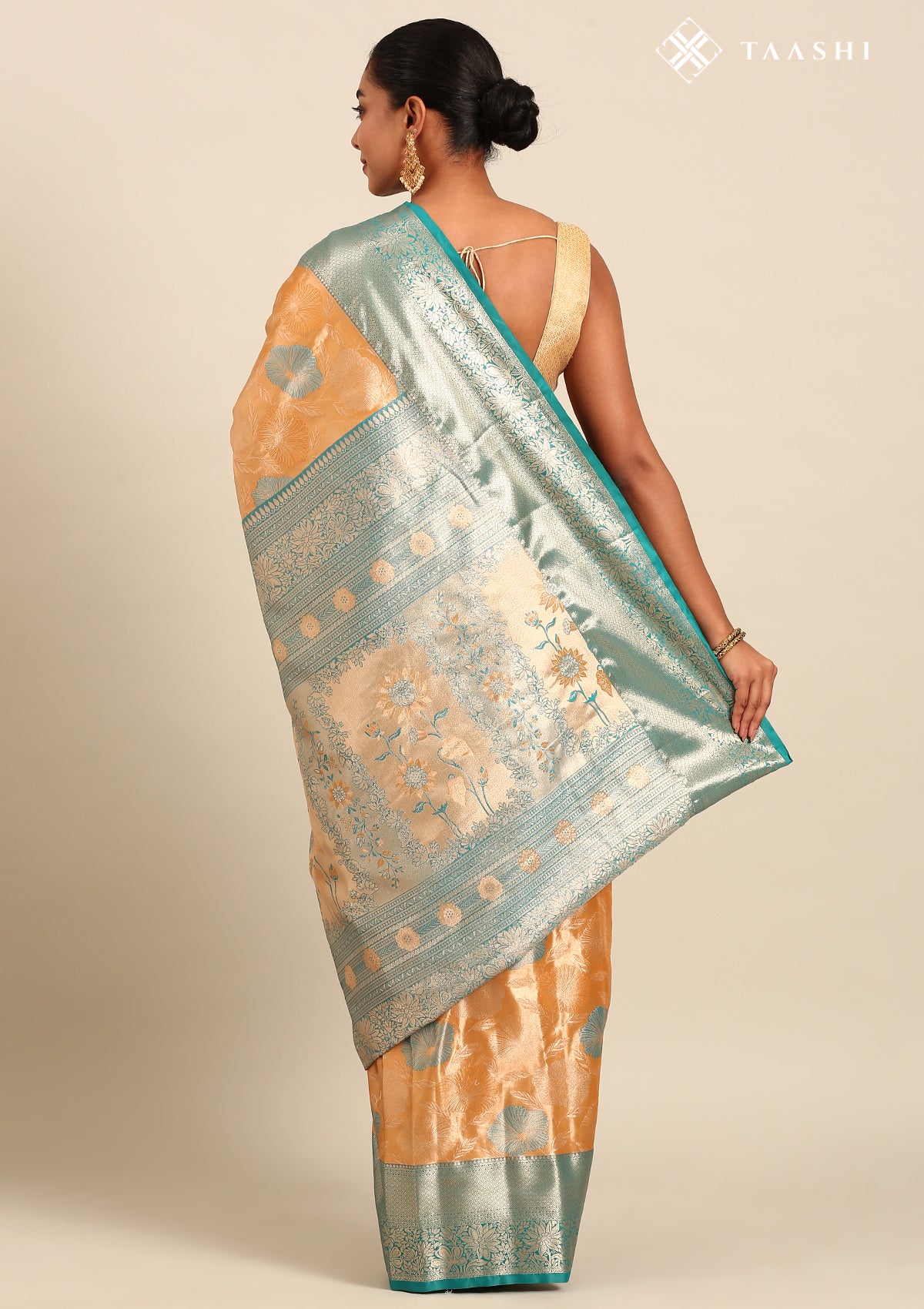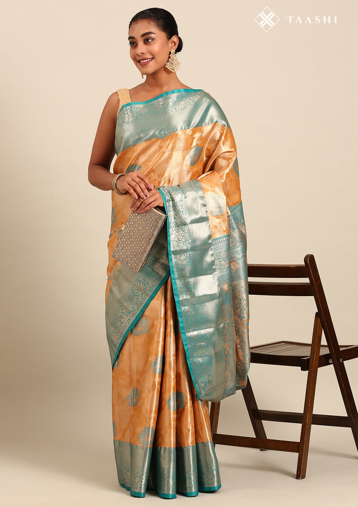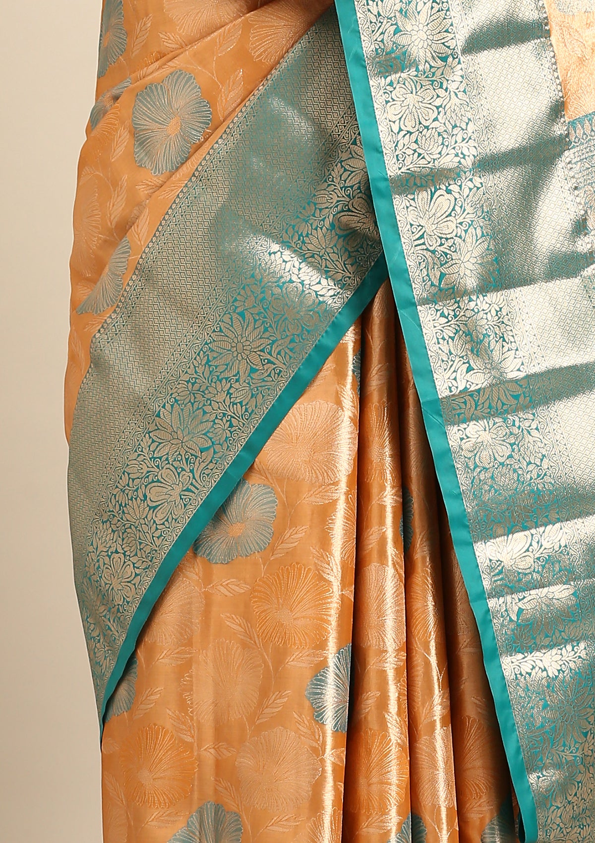 Orange and Teal Floral Pattern Tissue Brocade Kanchipuram Saree