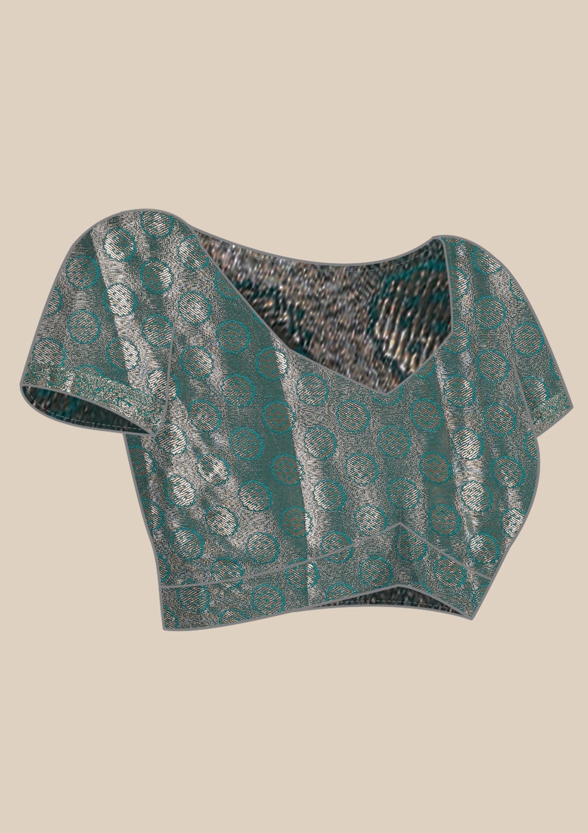 A richly woven pallu adorned with elegant butta motifs enhances the saree’s luxurious appeal.