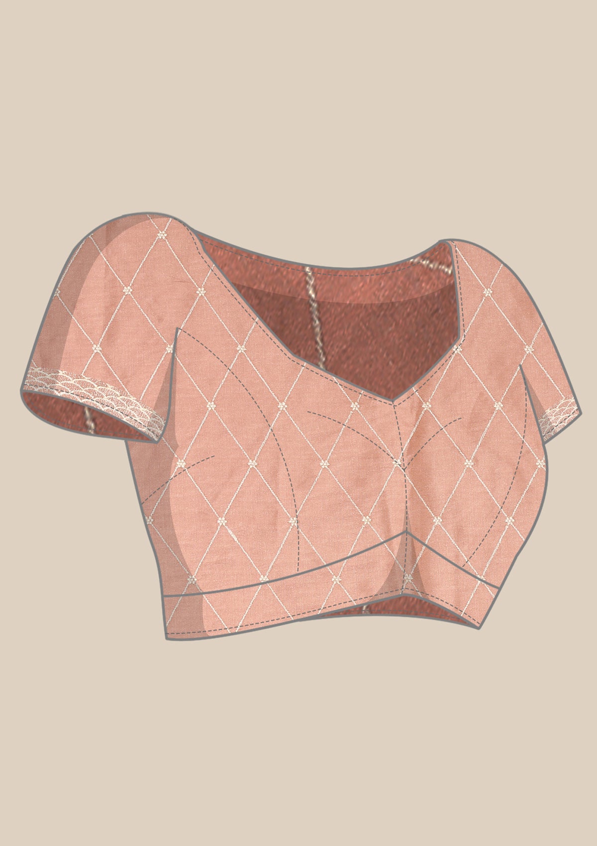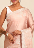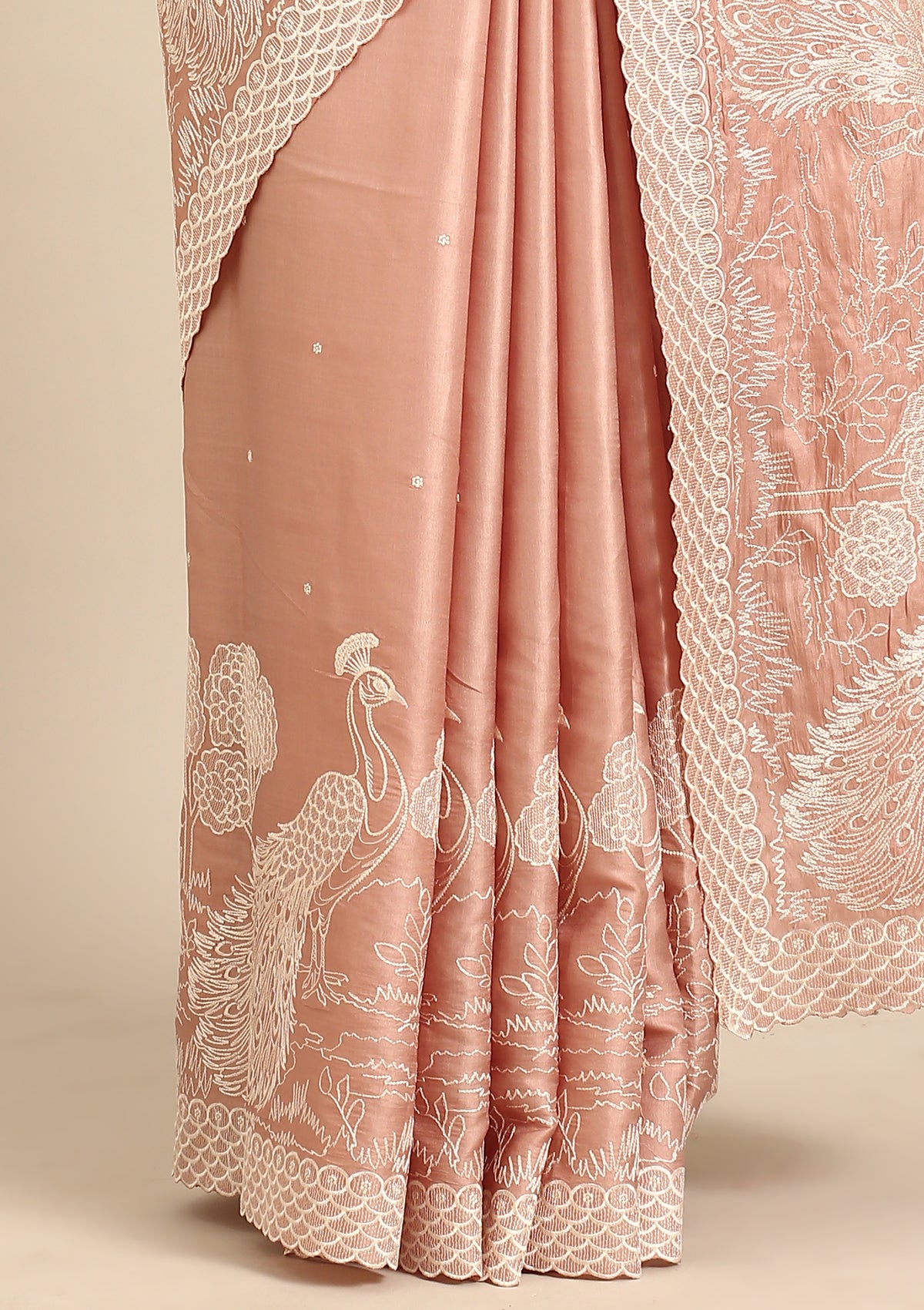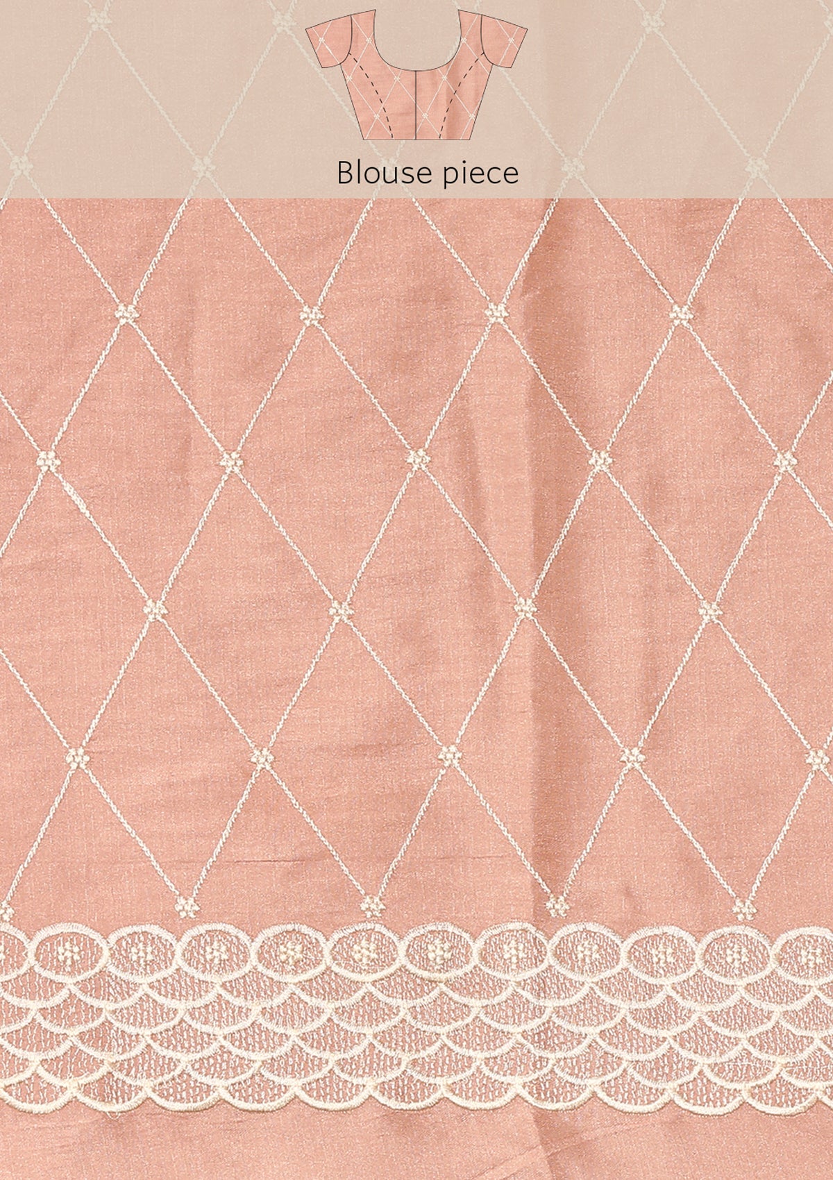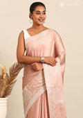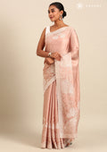 Woven in a soothing pastel pink shade, this polyester blended tussar saree radiates subtle elegance with its soft, lightweight texture.