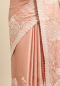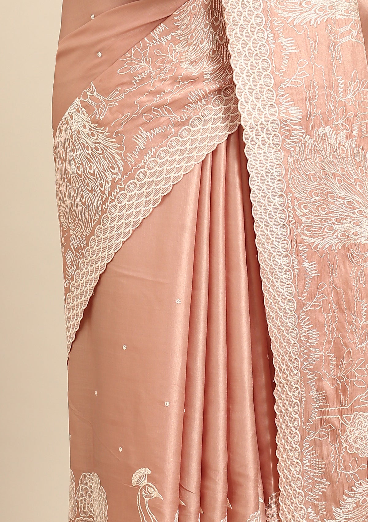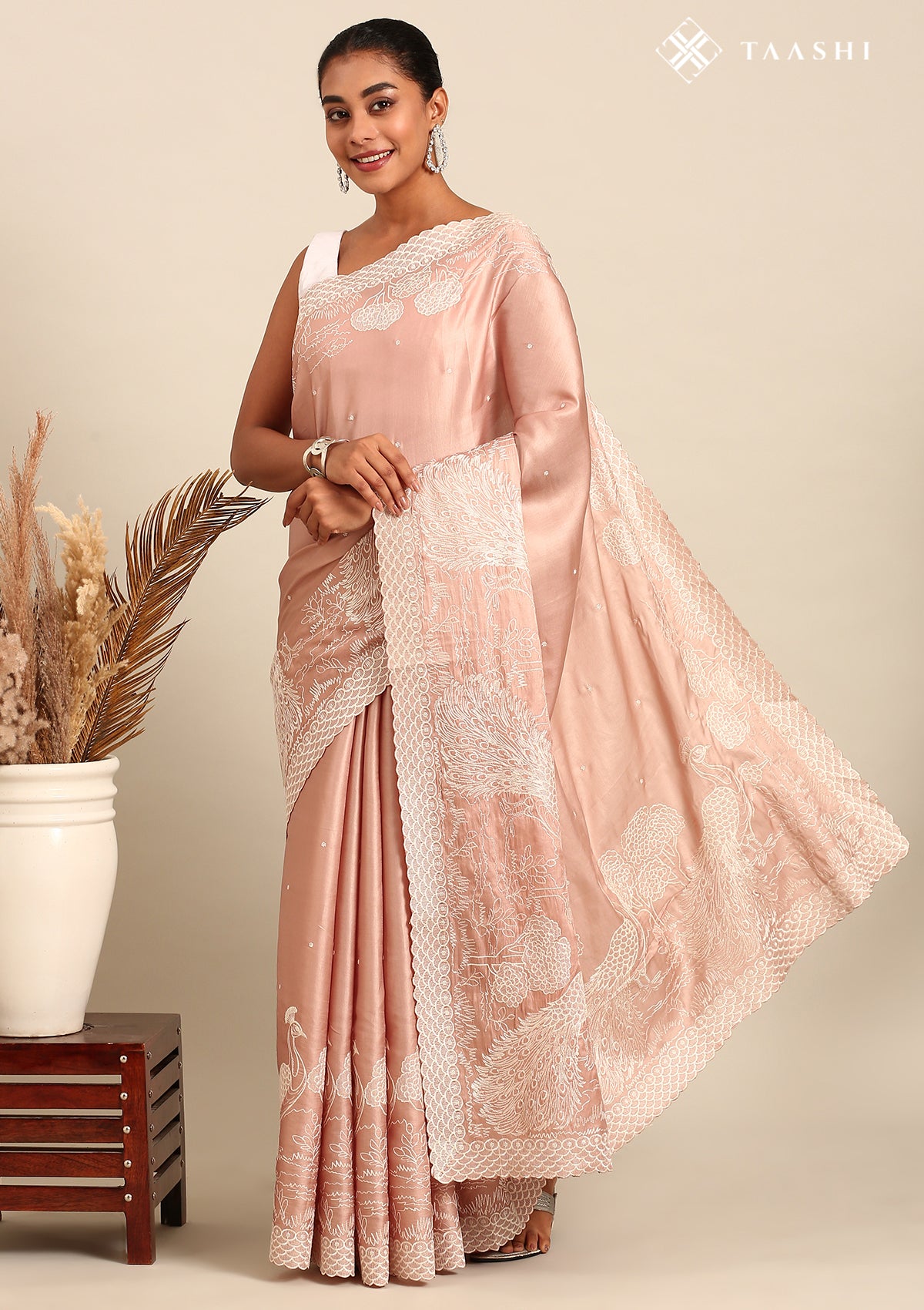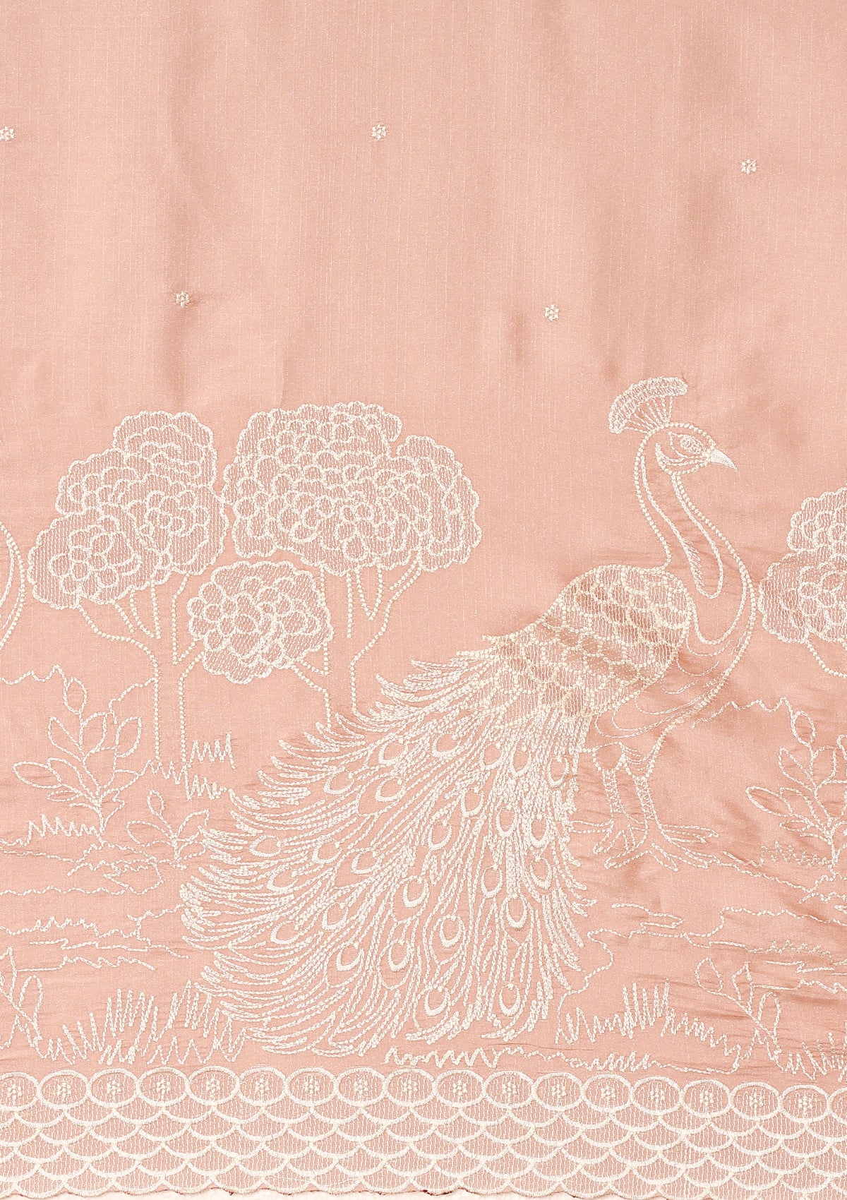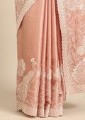 Woven in a soothing pastel pink shade, this polyester blended tussar saree radiates subtle elegance with its soft, lightweight texture.