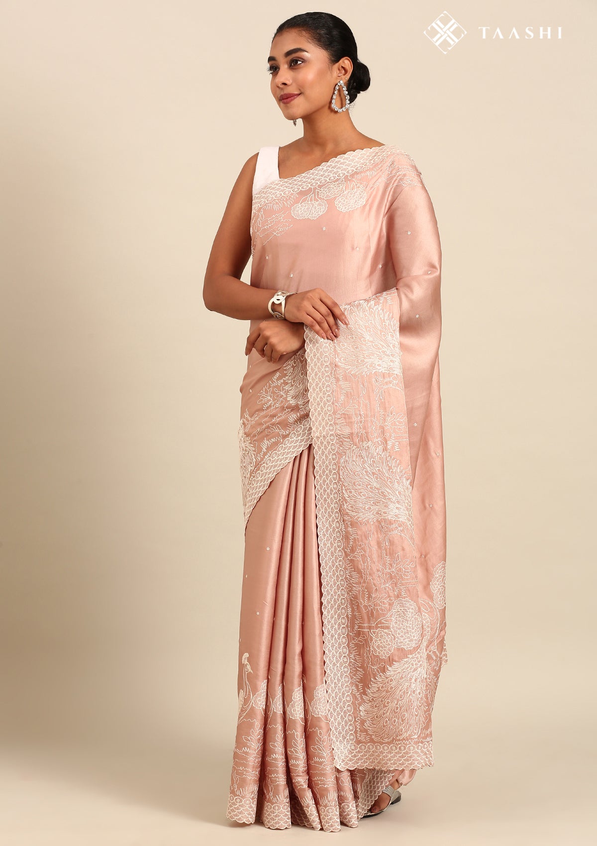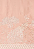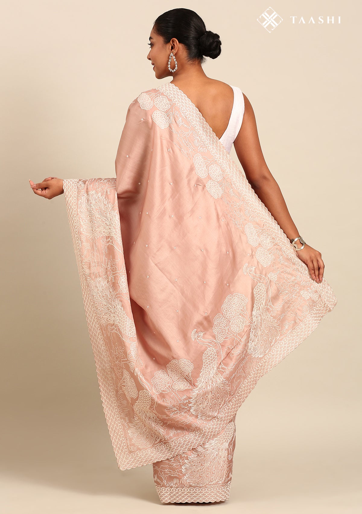 The body is adorned with intricate floral butta embroidery, while the pallu showcases beautiful peacock motifs highlighted with geometric pattern embroidery for a refined contrast.