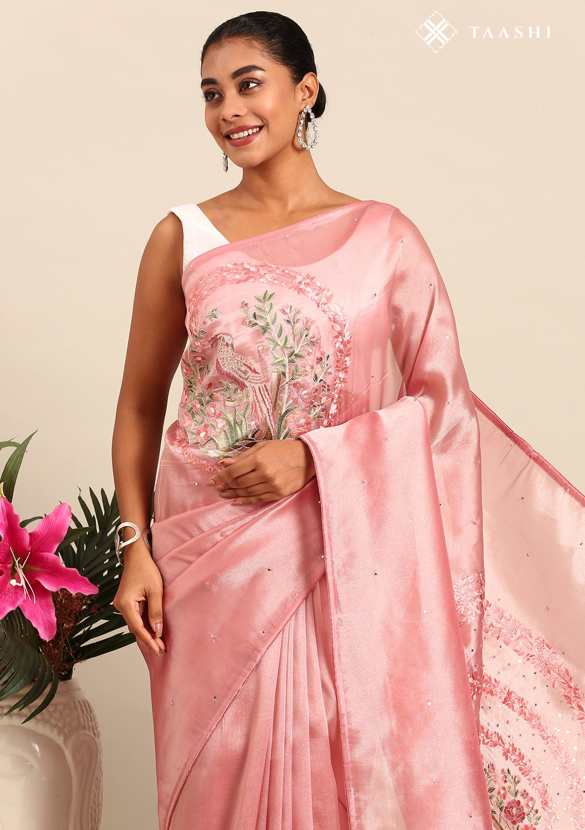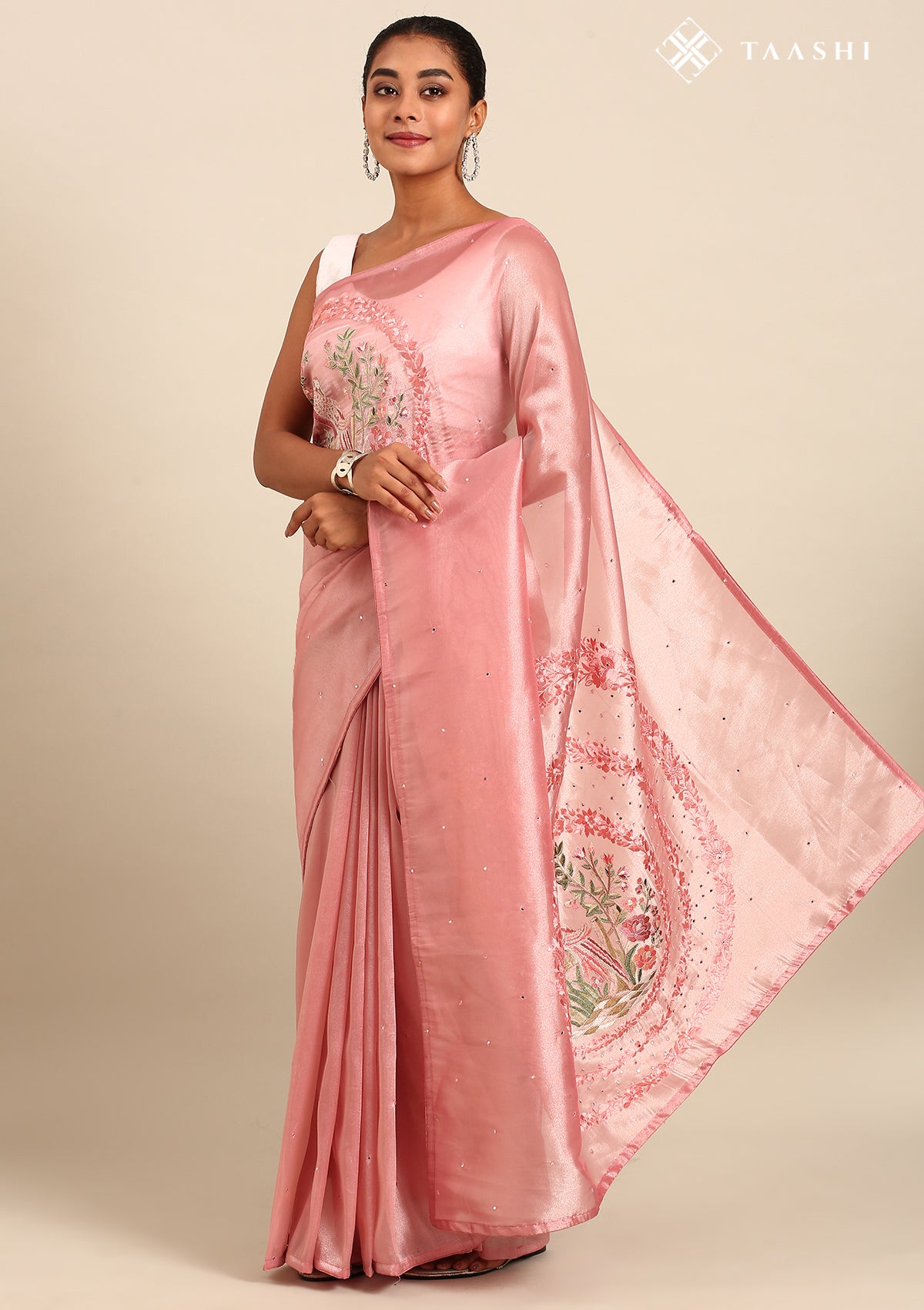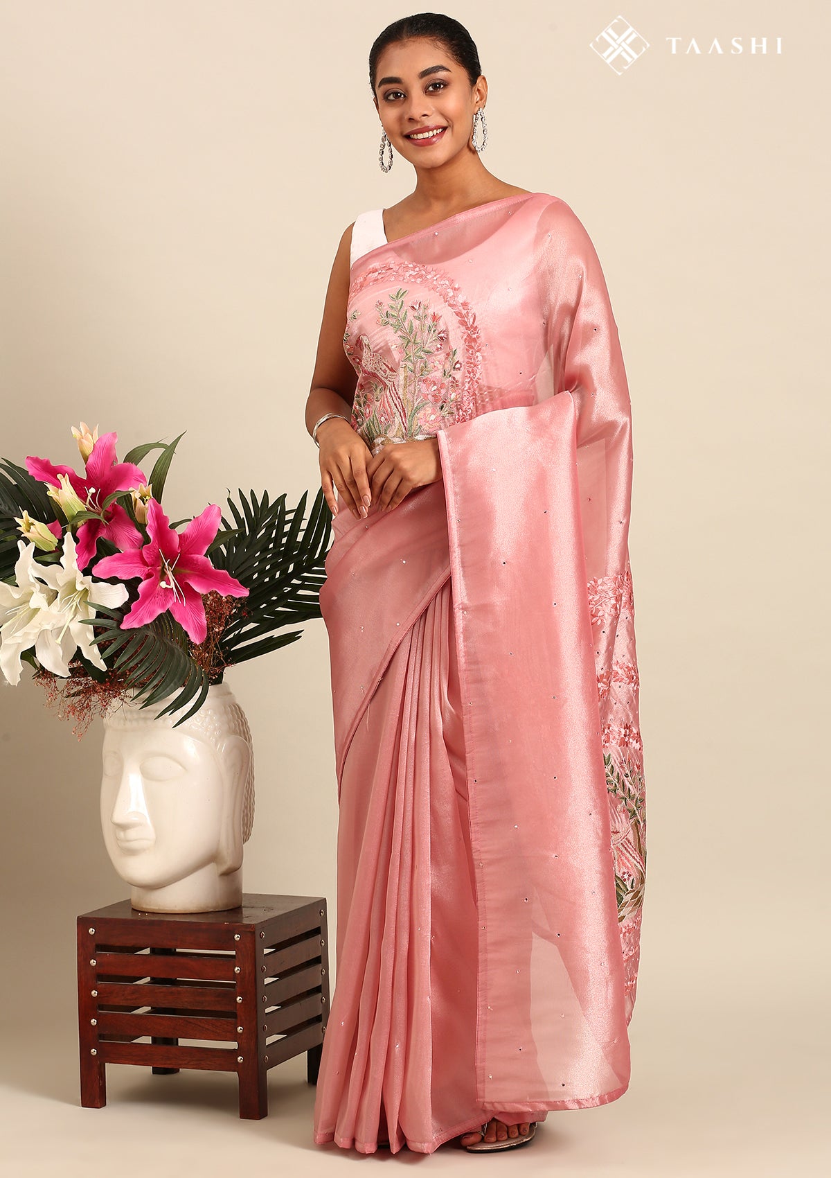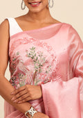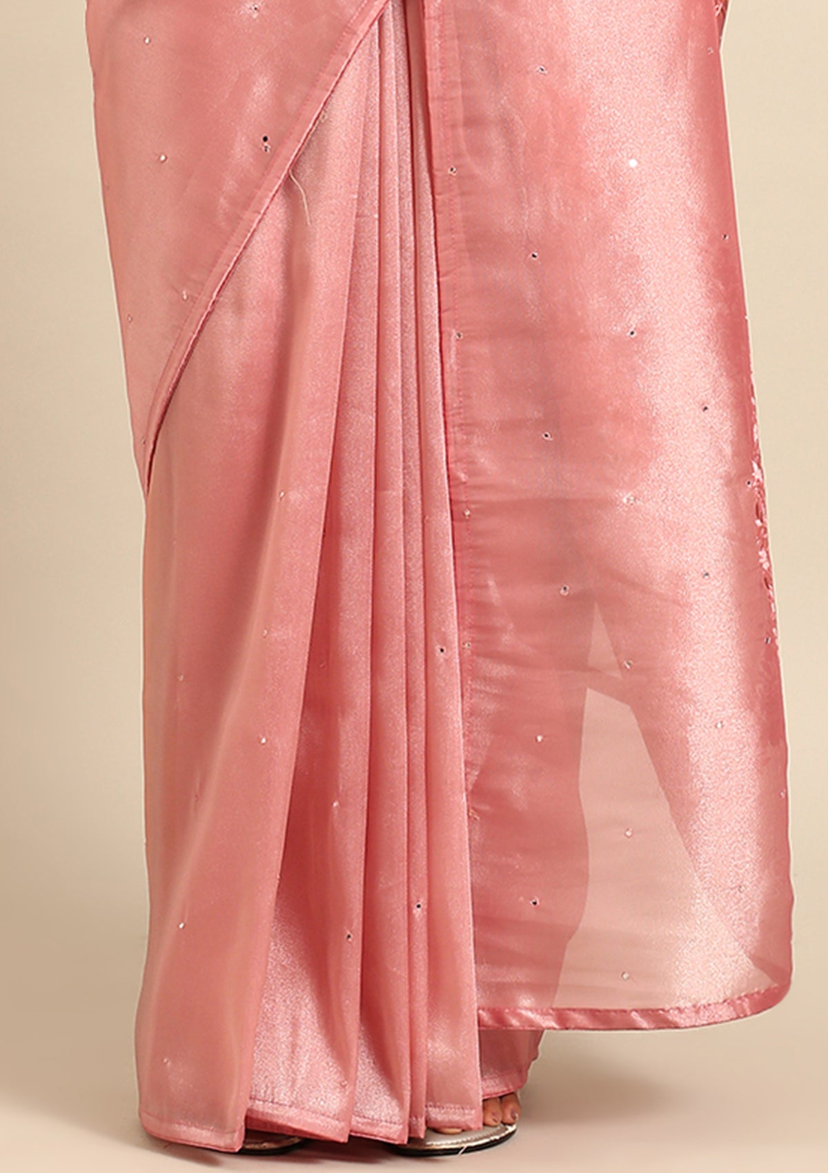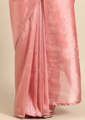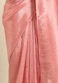 Crafted in a charming pink hue, this polyester blended tissue saree reflects a perfect blend of elegance and festive allure.