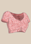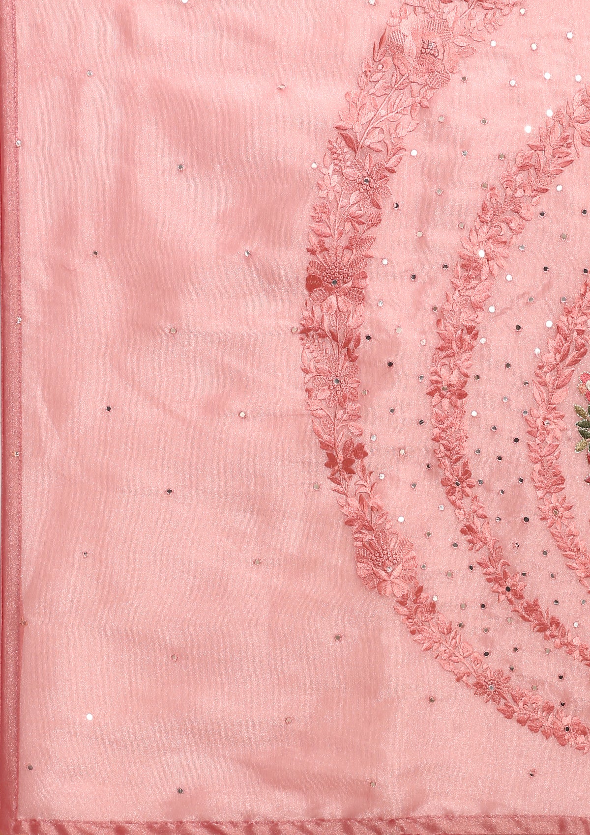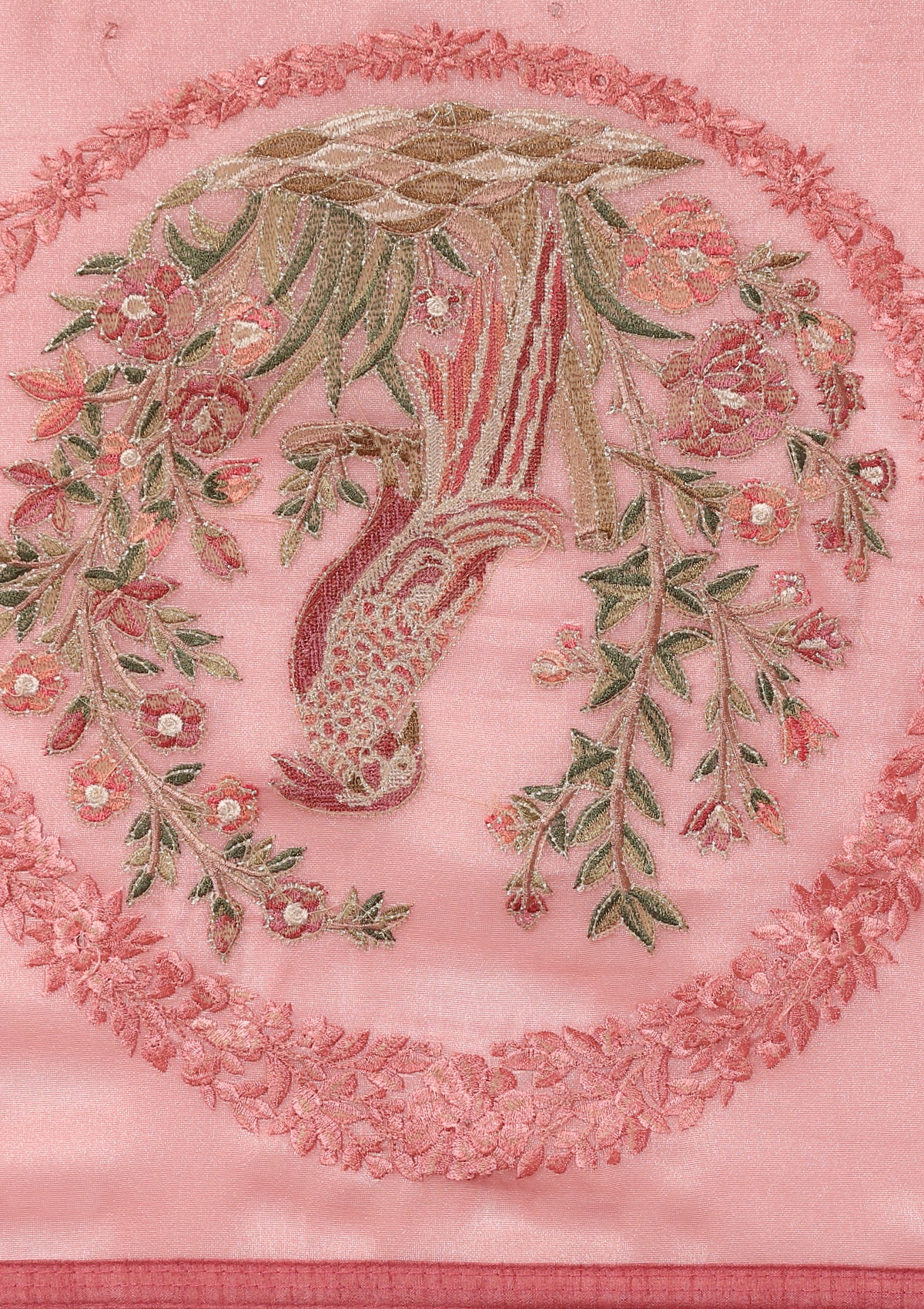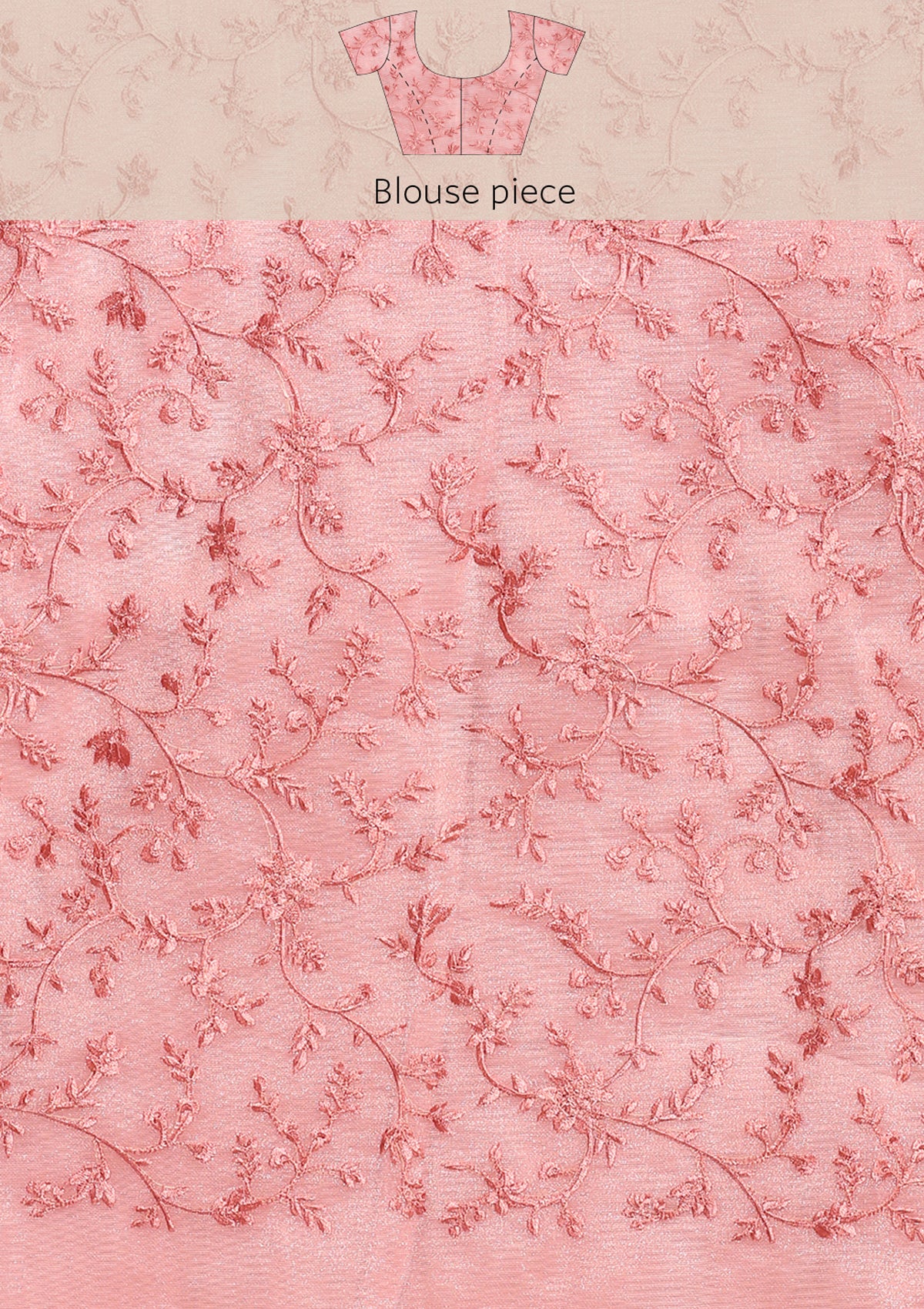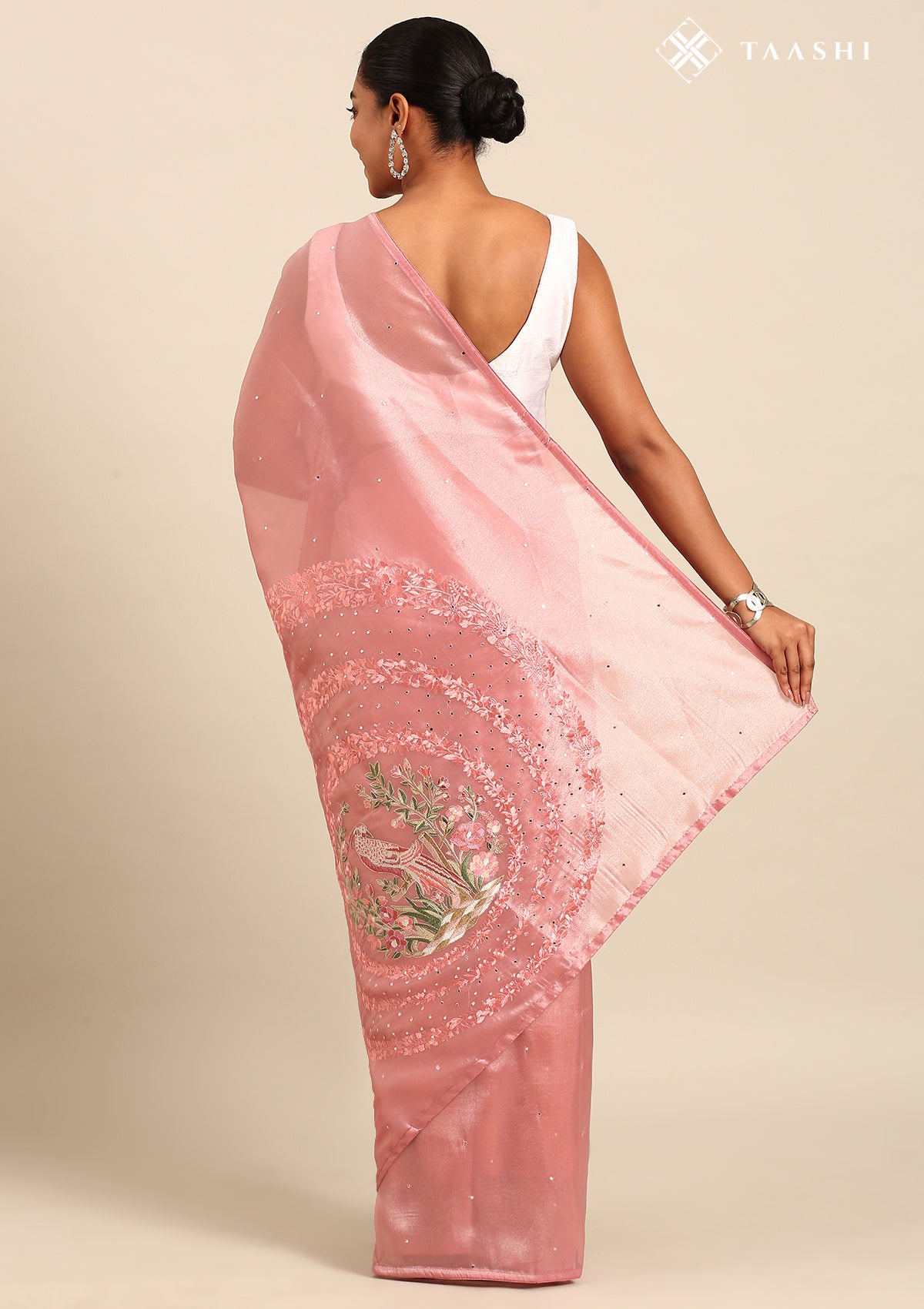 Crafted in a charming pink hue, this polyester blended tissue saree reflects a perfect blend of elegance and festive allure.