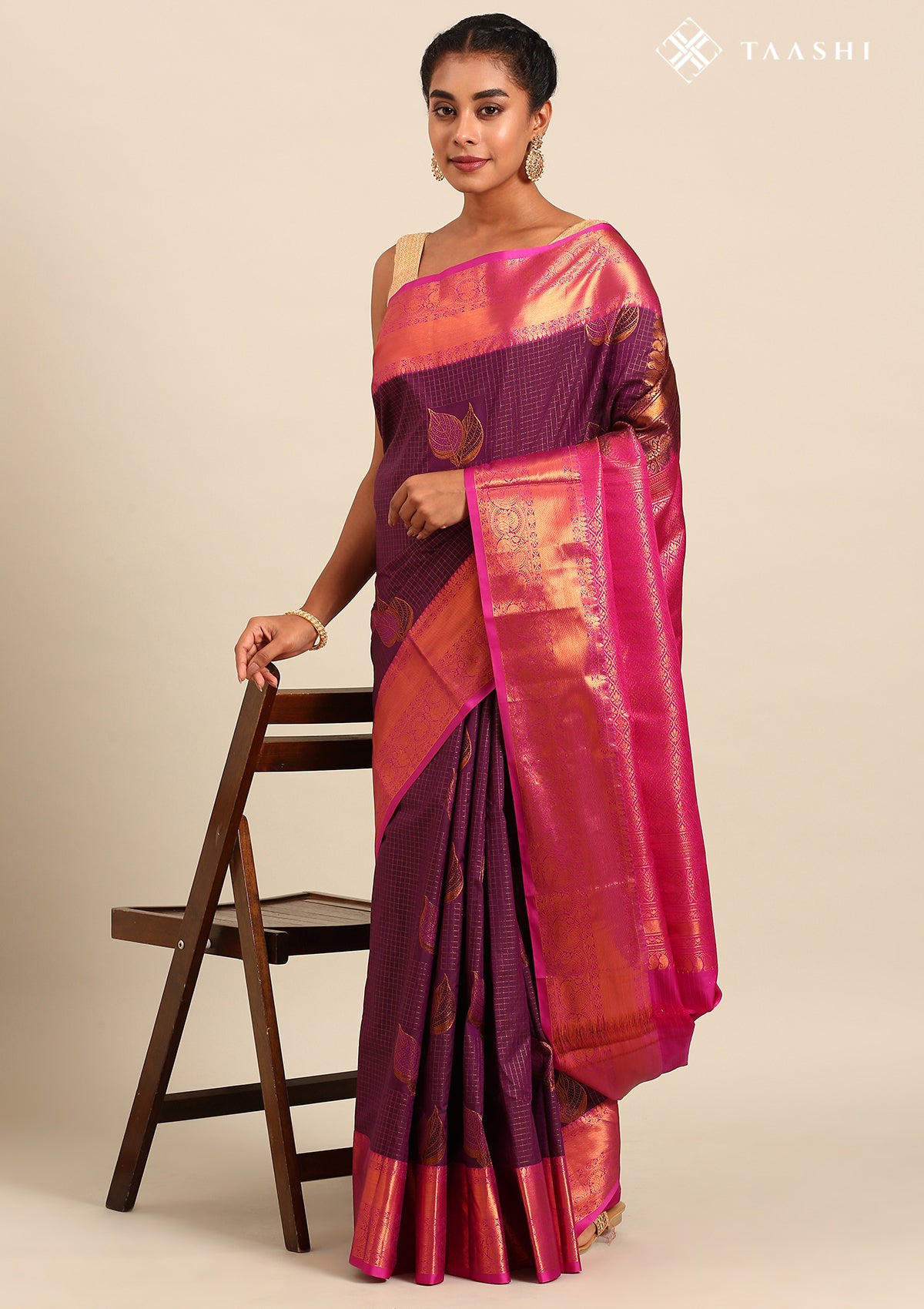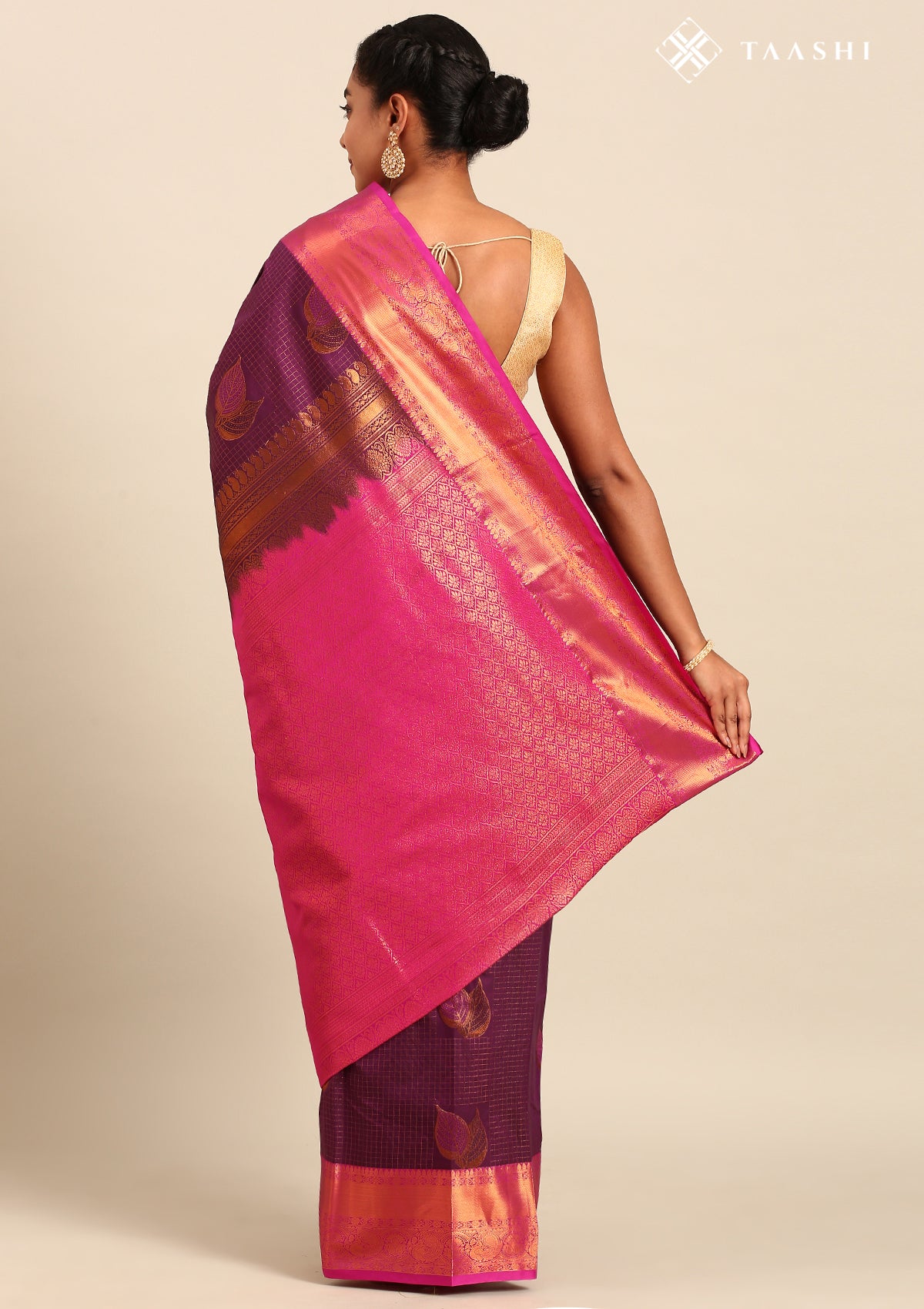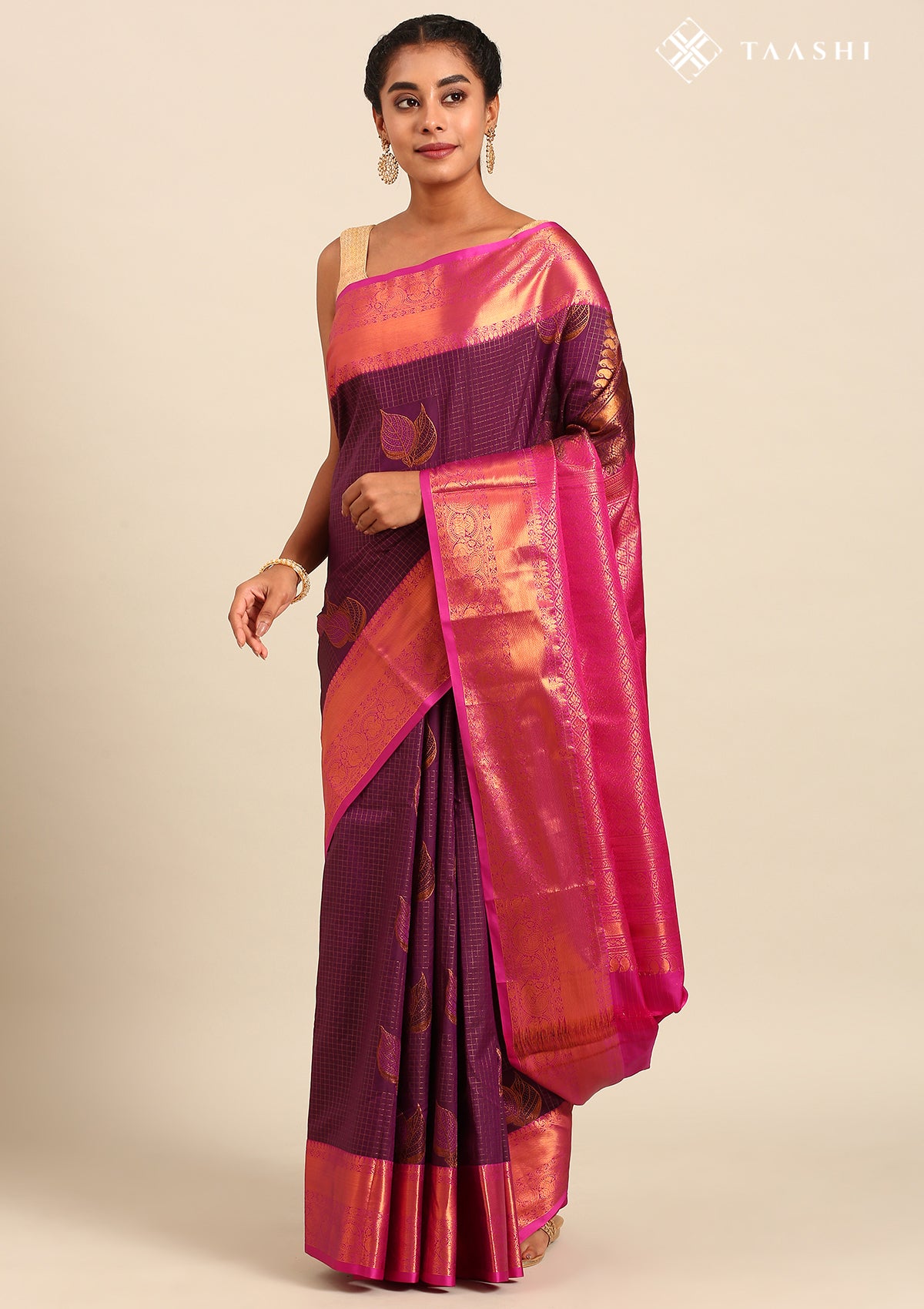 Experience the charm of the Dark Purple and Magenta Kanchipuram Saree, crafted from fine Polyester Blended fabric.