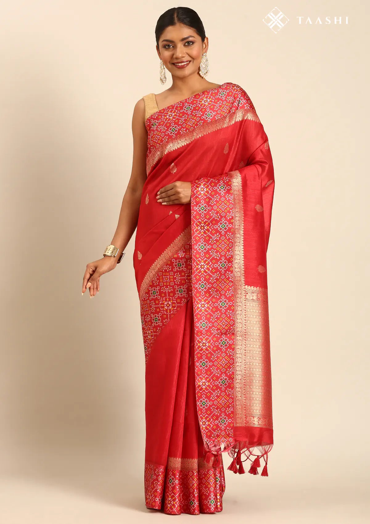 Red Ikat Pattern And Tradition Pattern Woven Tussar Saree