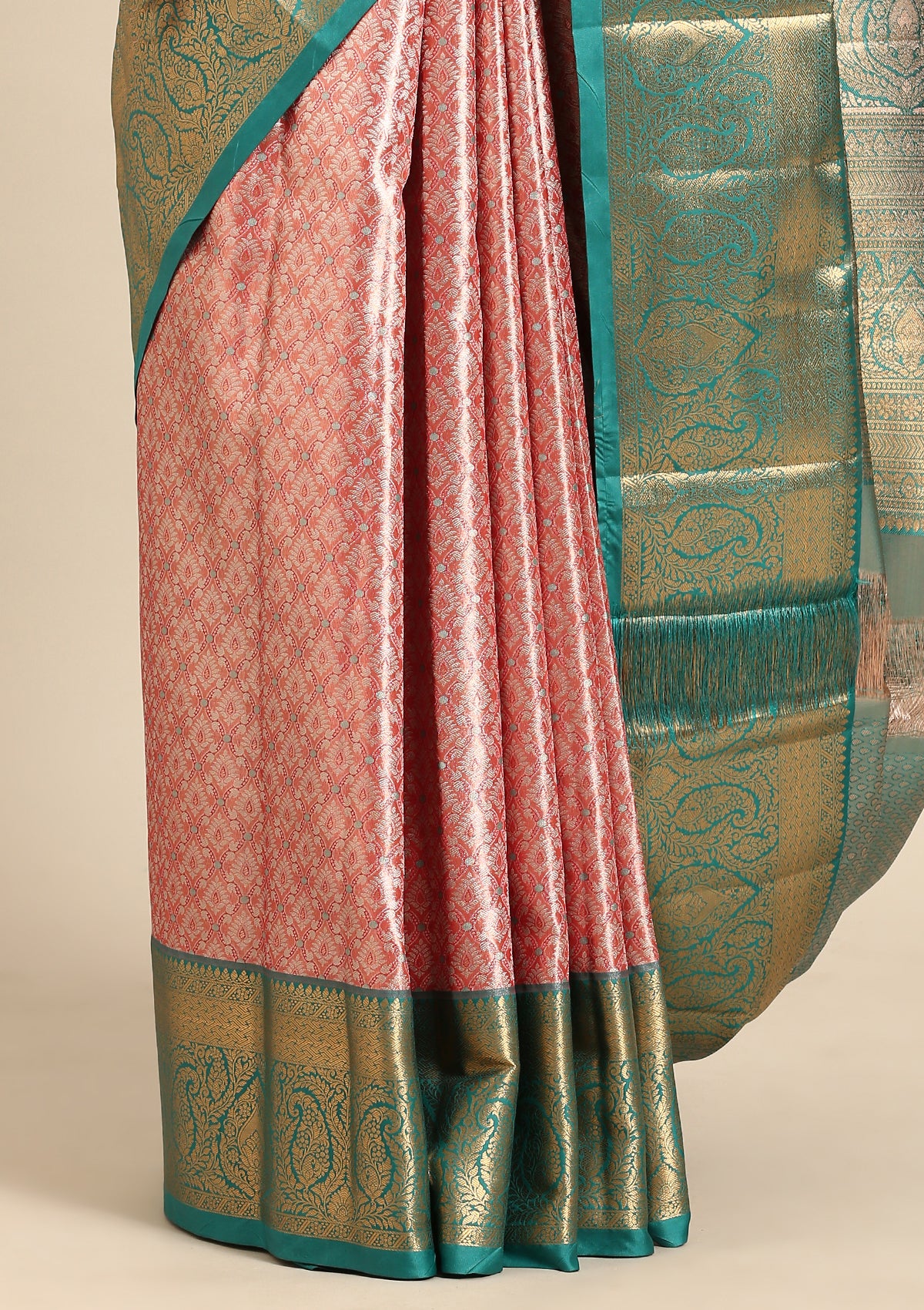 Bring a burst of festive elegance with the Orange and Teal Kanchipuram Saree, crafted from fine polyester blended fabric for a graceful fall and comfortable wear. The warm orange tone paired with refreshing teal accents creates a striking and celebratory look.