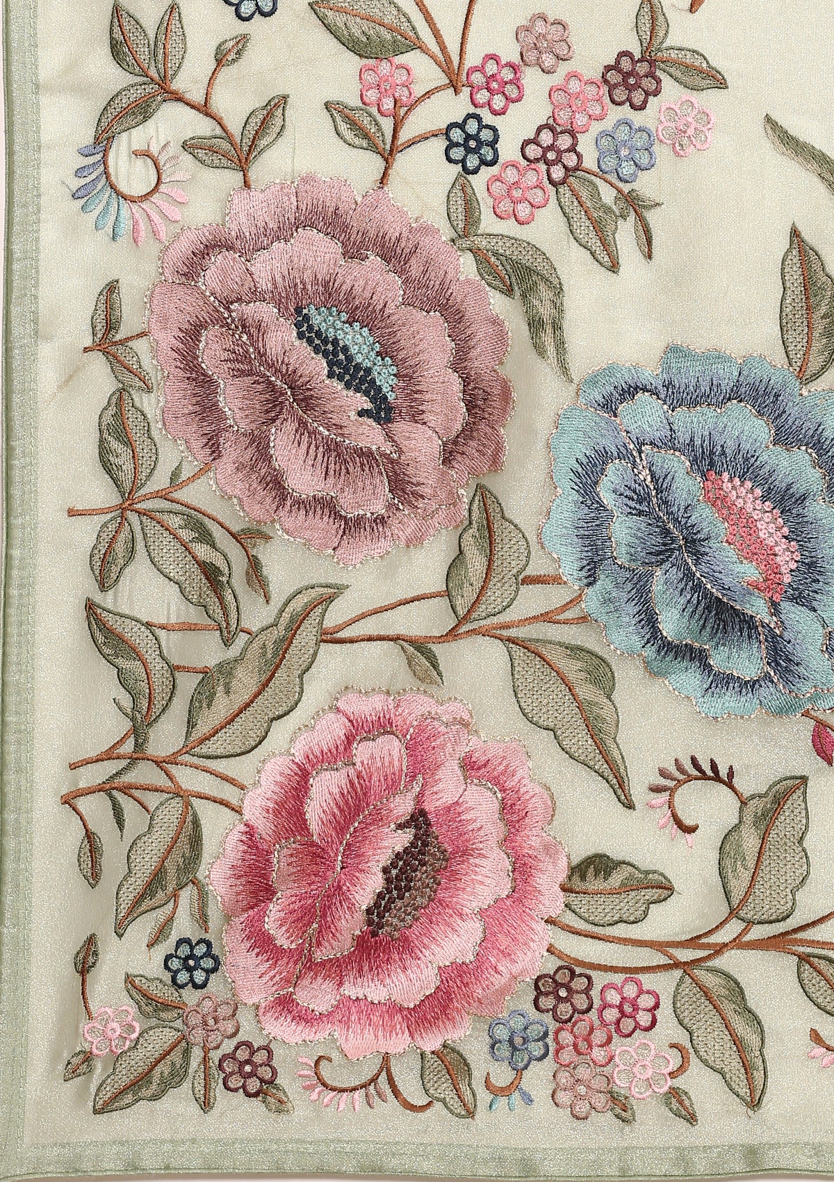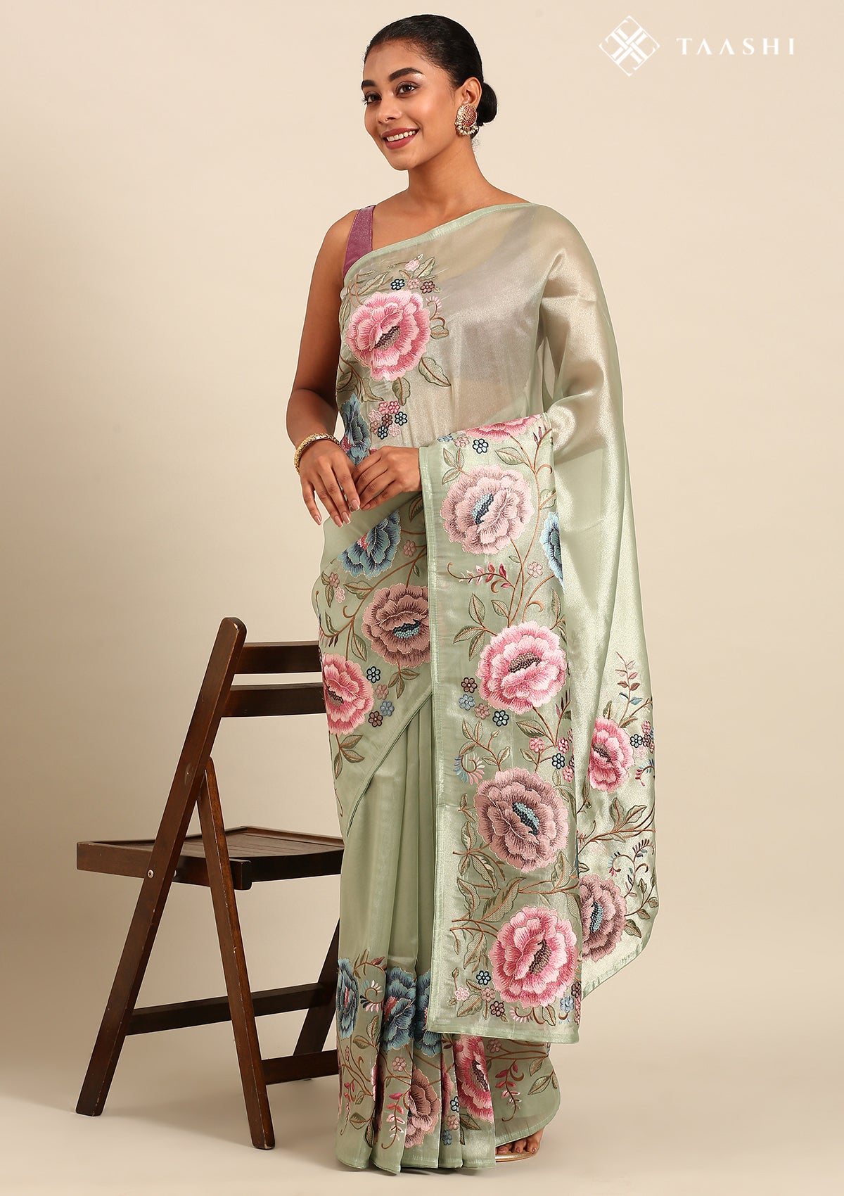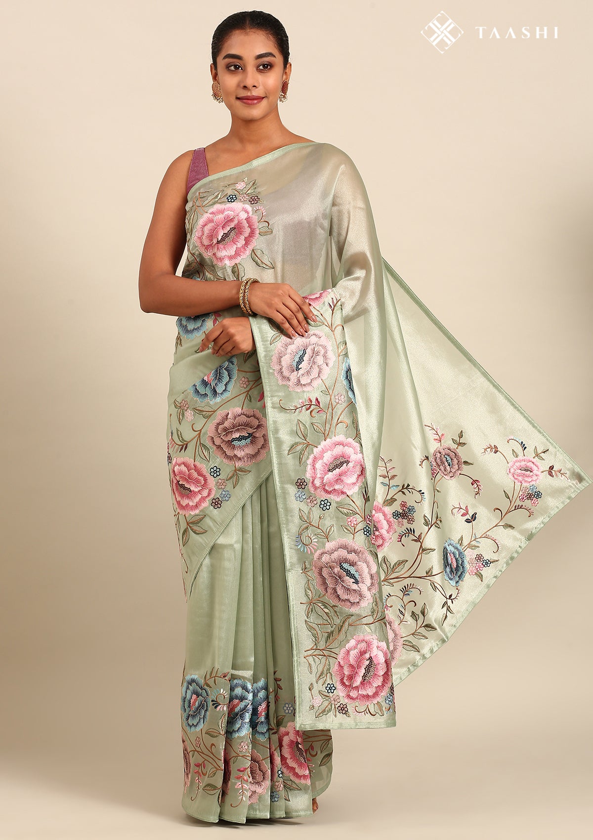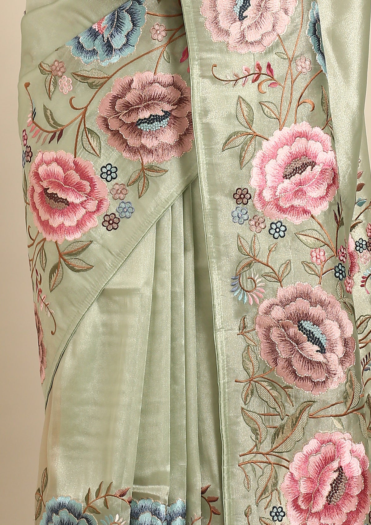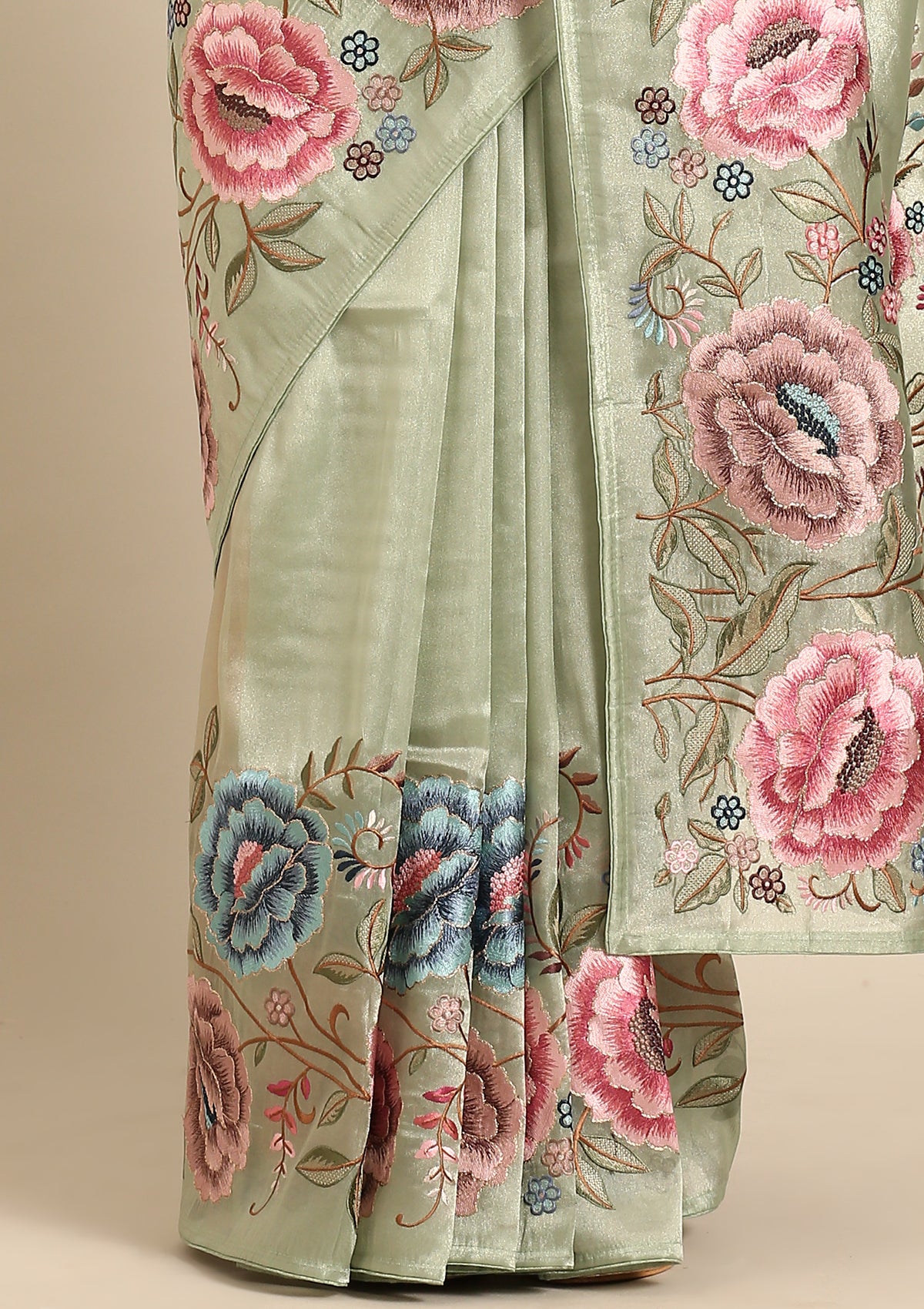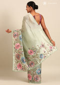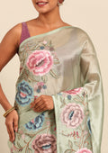 Sage Green Floral Embroidered Tissue Saree