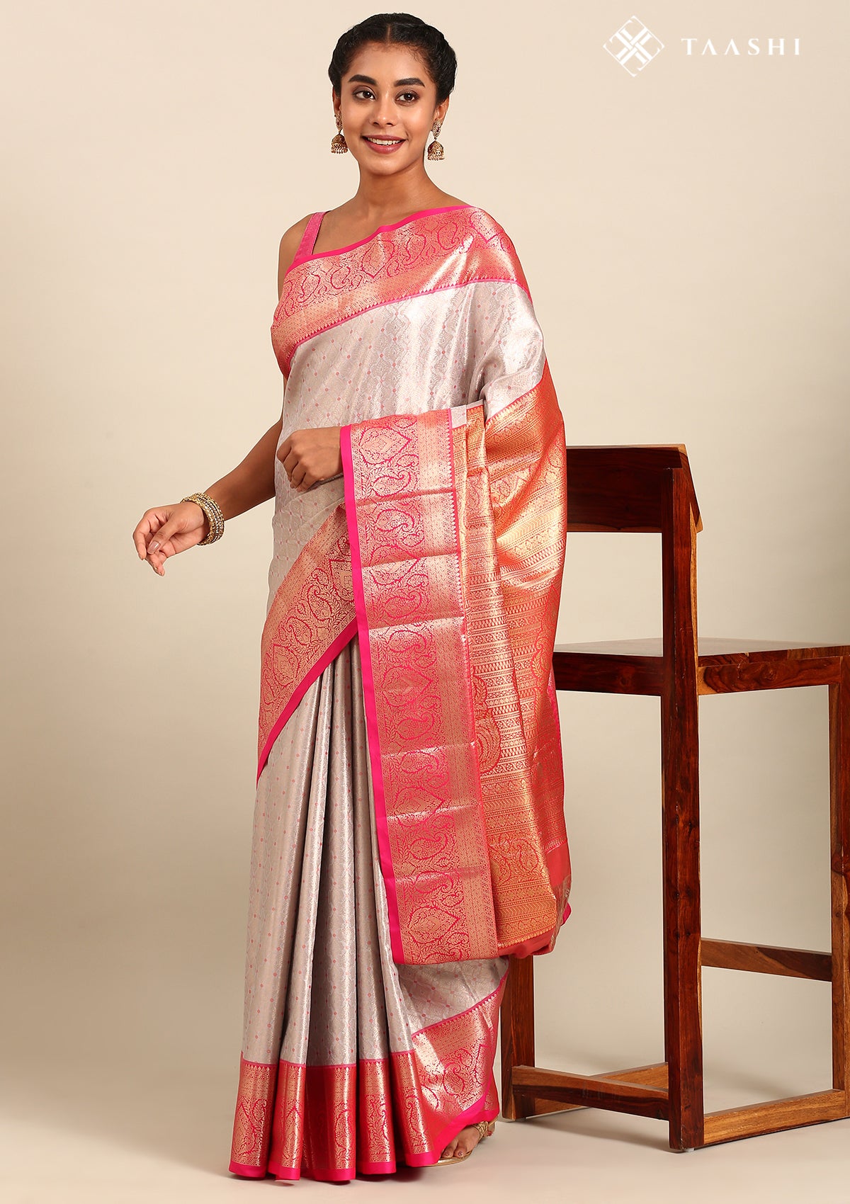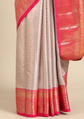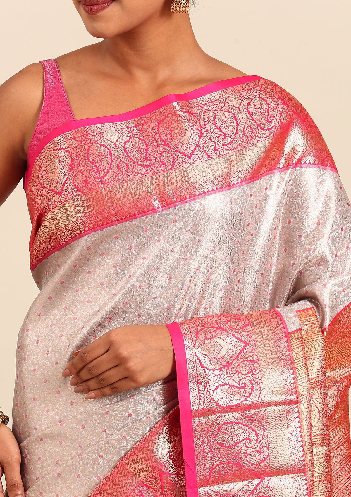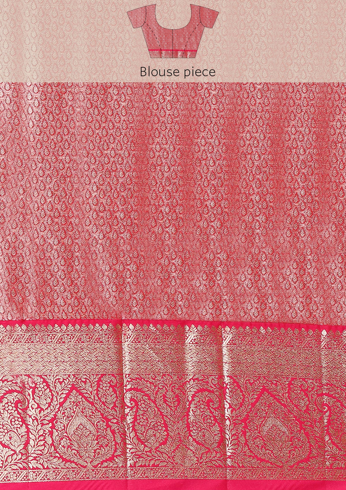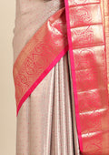 Glow with understated luxury in the Rosegold and Pink Kanchipuram Saree, crafted from premium polyester blended fabric for a soft and elegant drape. The subtle rosegold tone paired with vibrant pink accents creates a delicate yet captivating look.