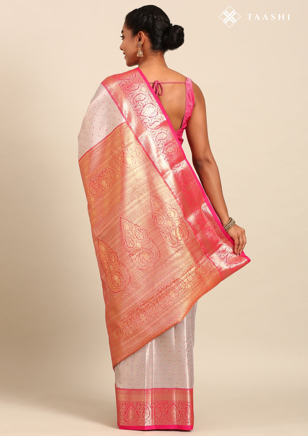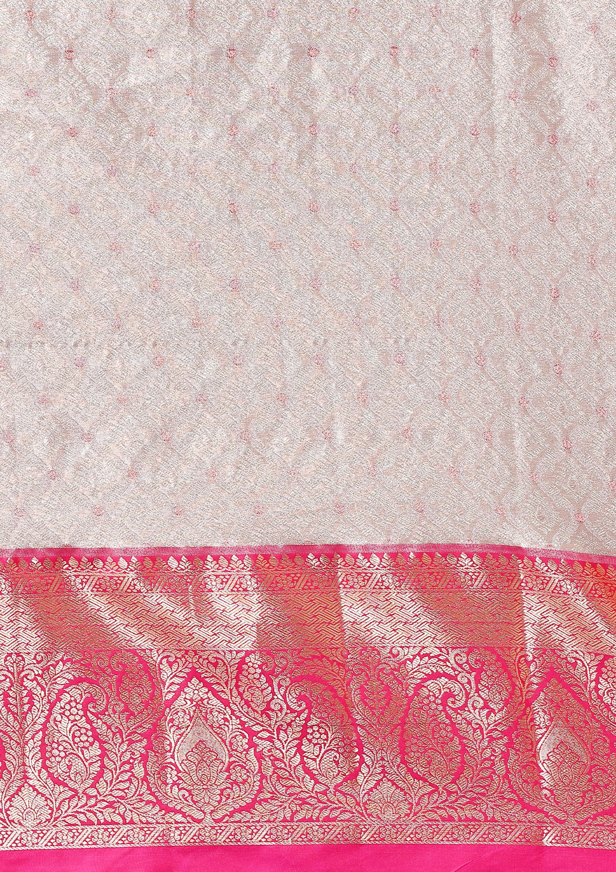 - Features a 6-inch pink border that adds a graceful frame to the saree
