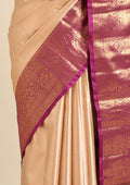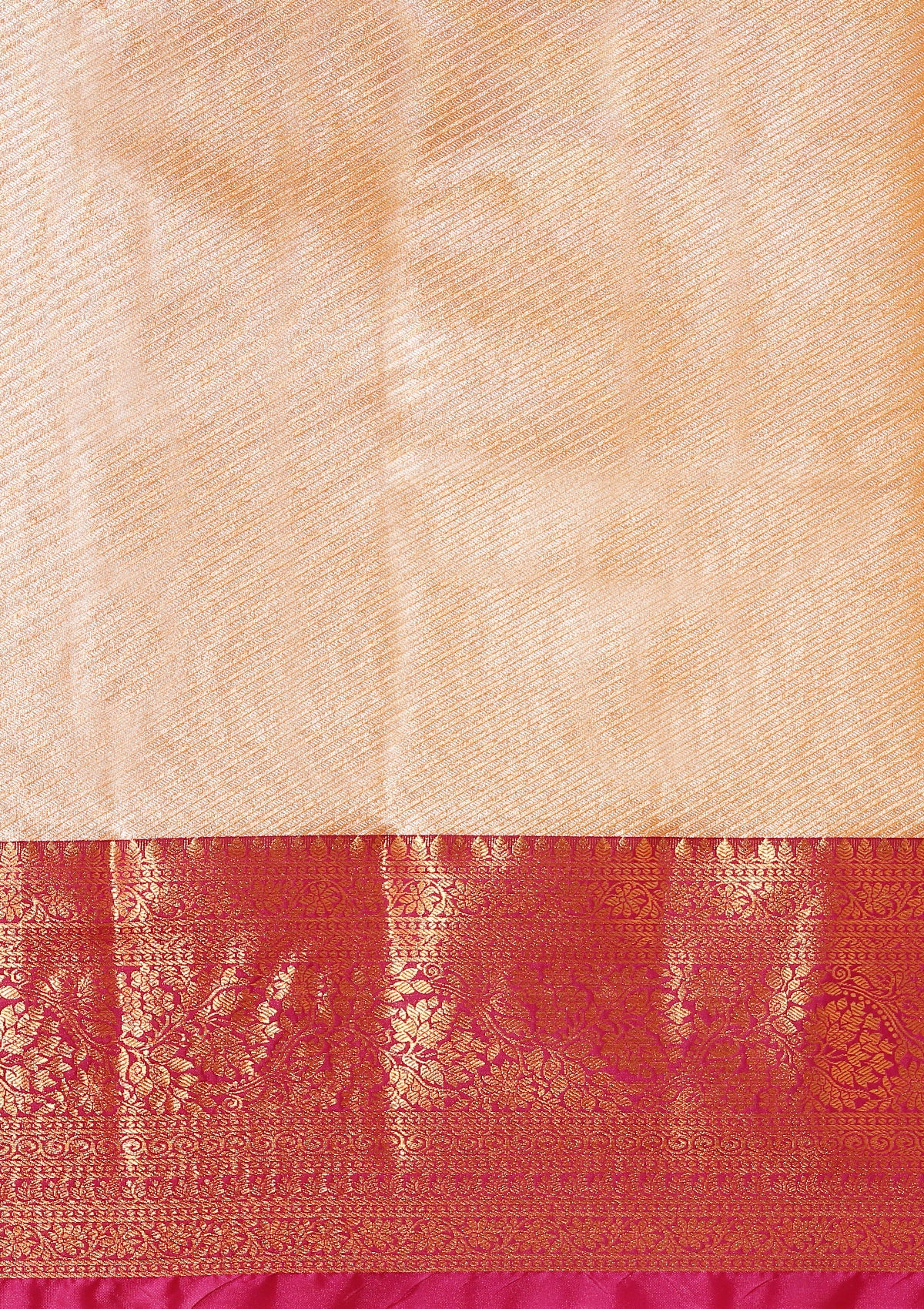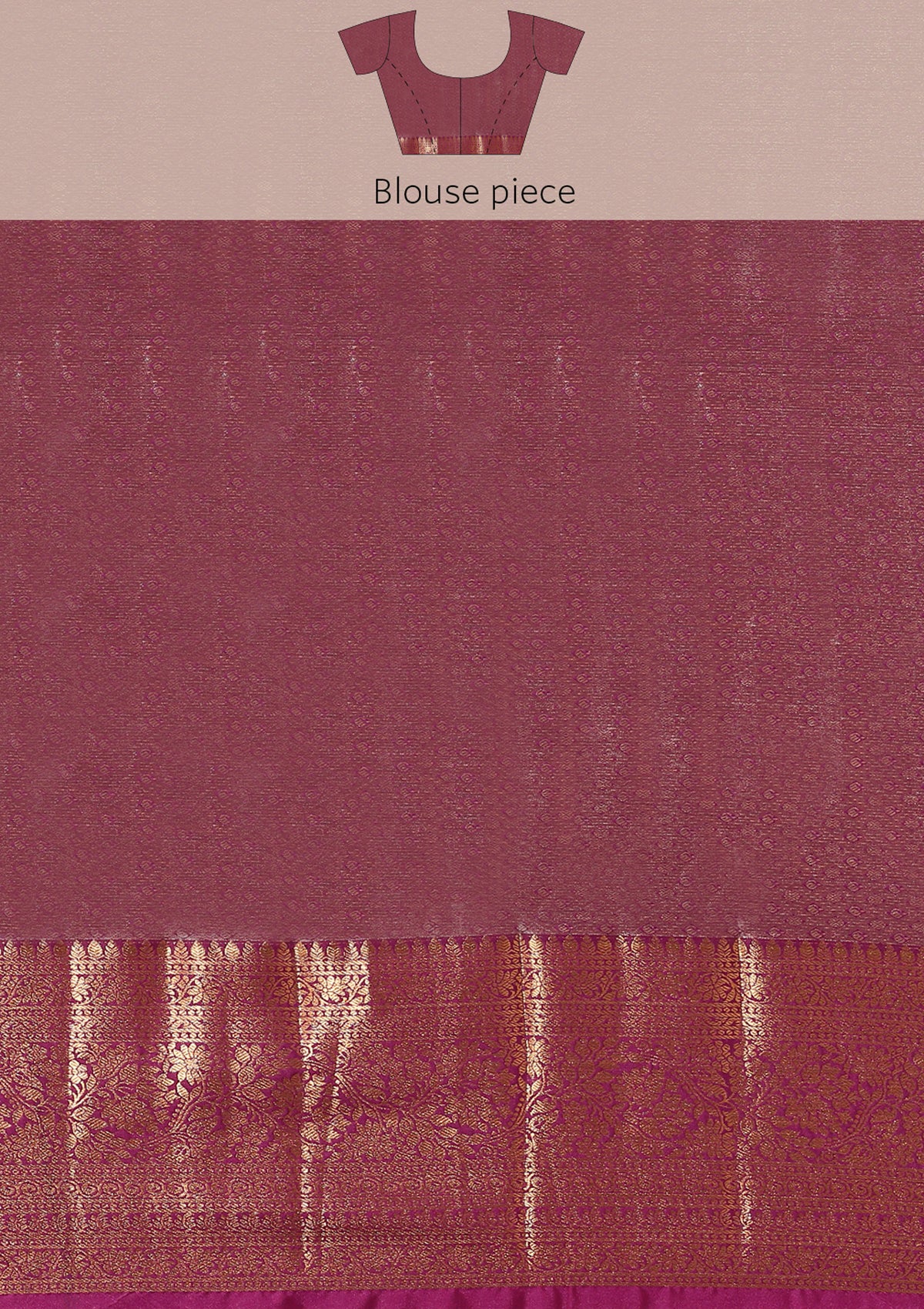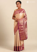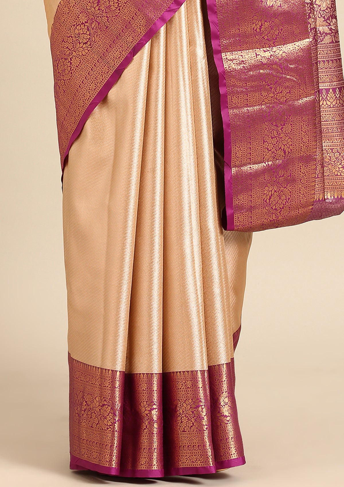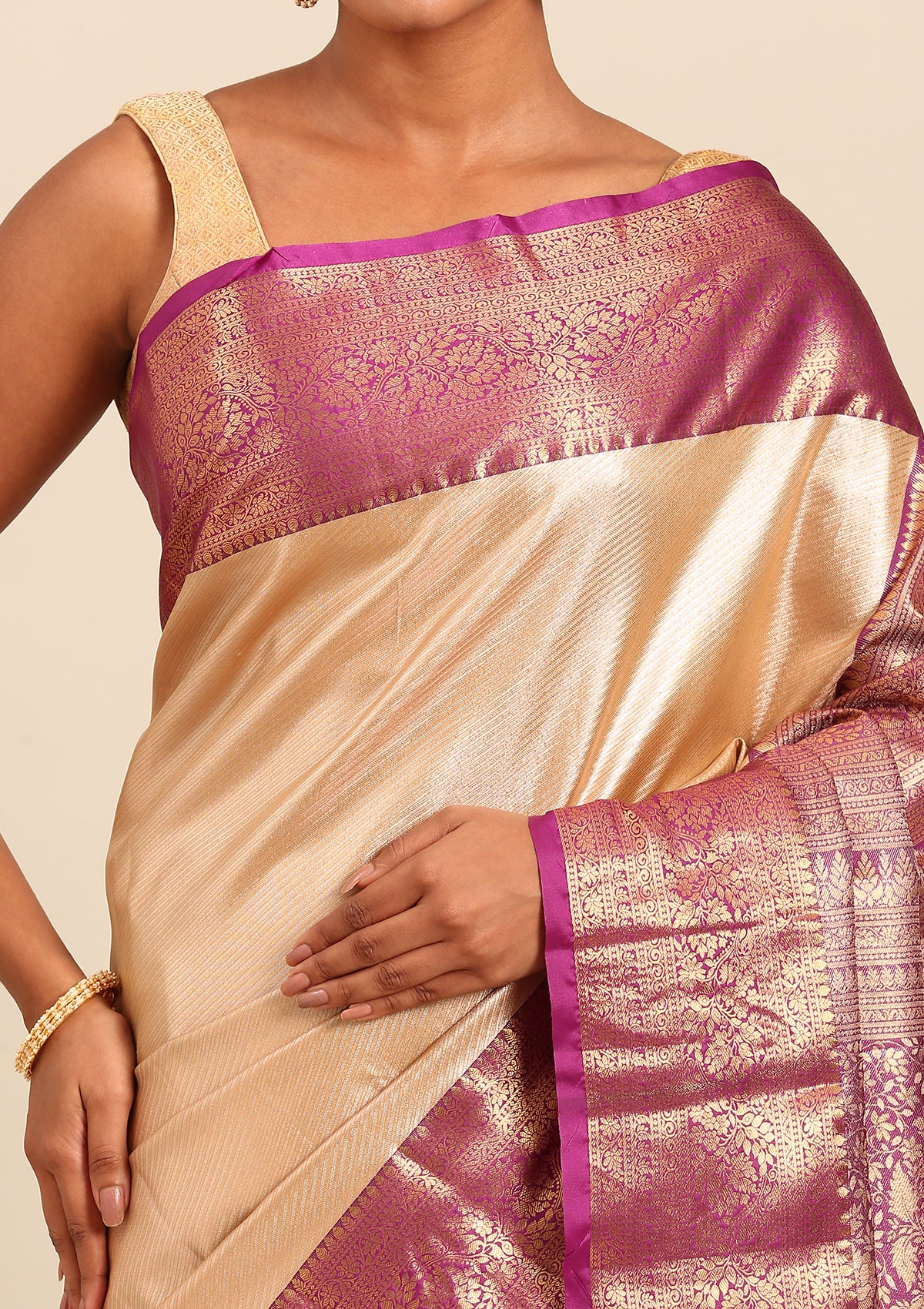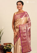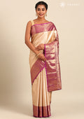 Exude timeless grace with the Light Gold and Purple Kanchipuram Saree, woven from premium polyester blended fabric that drapes elegantly and feels luxurious. This saree beautifully combines subtle light gold hues with rich purple accents for a sophisticated traditional look.