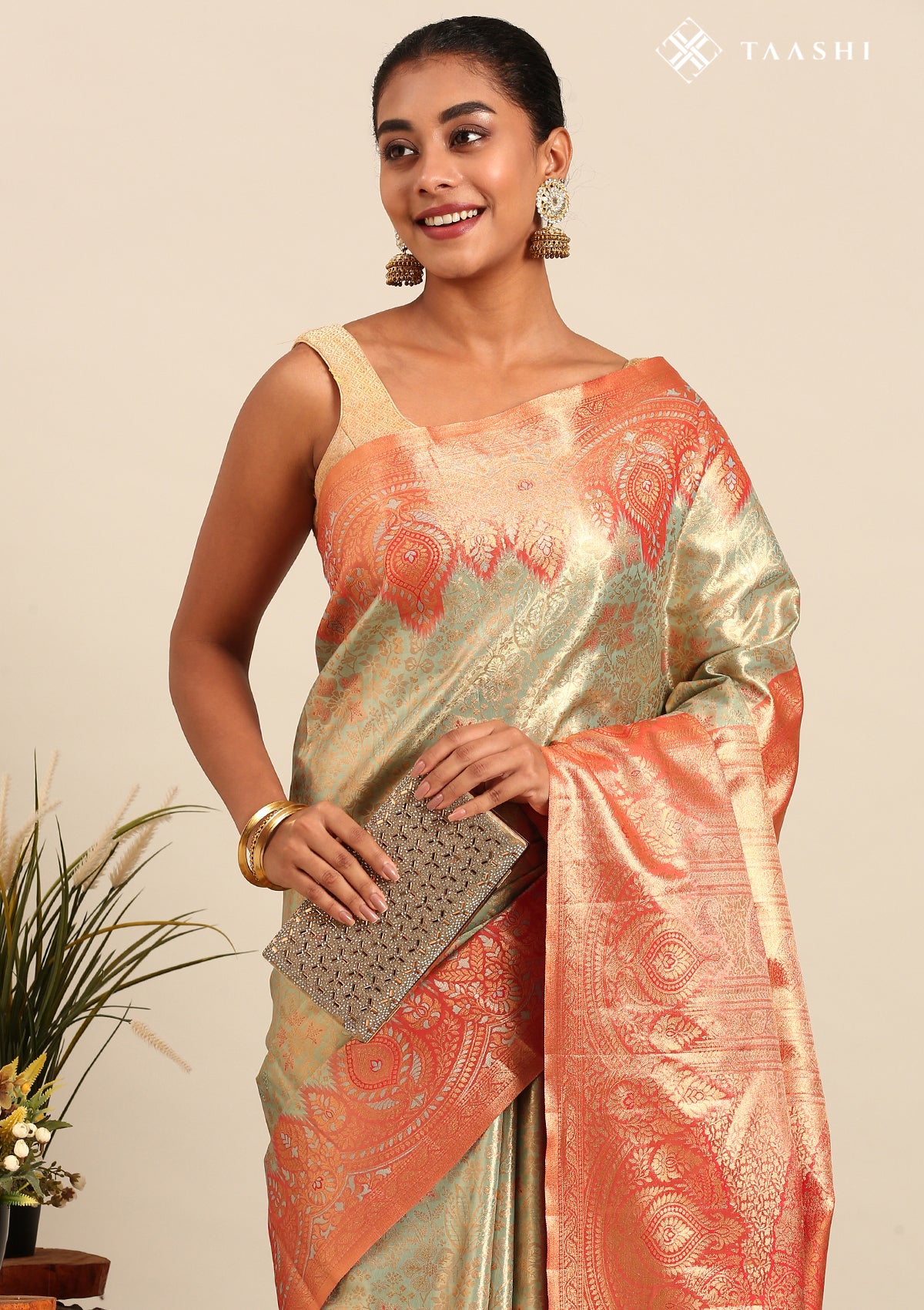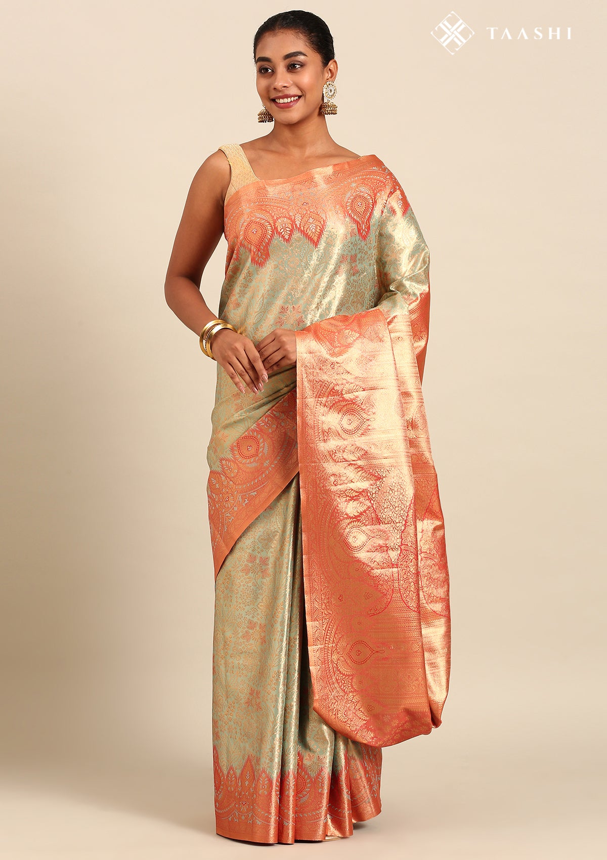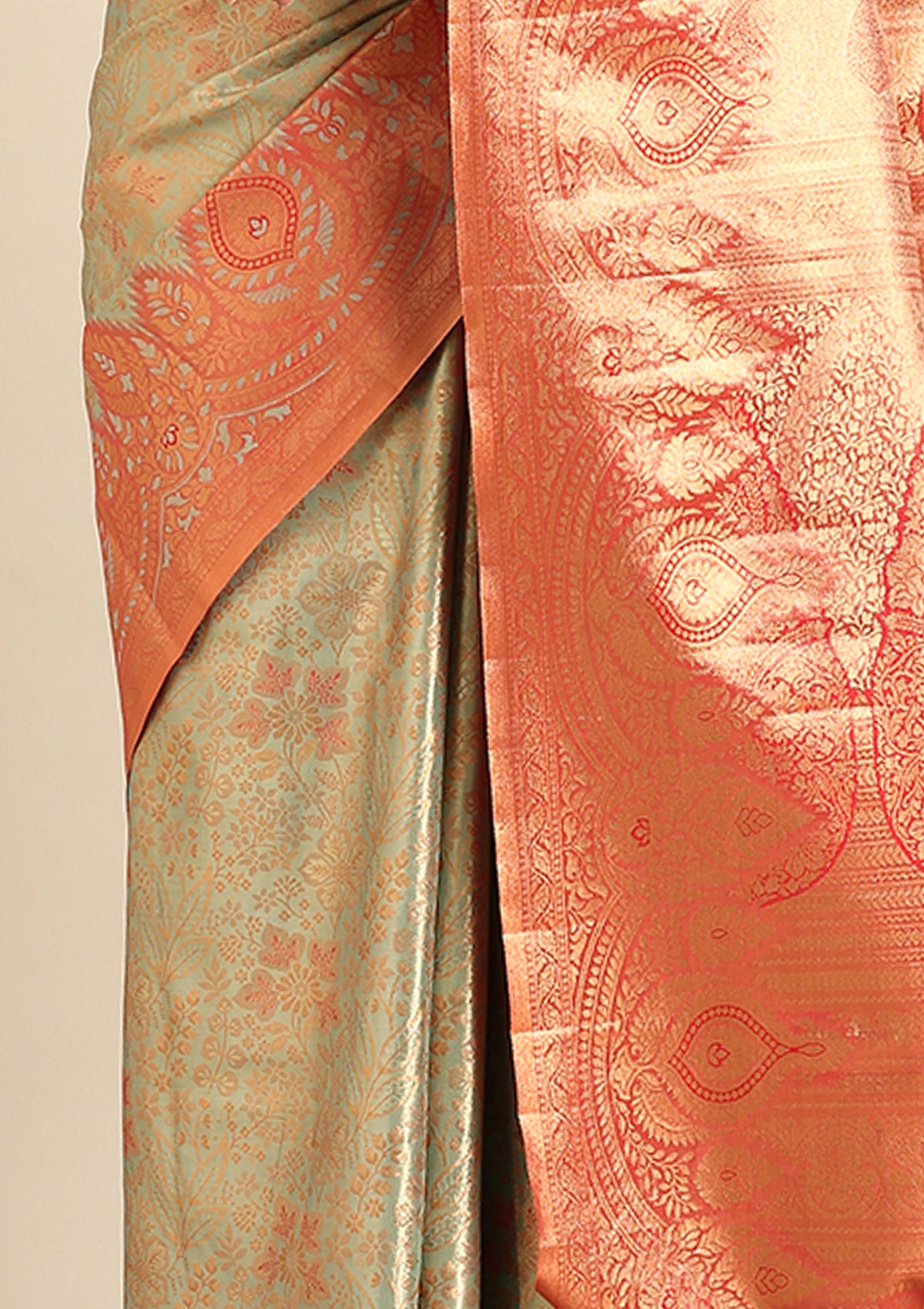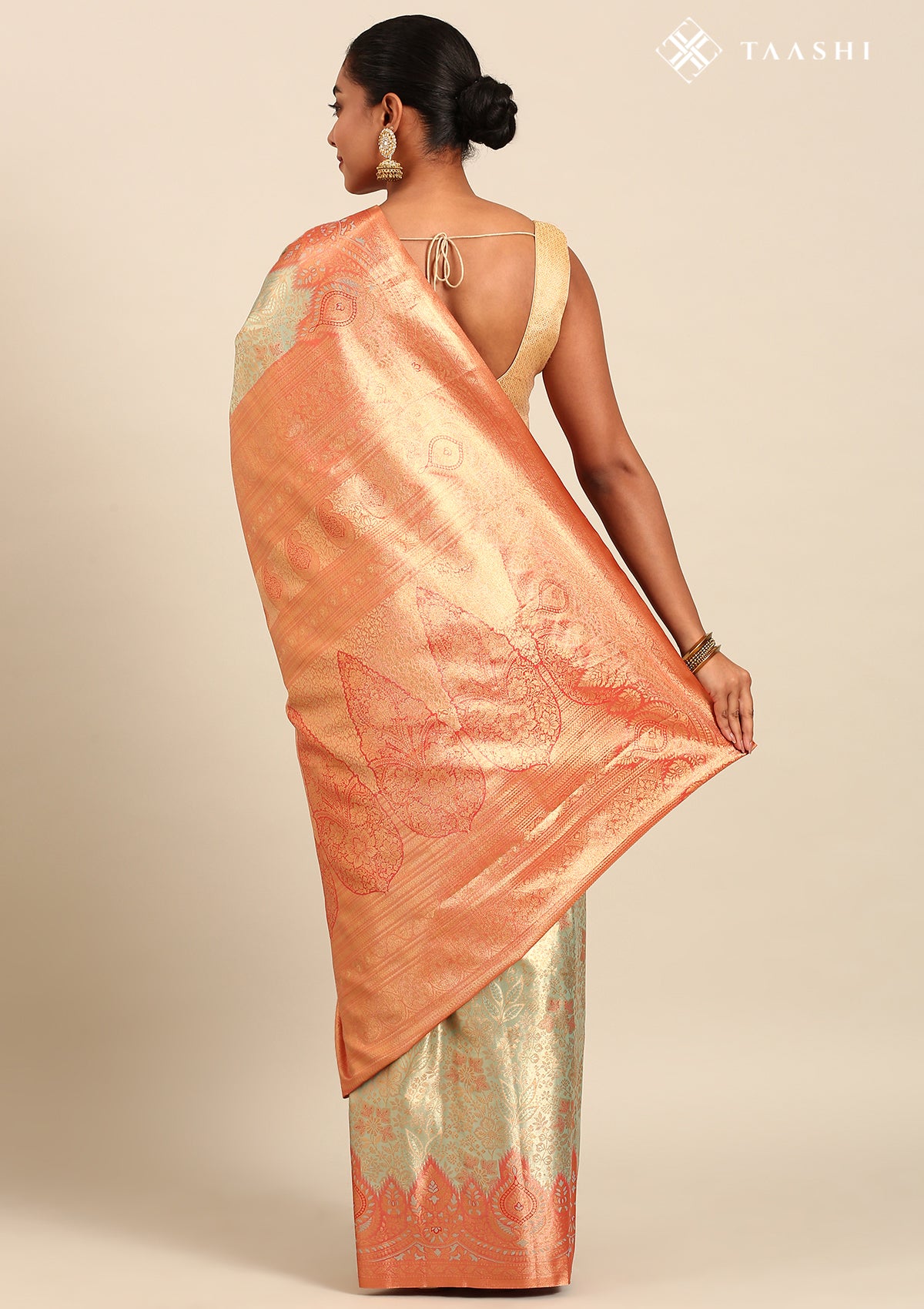 Turquoise and Orange Floral Pattern Tissue Brocade Kanchipuram Saree