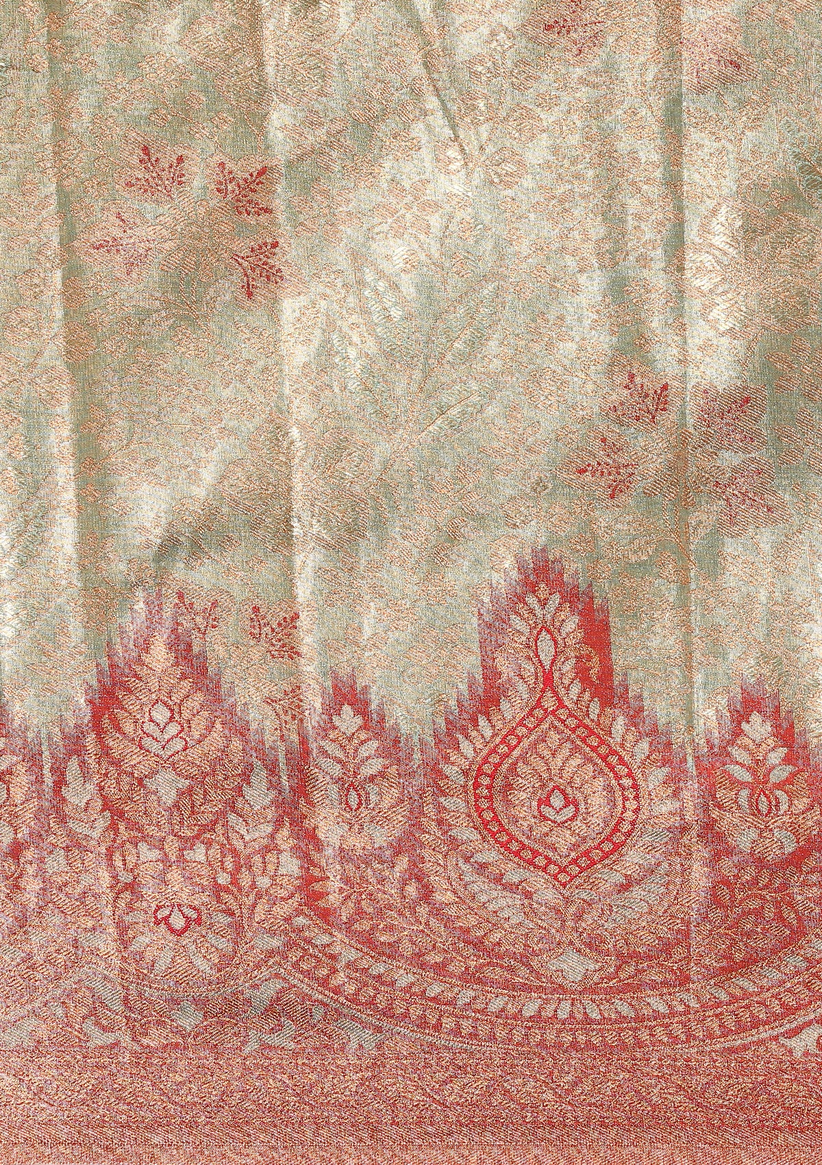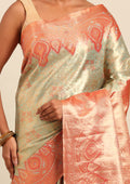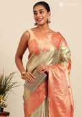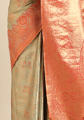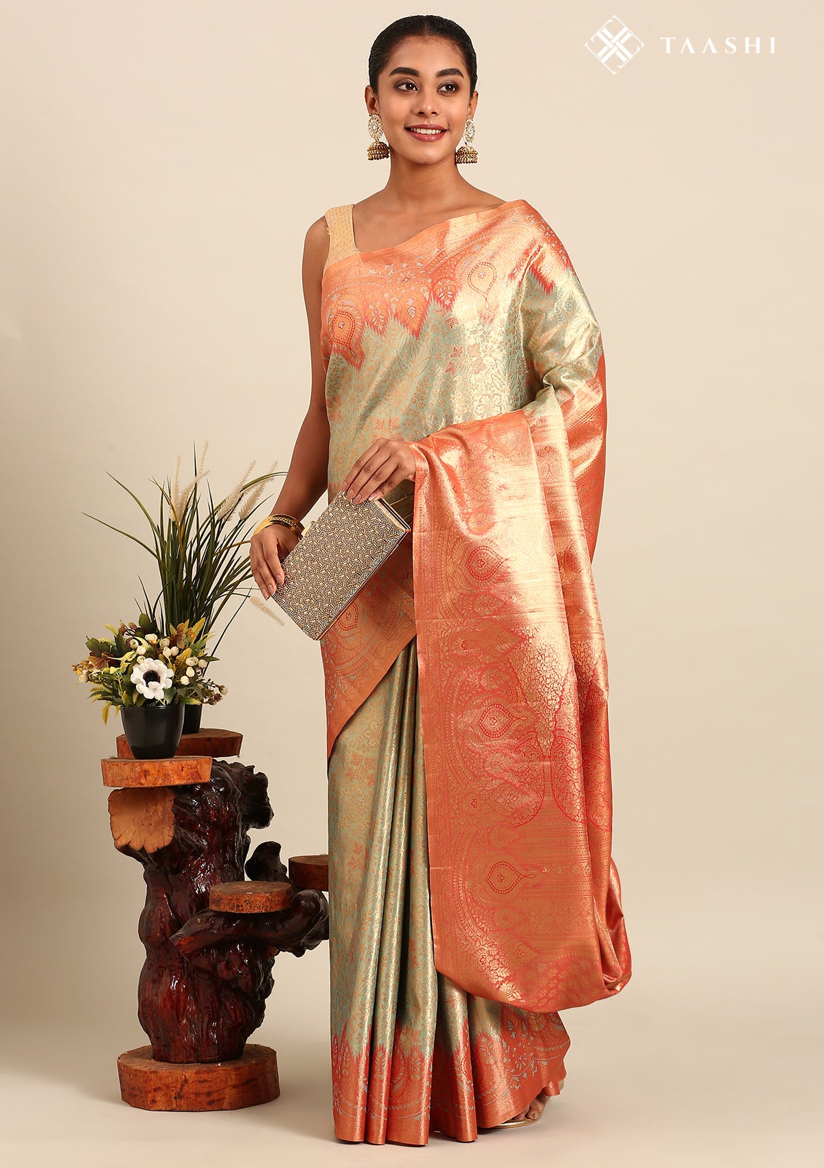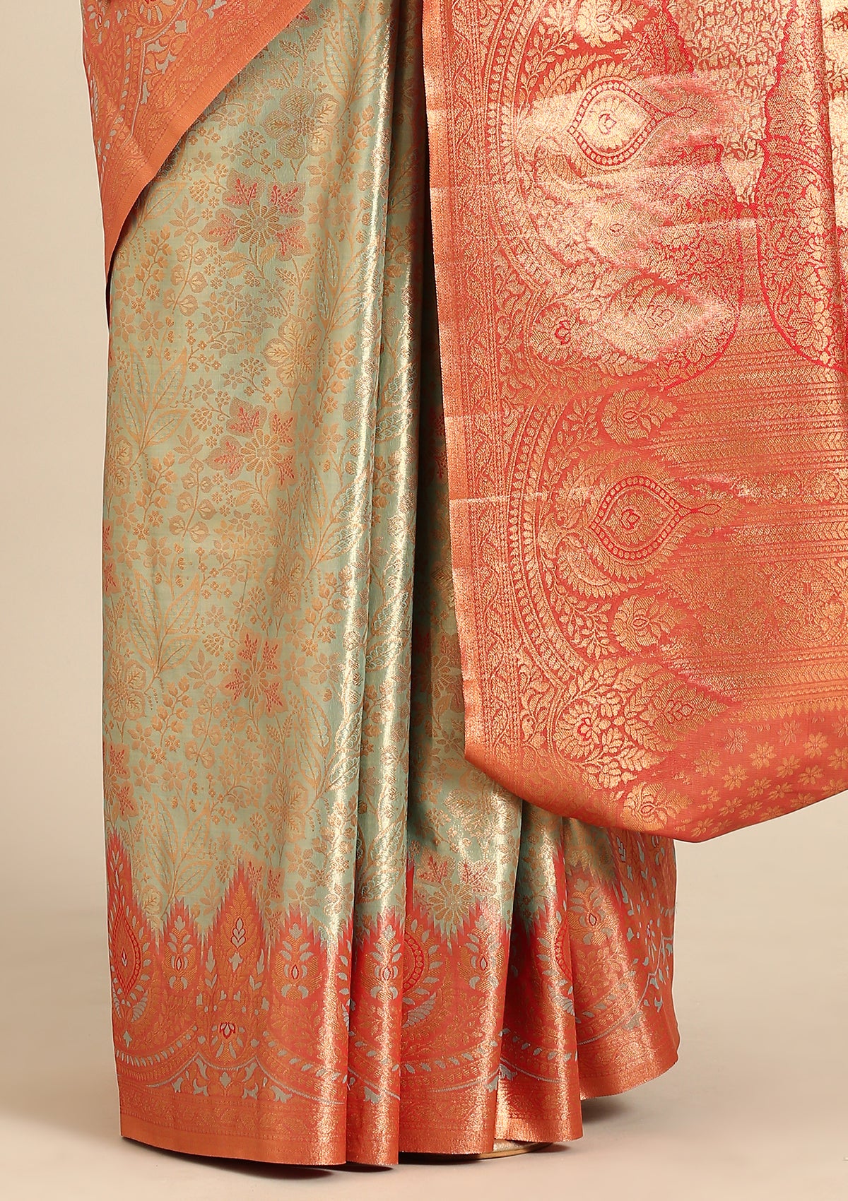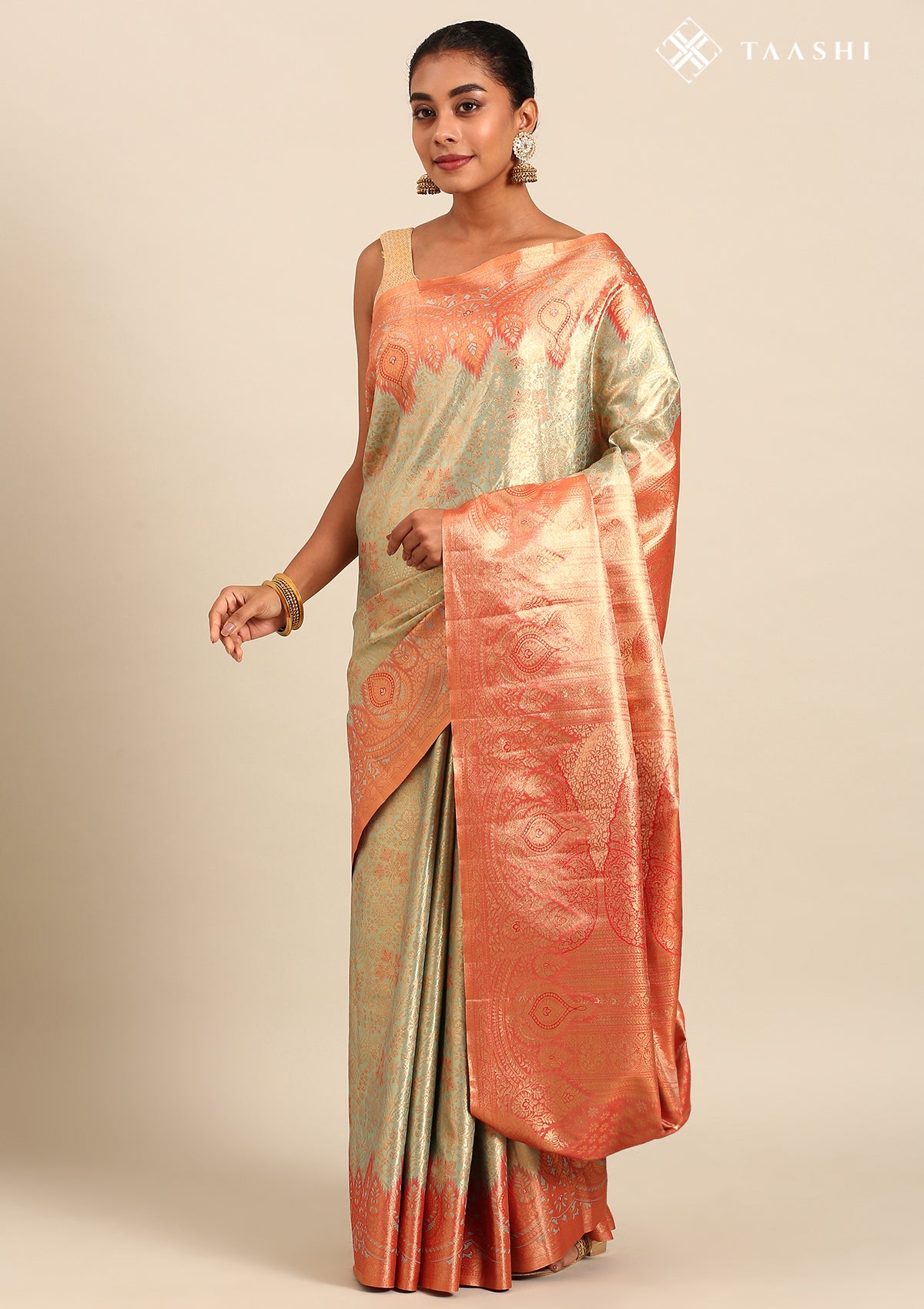 Turquoise and Orange Floral Pattern Tissue Brocade Kanchipuram Saree