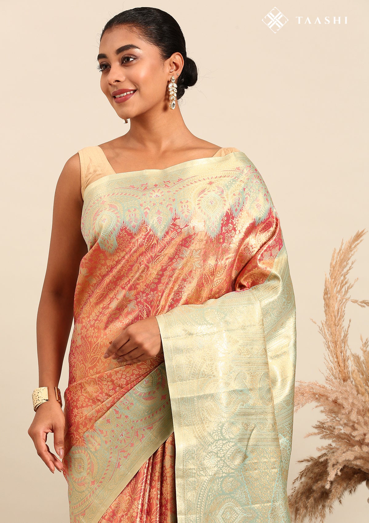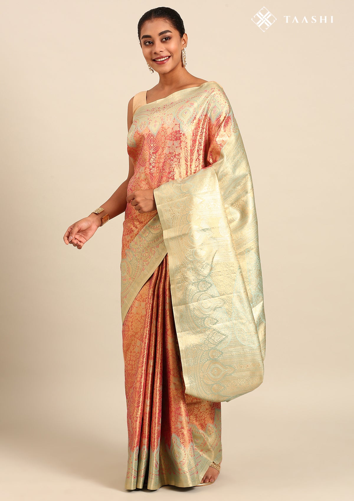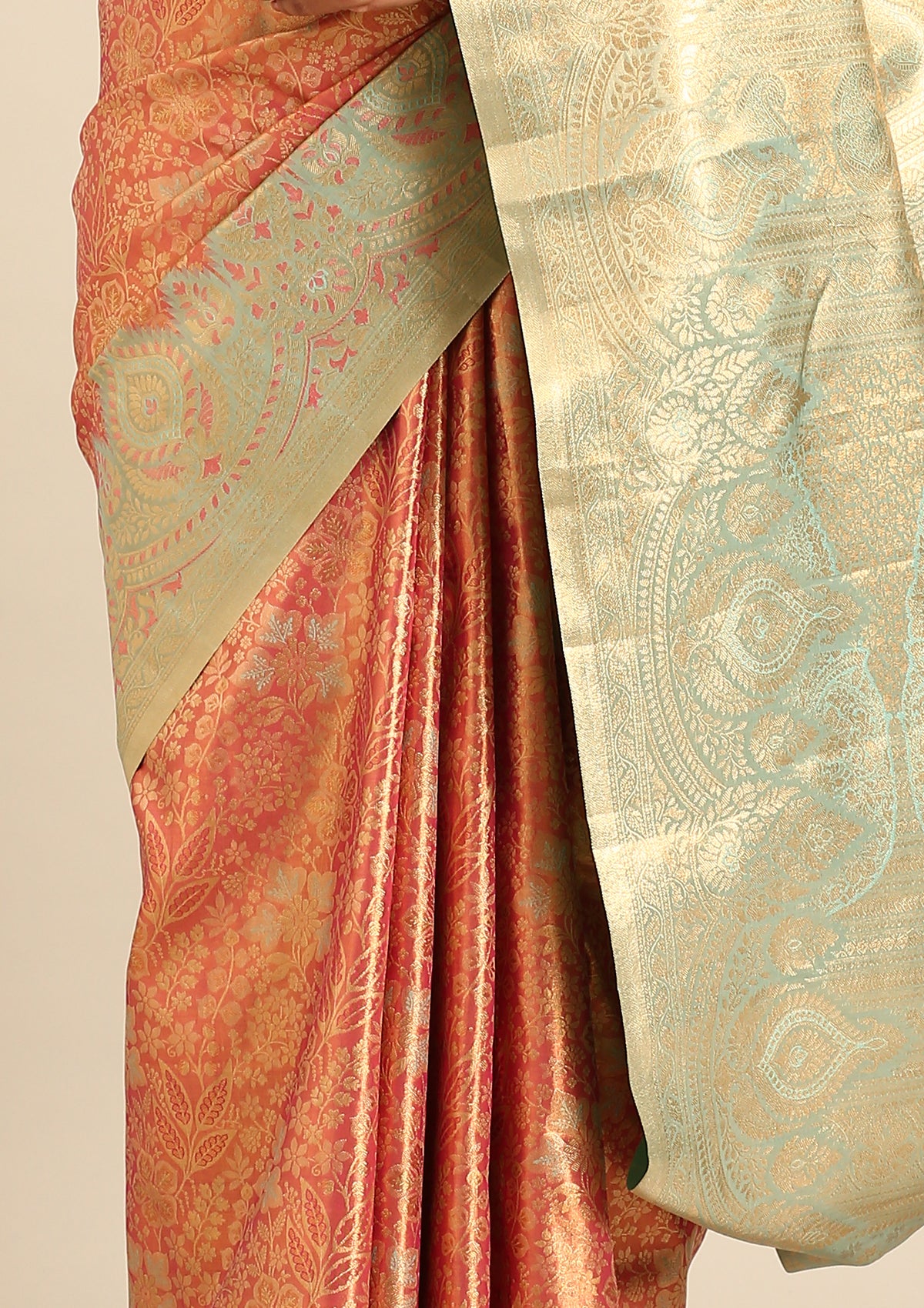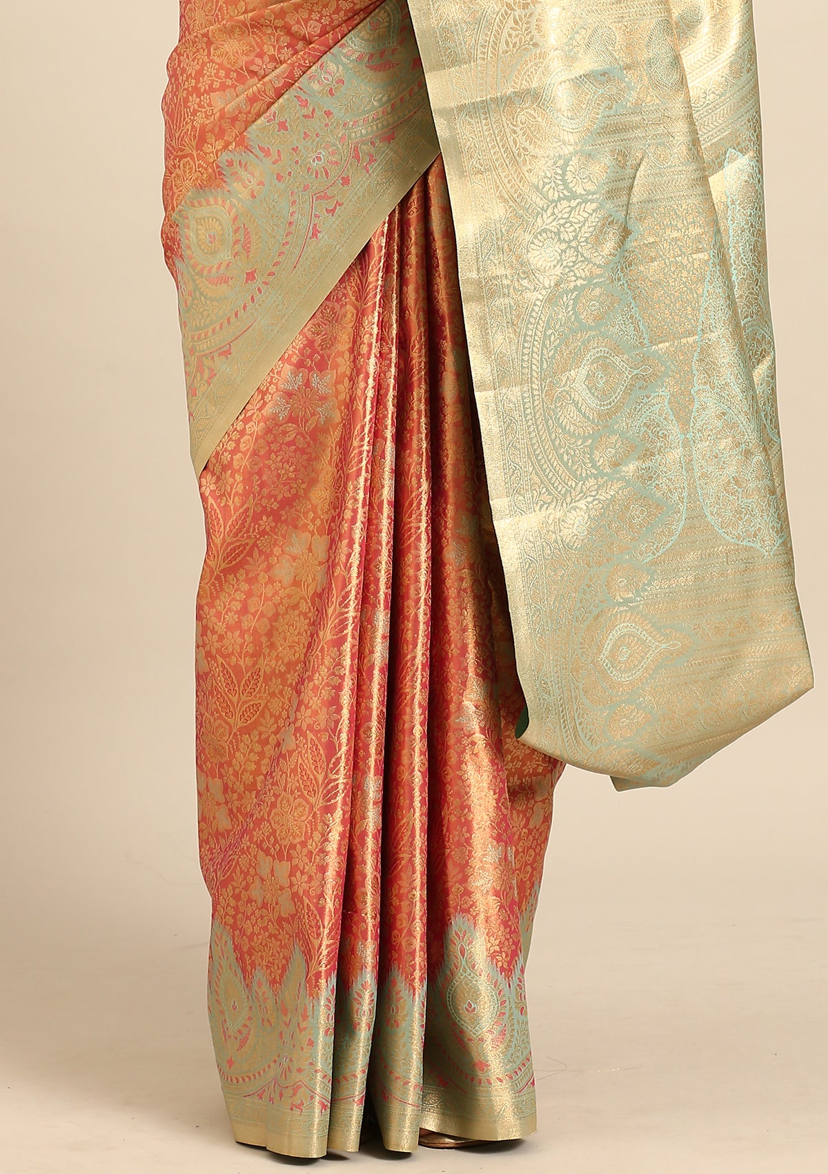 Turquoise and Orange Floral Pattern Tissue Brocade Kanchipuram Saree