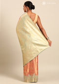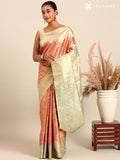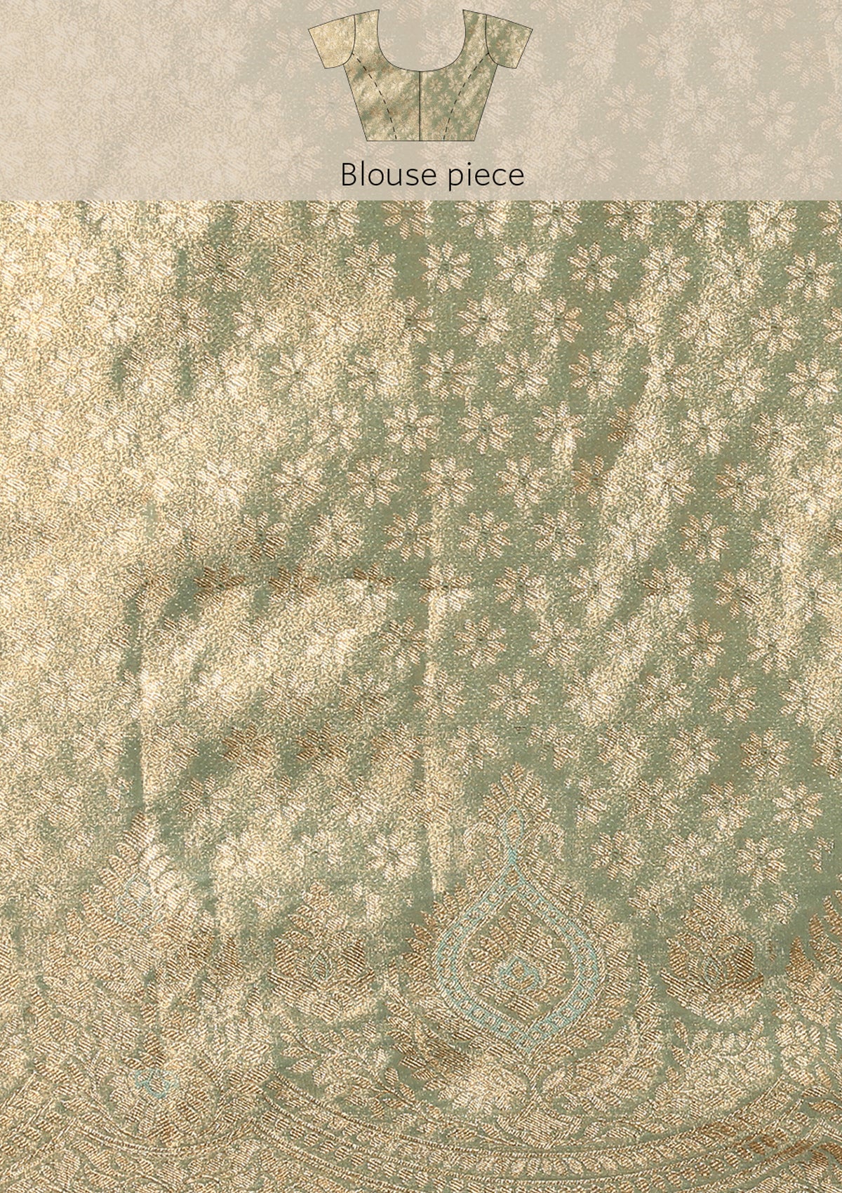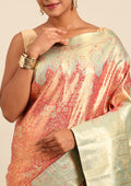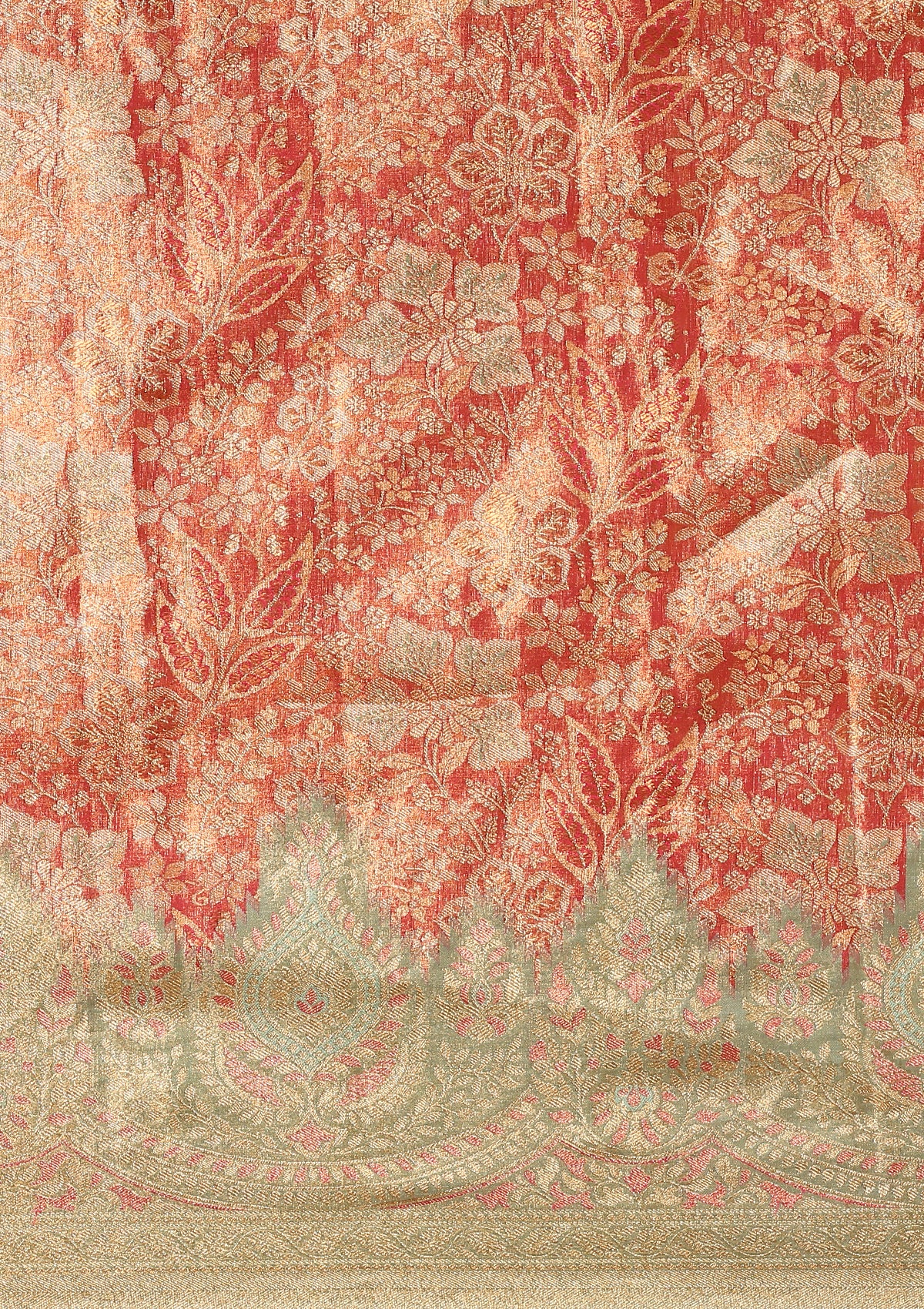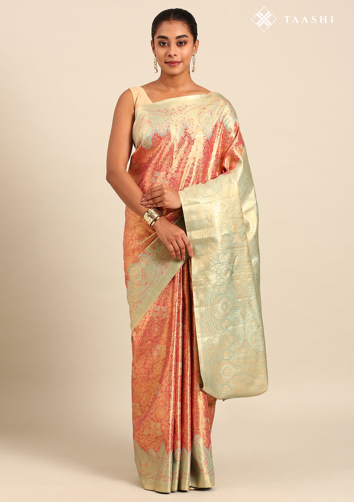 Turquoise and Orange Floral Pattern Tissue Brocade Kanchipuram Saree