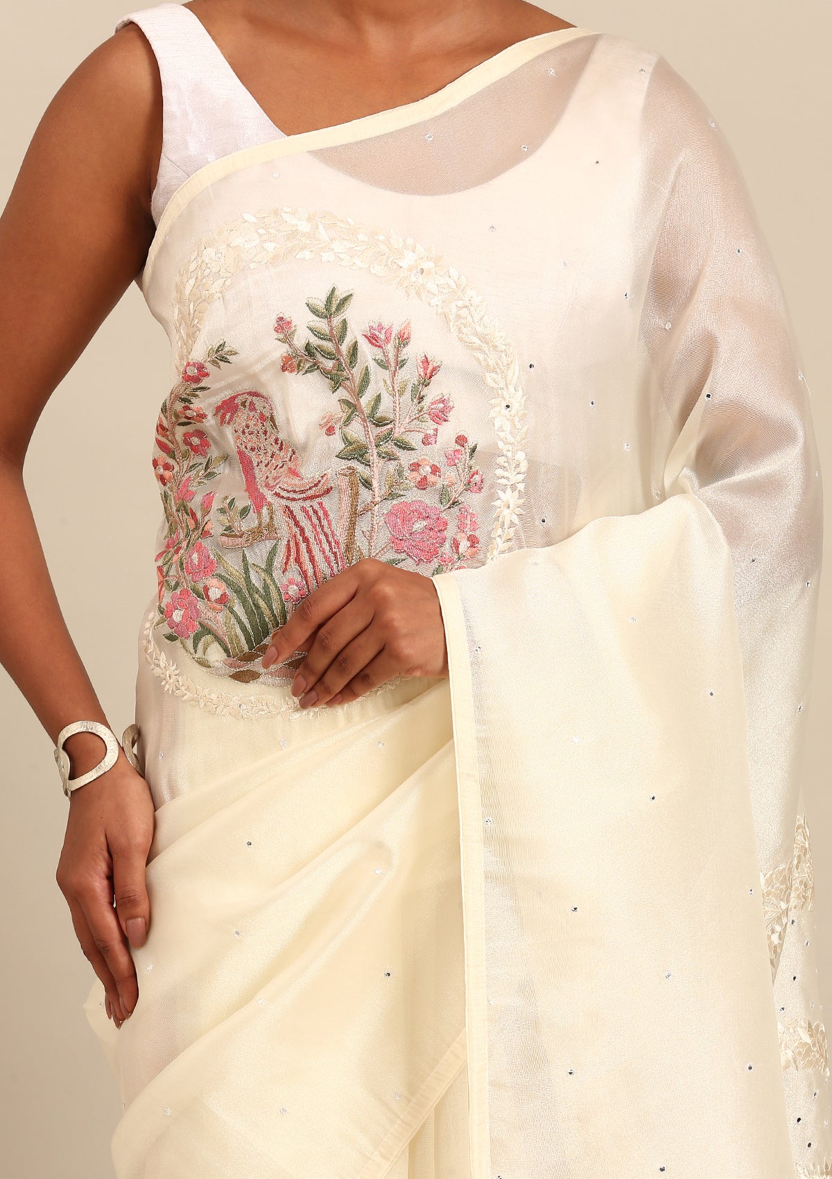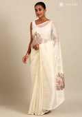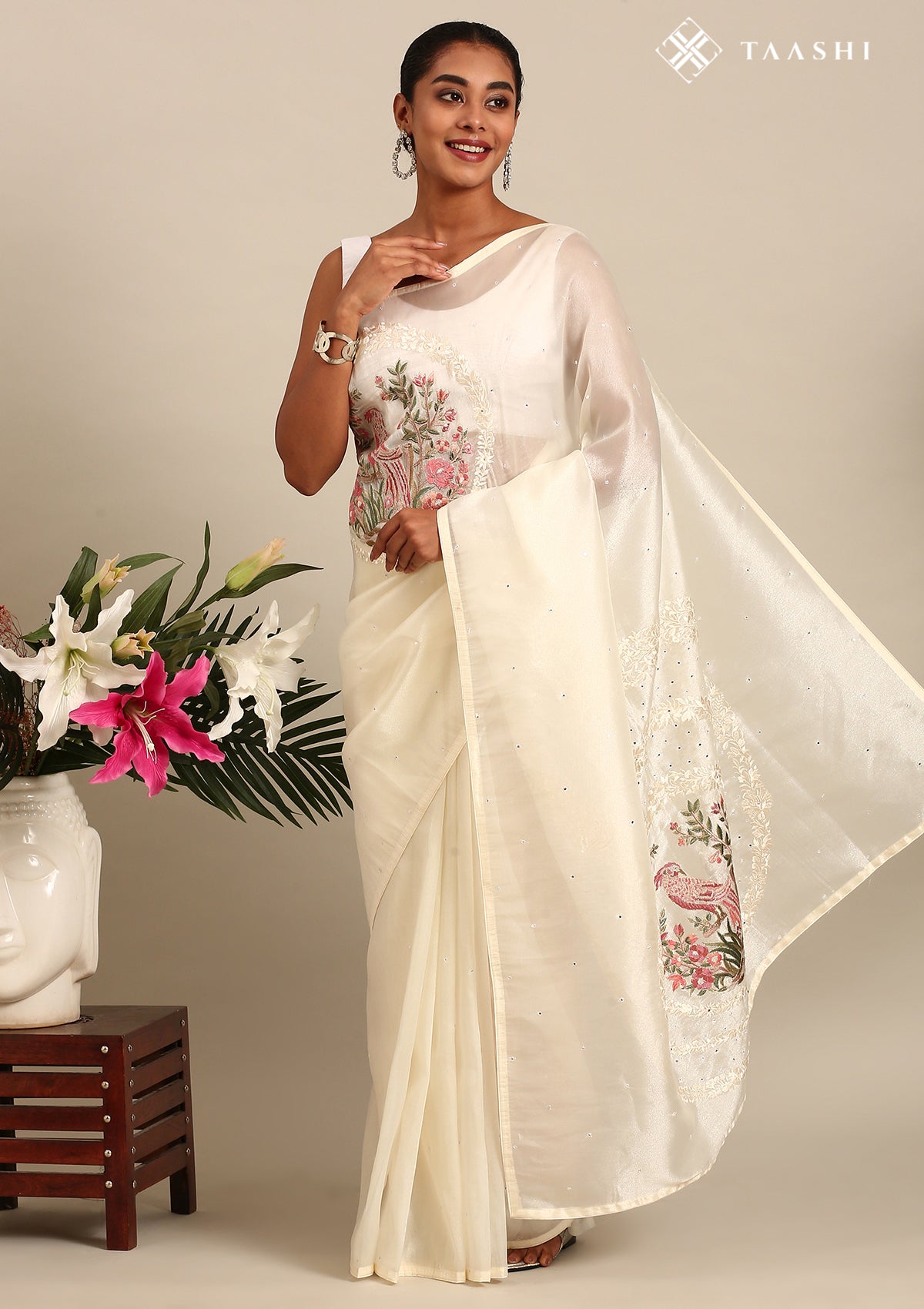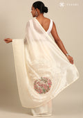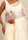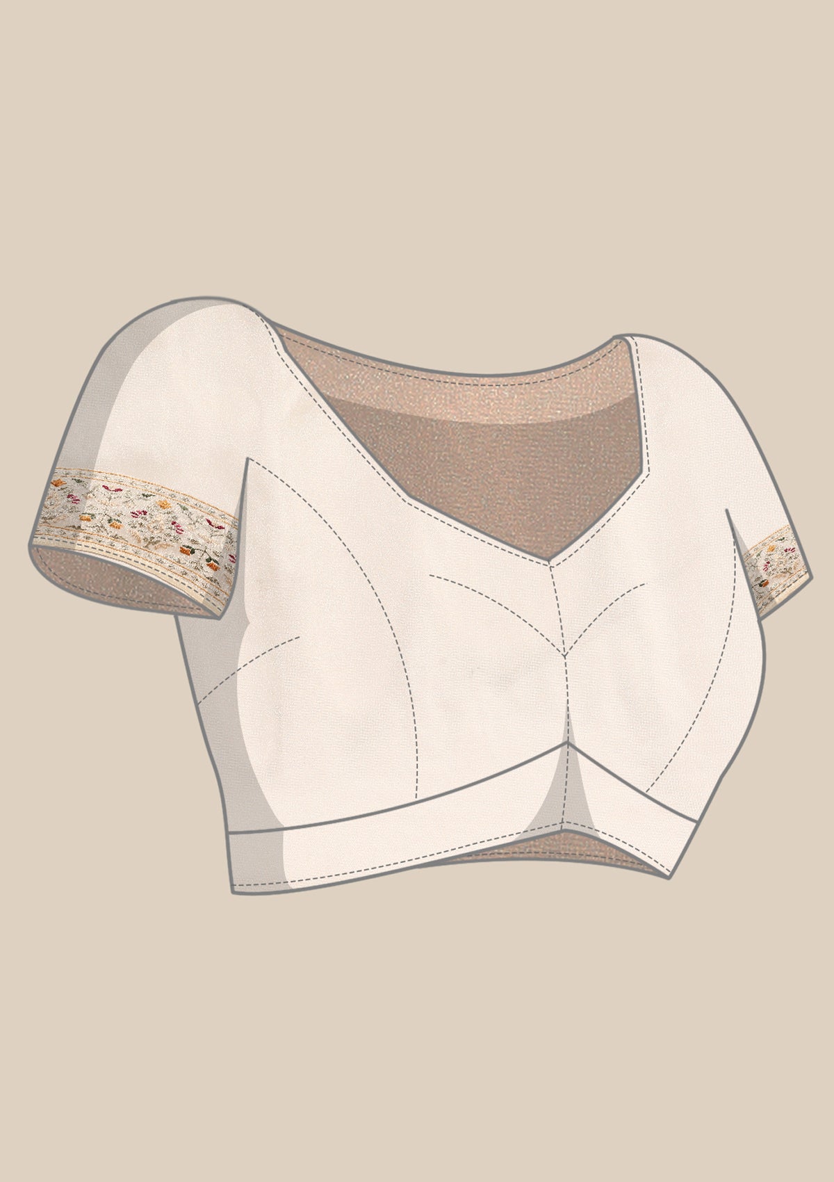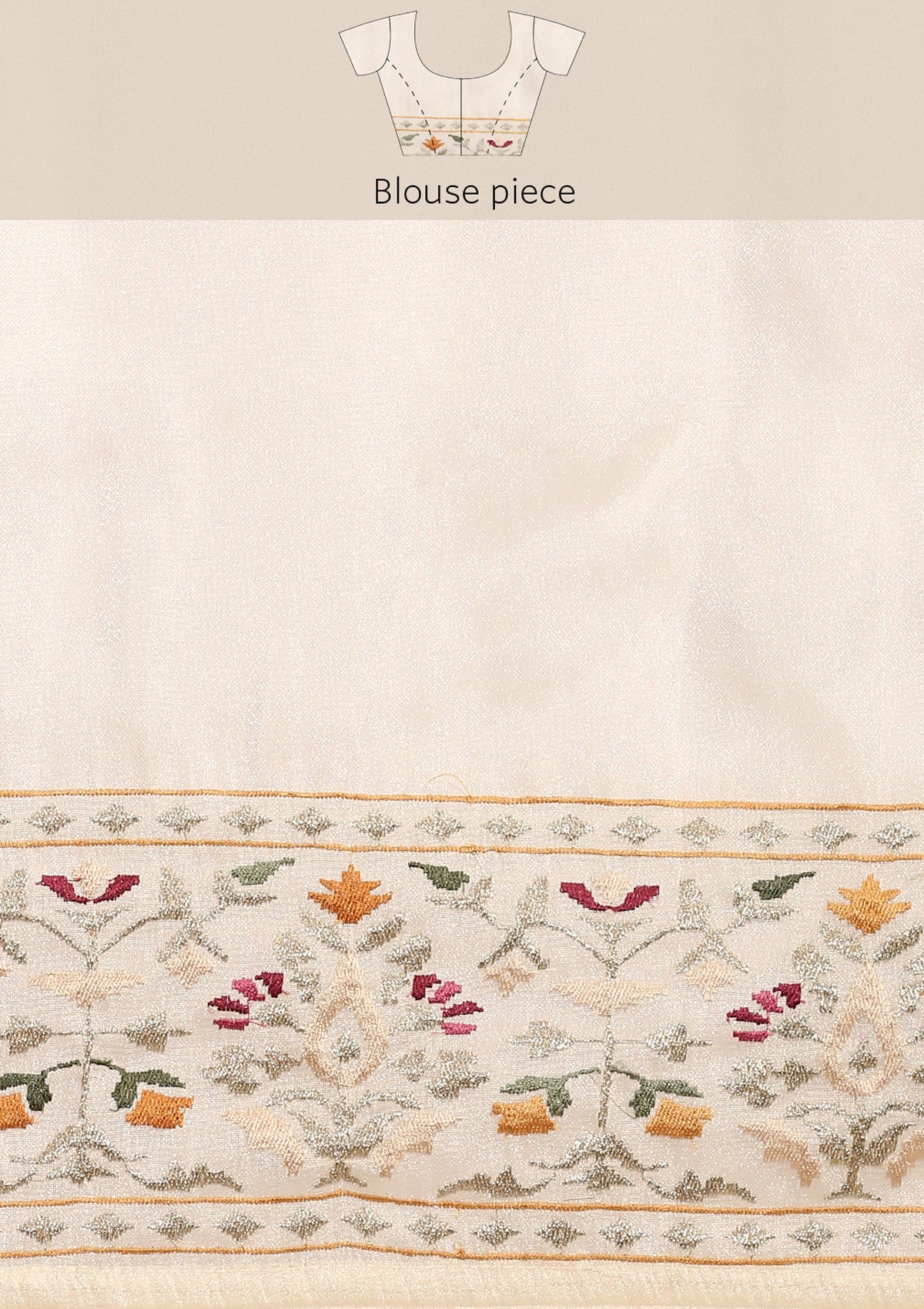 A richly designed pallu adorned with intricate jaal floral embroidery enhances the saree’s graceful and luxurious appeal.