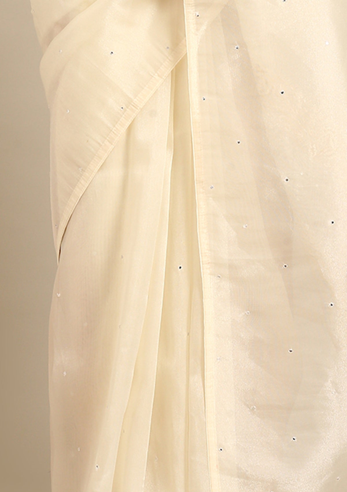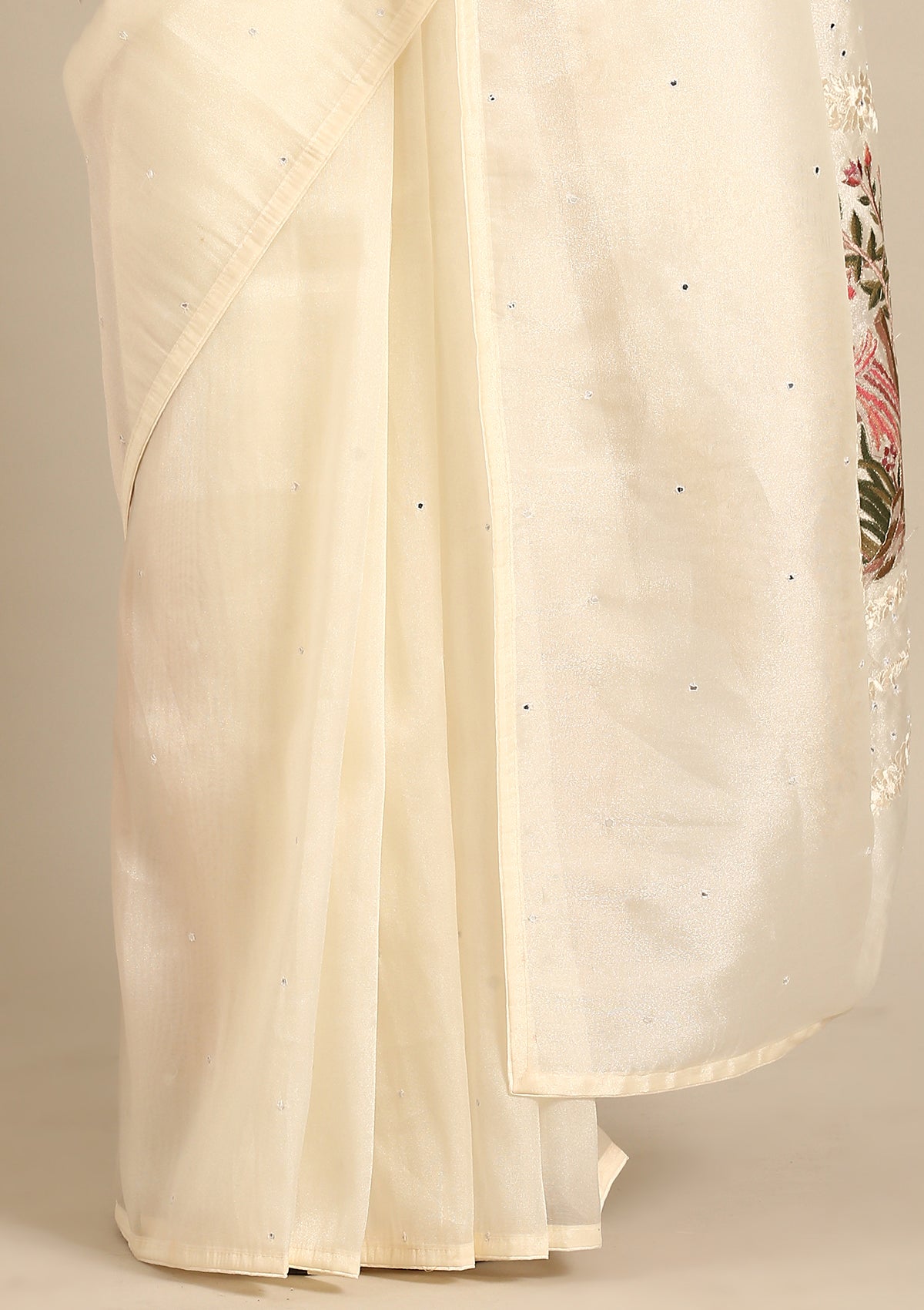 Draped in a soft pink hue, this polyester blended tissue saree beautifully combines traditional artistry with modern elegance.